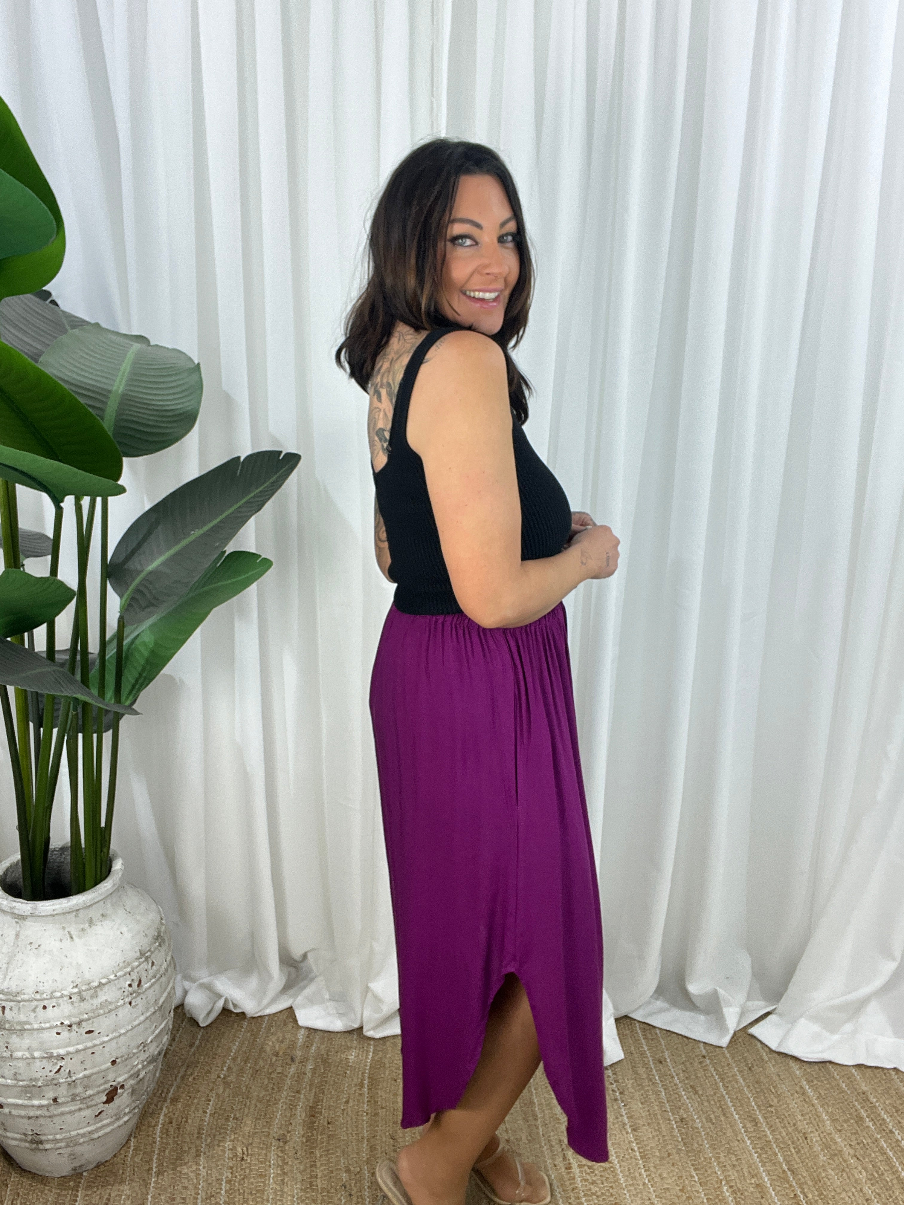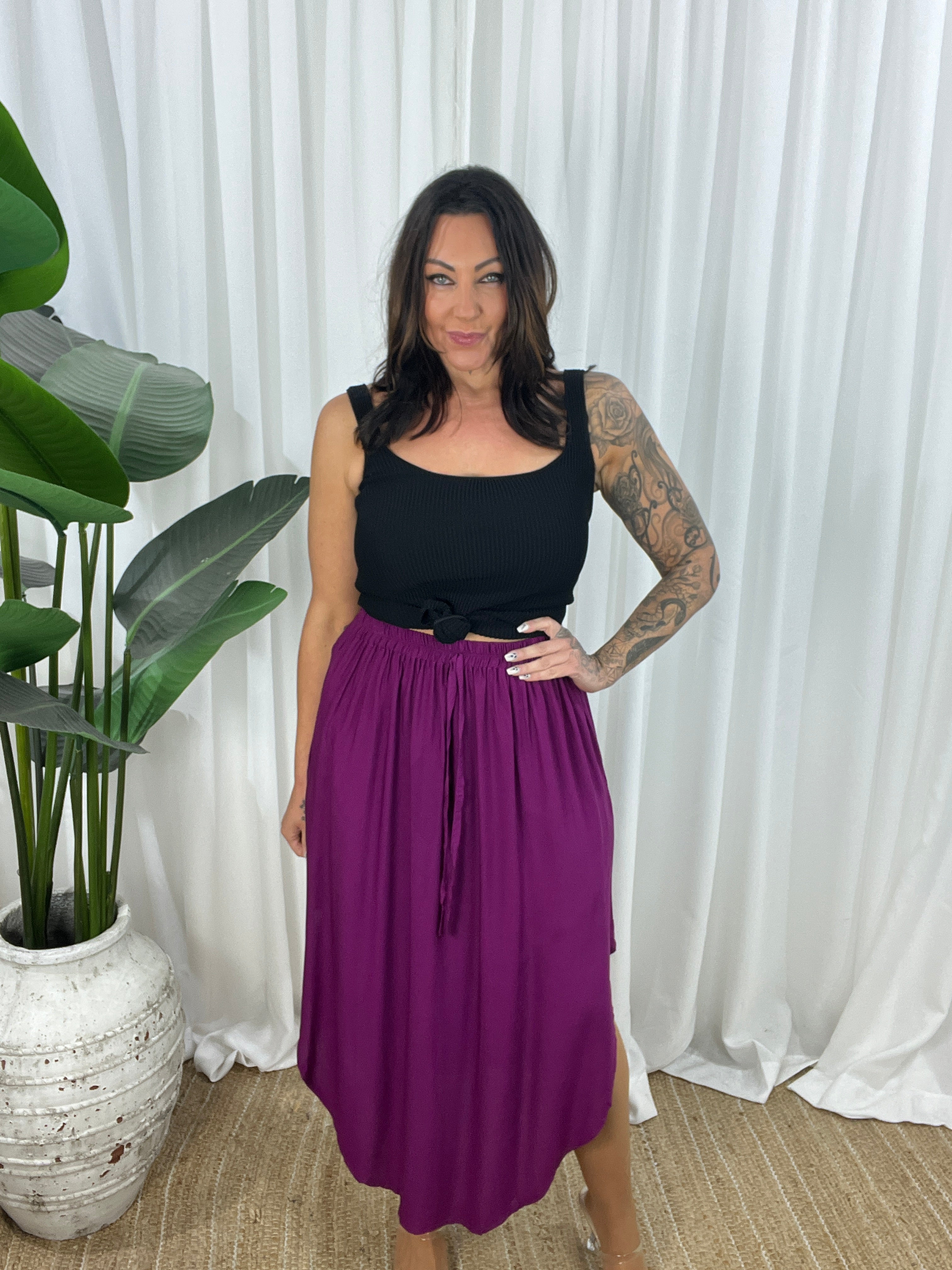 Our beautiful Gemma Skirts are a stunning addition to any wardrobe. These skirts feature a straight cut with a scooped hem and splits up each side, creating a flattering and stylish look. Lightweight and mid-length, the Gemma Skirt is designed for maximum comfort and versatility. Available in six gorgeous colorways—Black, Khaki, White, Pink, Navy, and Magenta—there's a perfect Gemma for every occasion.The Gemma Skirt is a versatile and stylish piece that transitions seamlessly between seasons and occasions. Embrace its timeless design and create effortlessly chic outfits all year round.