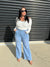 Our new Kenna jeans are a hot to trot on trend wide leg pant, these cool jeans are slightly fitted through the leg and fan out into a wide leg which has that cool 70's vibe. Stretchy with a high rise fit. Cool slanted large pockets, exposed stitching and detailed raised stiching down the front of leg to draw the eye down and help seem streamline the figure.