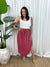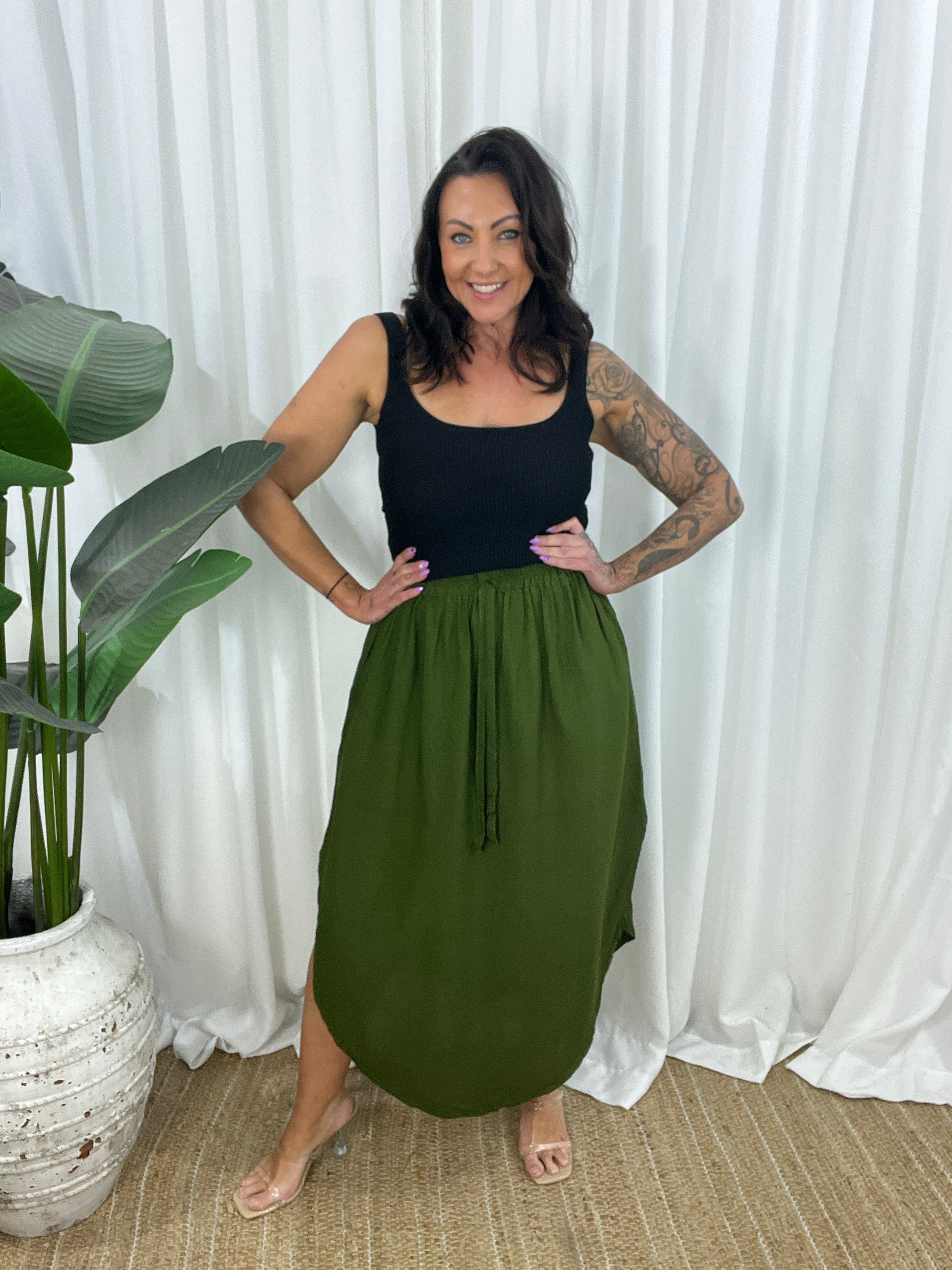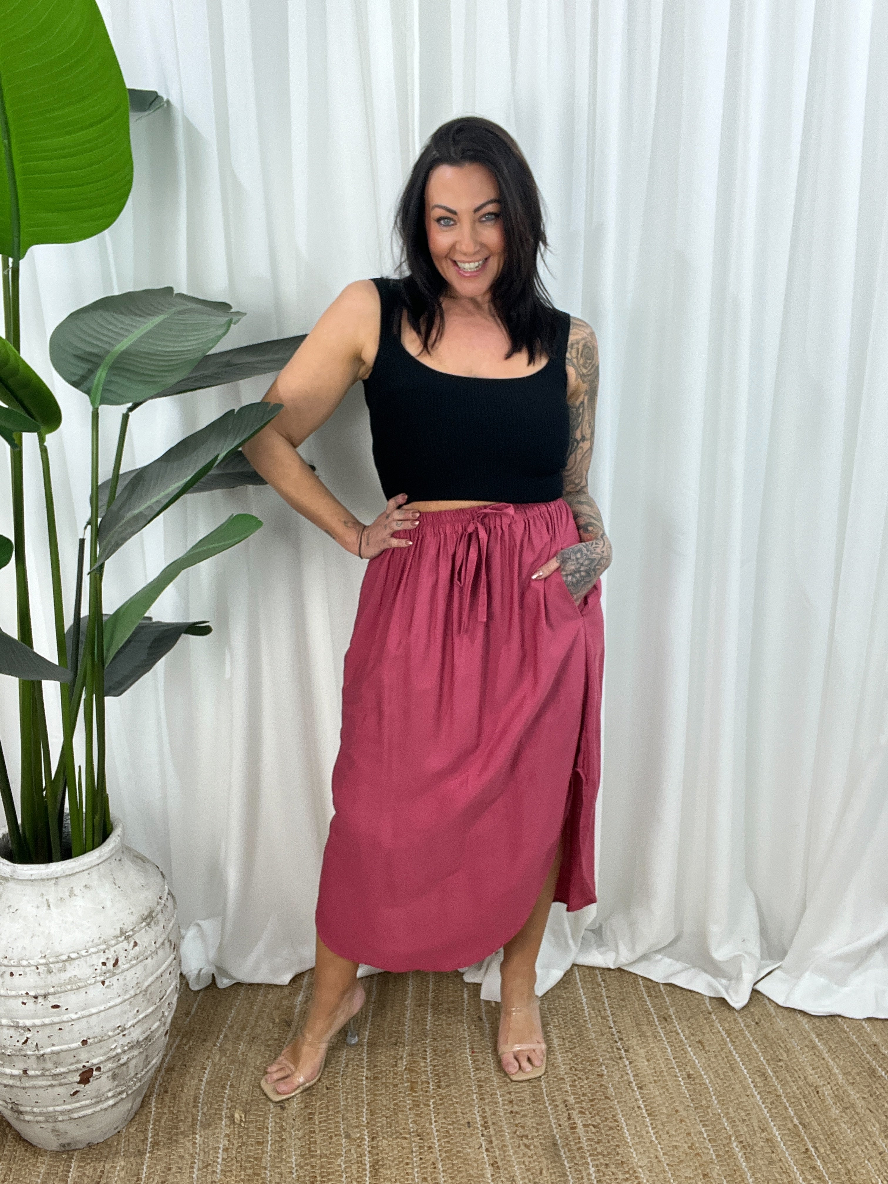 Our beautiful Gemma Skirts are a stunning addition to any wardrobe. These skirts feature a straight cut with a scooped hem and splits up each side, creating a flattering and stylish look. Lightweight and mid-length, the Gemma Skirt is designed for maximum comfort and versatility. Available in six gorgeous colorways—Black, Khaki, White, Pink, Navy, and Magenta—there's a perfect Gemma for every occasion.The Gemma Skirt is a versatile and stylish piece that transitions seamlessly between seasons and occasions. Embrace its timeless design and create effortlessly chic outfits all year round.