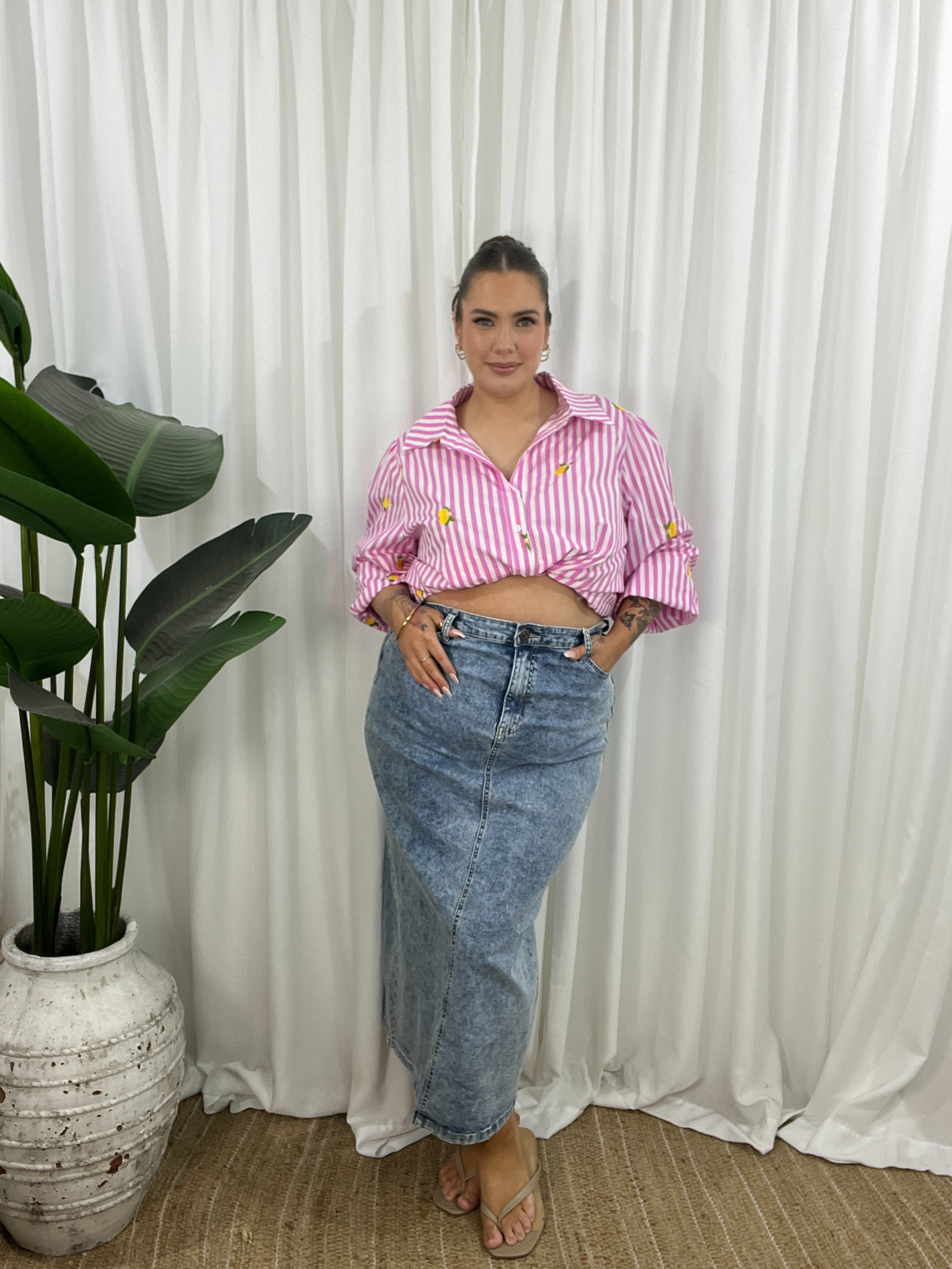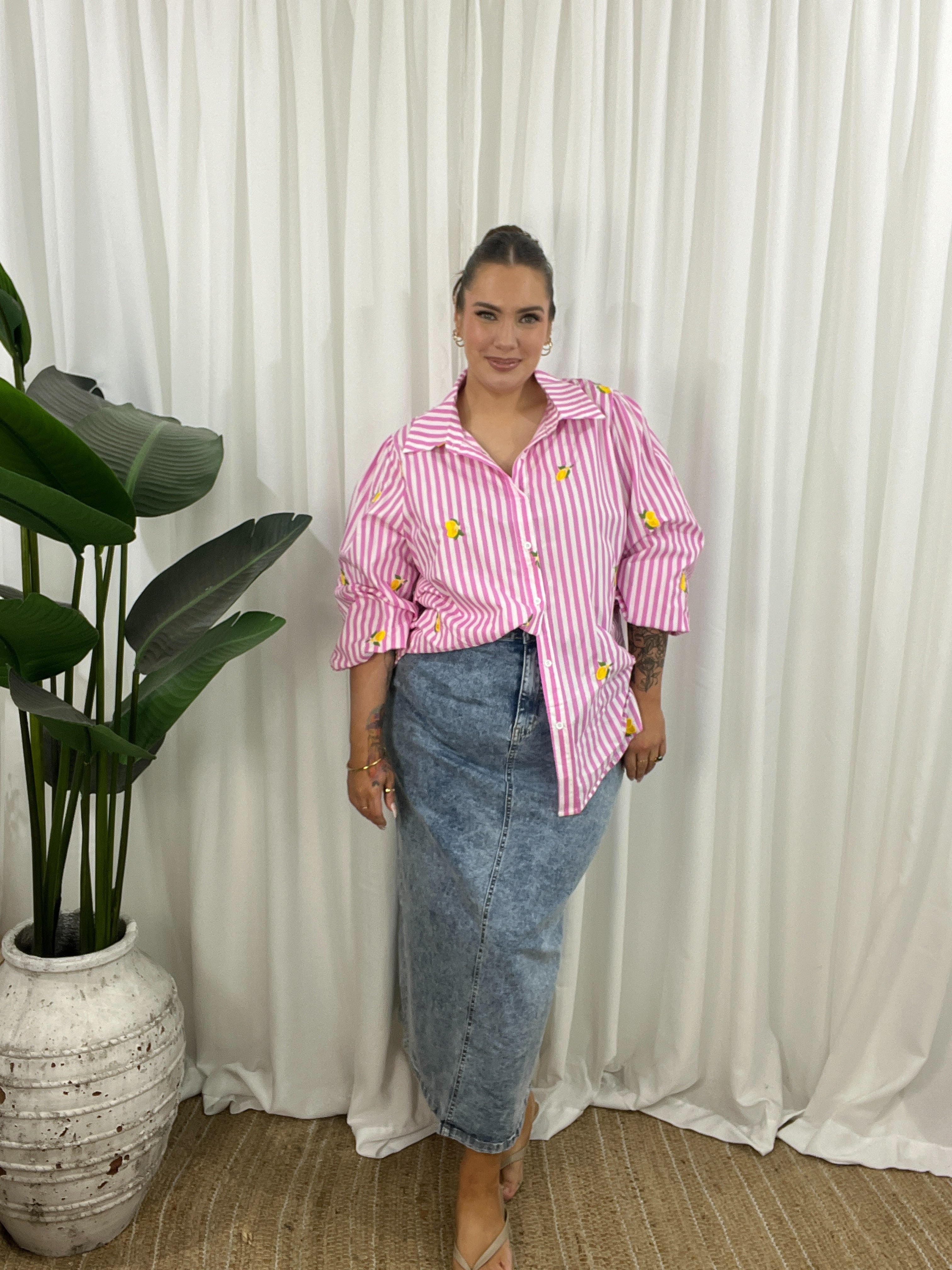 Fresh, playful, and full of charm—the Rhodes Shirt is your instant mood-lifter. Crisp white and pink stripes set the stage for a scattering of embroidered lemons, adding a zesty twist to this classic silhouette. Made for sunny days and spontaneous outings, it’s a shirt that doesn’t take itself too seriously.