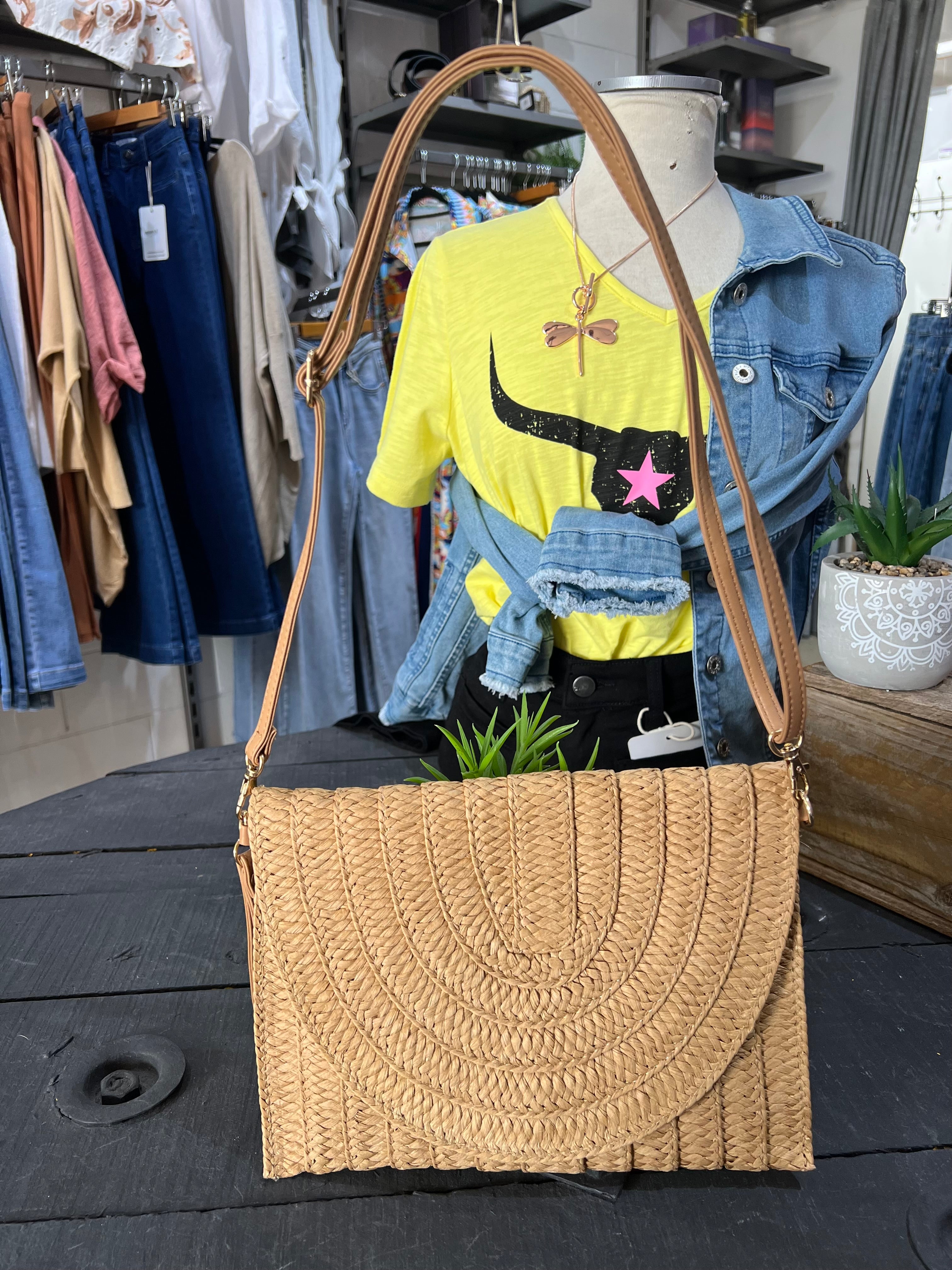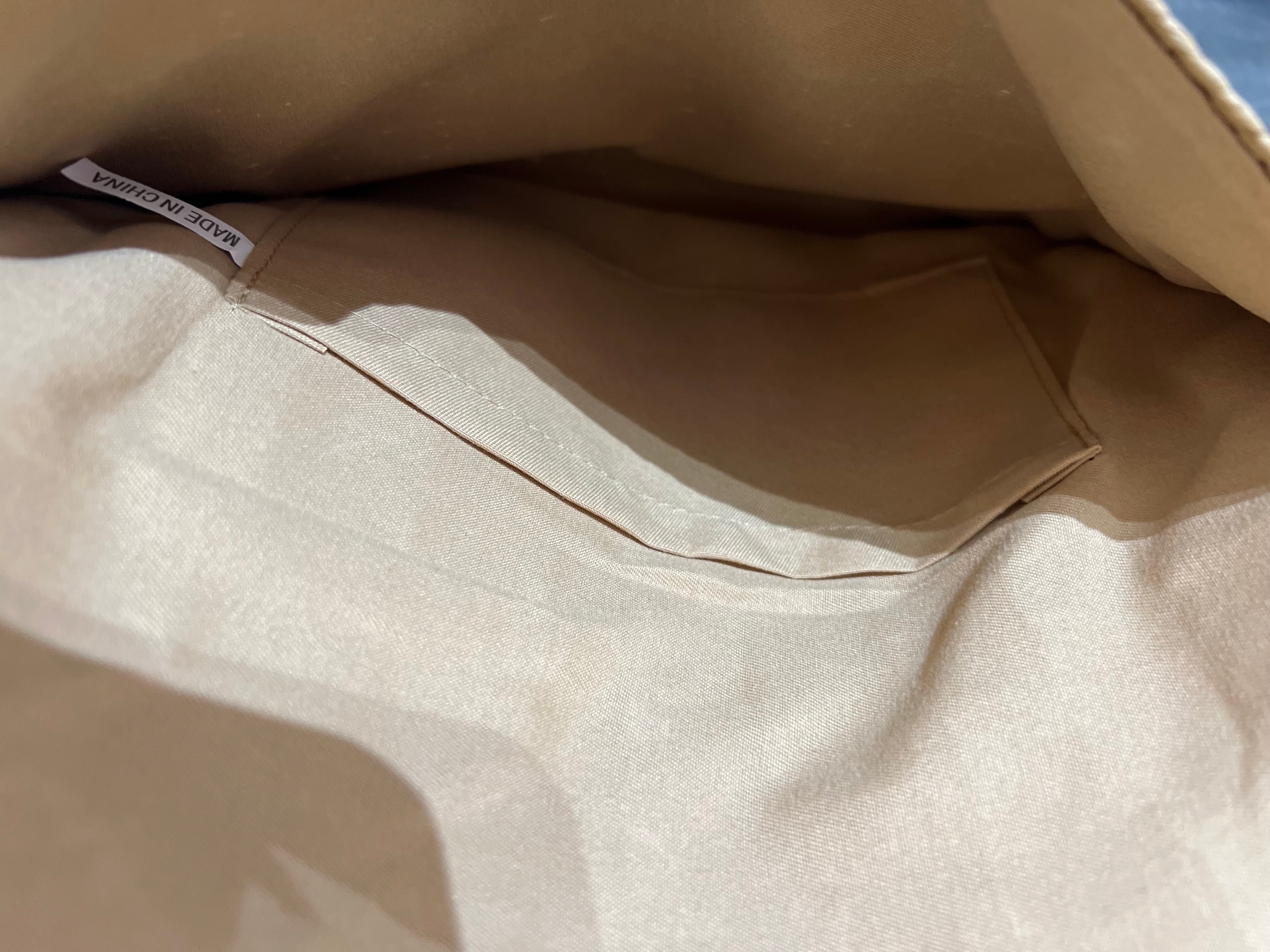 - Design: Flap Closure with metal button closure, Pocket detail in the lined interior.