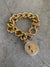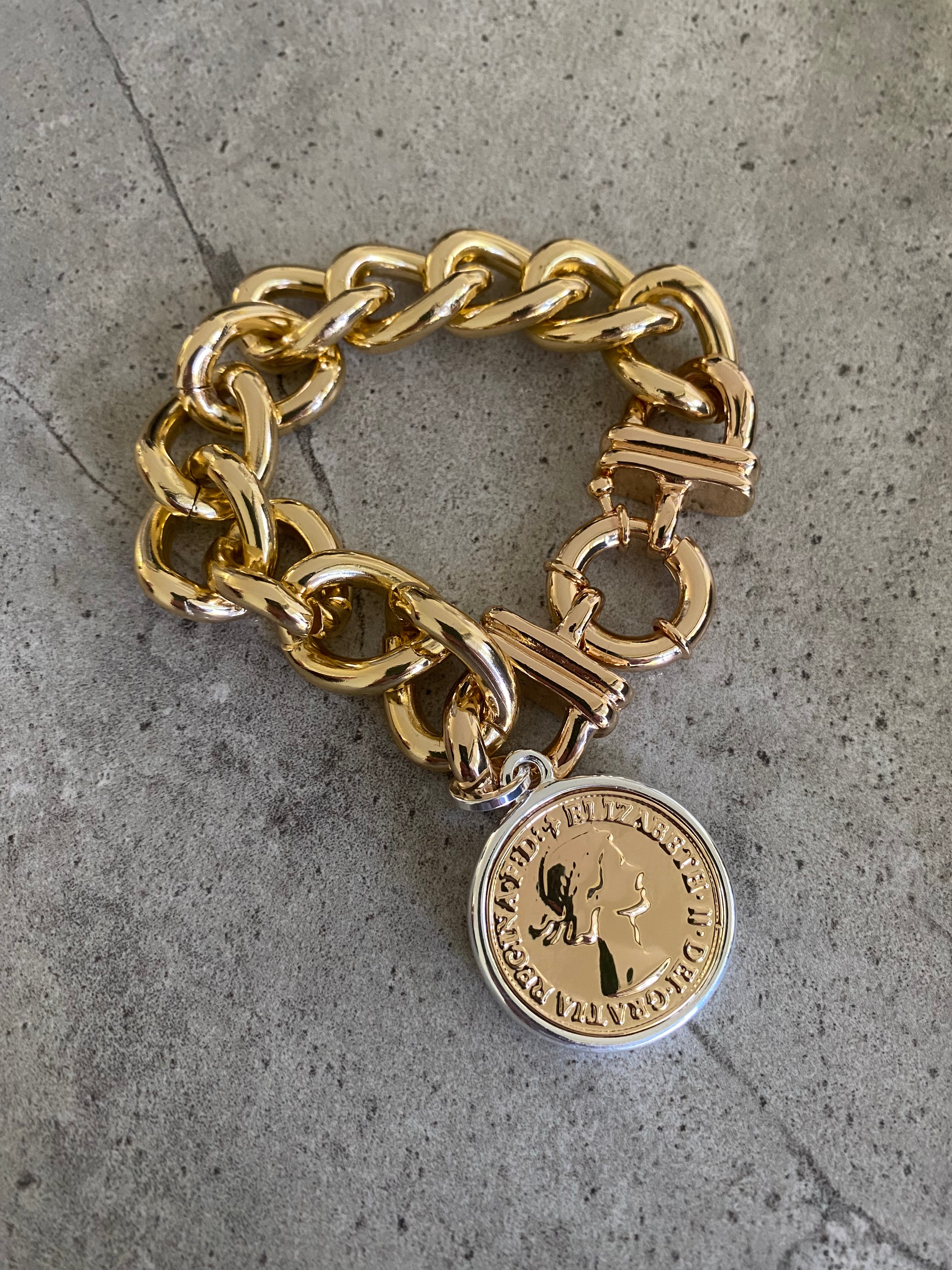 The Penny coin Bracelet is a stylish and elegant accessory, perfect for adding a touch of sophistication to your outfit. This chunky chain bracelet features a ring closure, ensuring a secure and fashionable fit. The bracelet is adorned with a chunky gold coin charm with silver border.