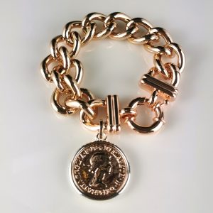 The Penny coin Bracelet is a stylish and elegant accessory, perfect for adding a touch of sophistication to your outfit. This chunky chain bracelet features a ring closure, ensuring a secure and fashionable fit. The bracelet is adorned with a chunky rose gold coin charm with silver bborder.