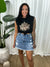 Our Shai skirt is a ridgid denim mini skirt, distressed in all the right places, she features a raw hem line and very slightly longer in the back (VERY SLIGHTLY). She is a ridgid demin meaning no stretch, perfecr for summer days and warm nights.