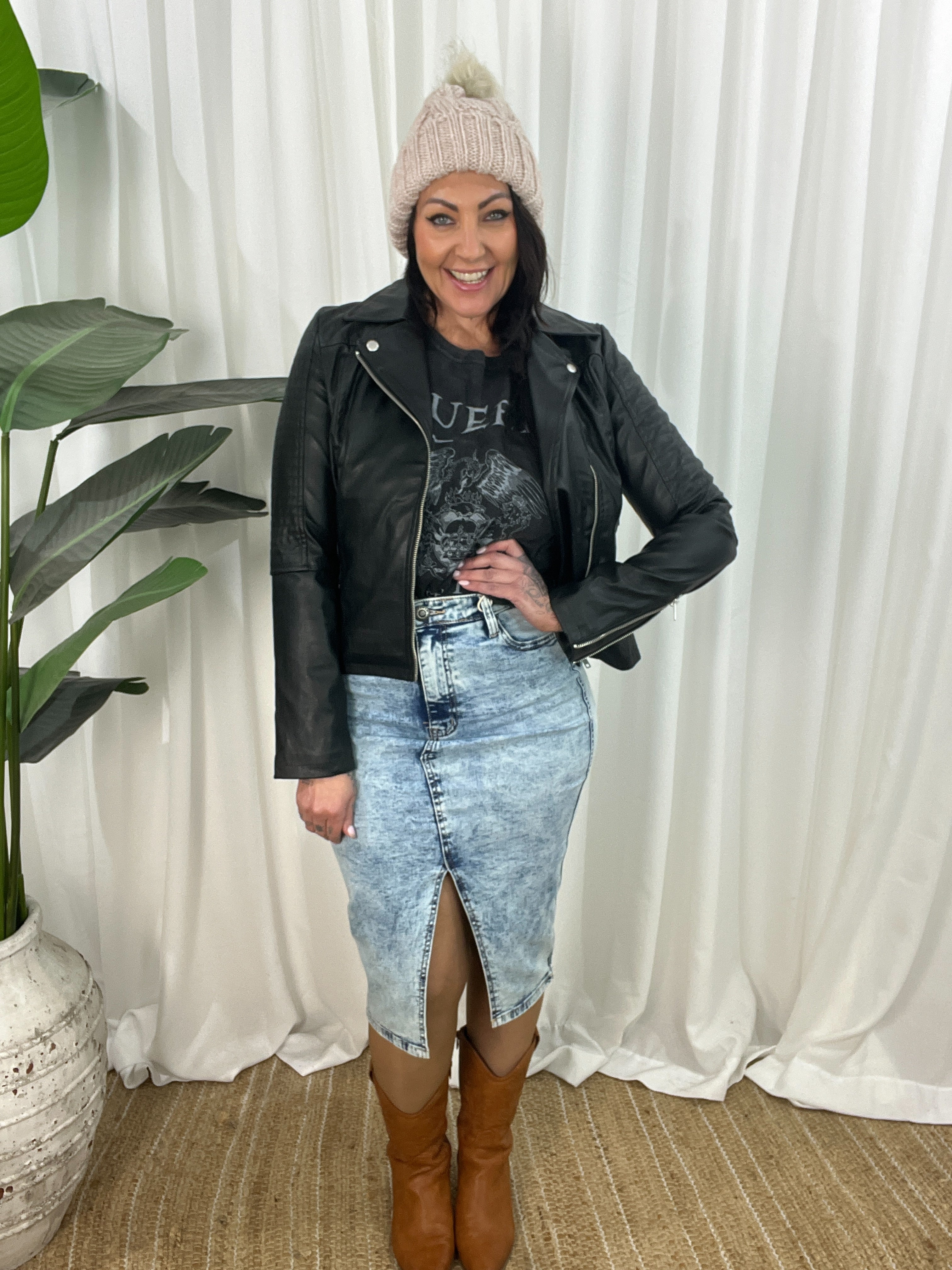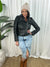 The Karla faux leather jacket is an essential statement piece for your wardrobe. This black faux leather biker-style jacket exudes the quintessential cool girl vibes you’ve been looking for. This jacket is designed to be a versatile and stylish addition to your wardrobe, perfect for those who love to make a bold fashion statement.