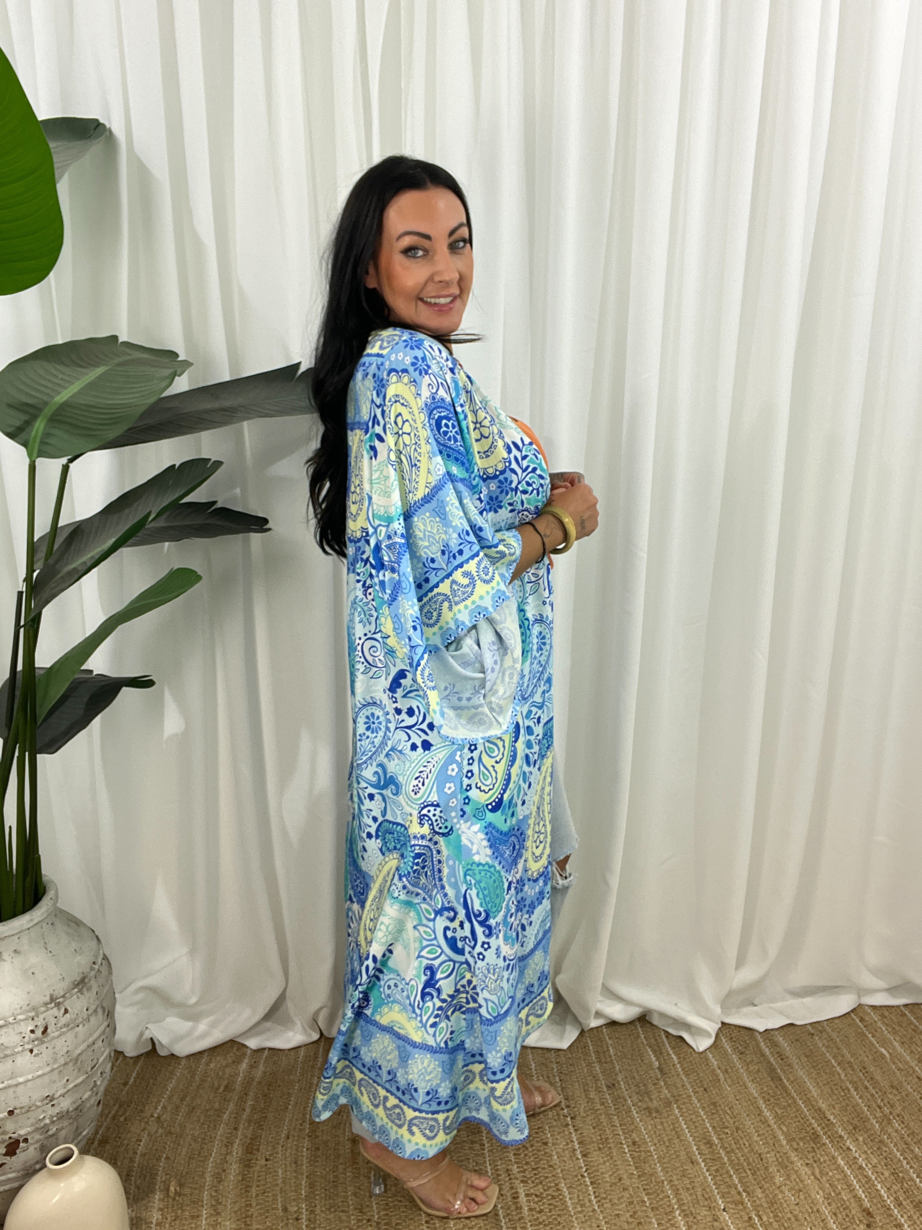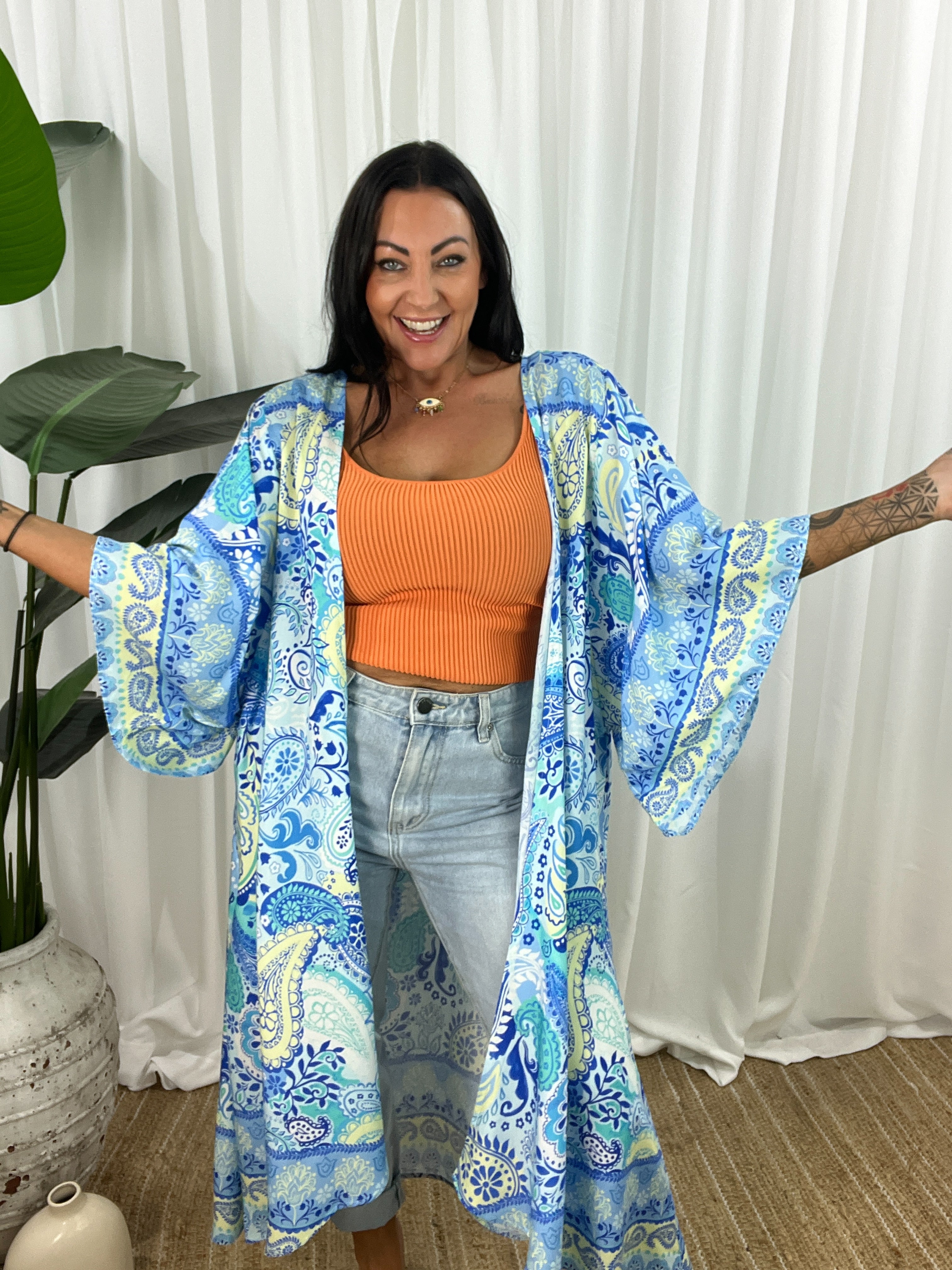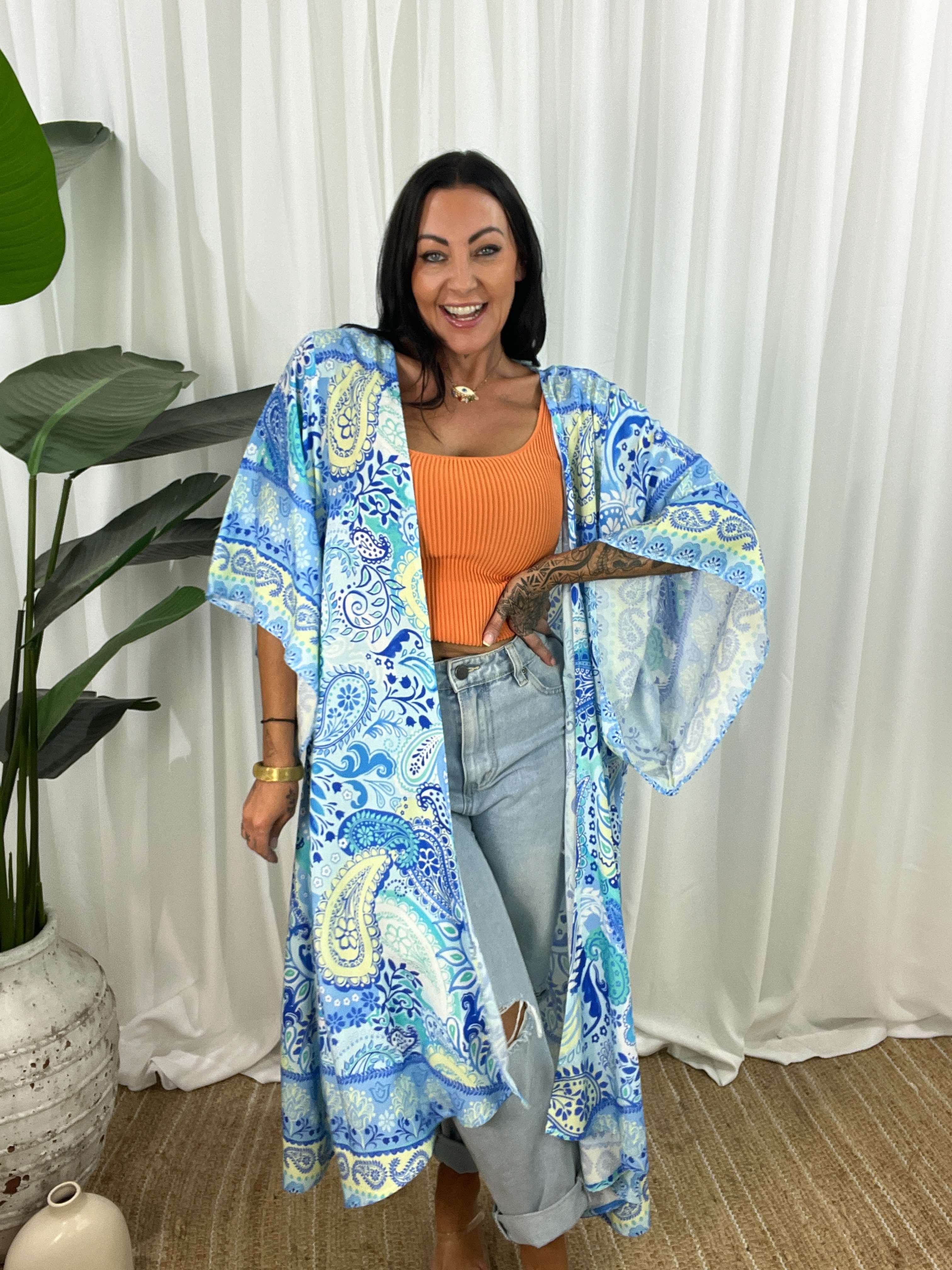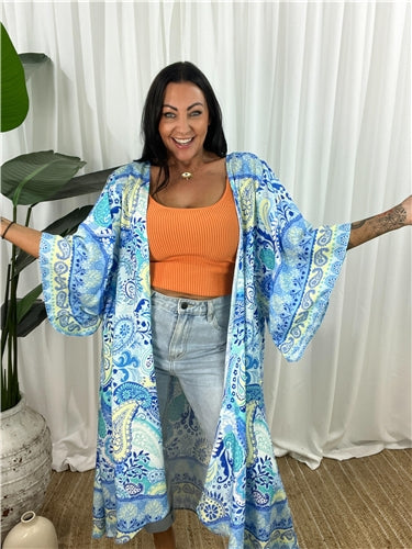 We absolutely love our Sapphire Kimono! This statement piece is a stunning kimono/duster with wide sleeves that instantly give you that boho vibe. The easy-to-wear throw-on design makes it perfect for adding a pop of amazing colors and gorgeous patterns to any outfit. Whether you're heading to the beach, dressing up a casual look, or lounging at home, the Sapphire Kimono is the easiest and most stylish piece to wear. Blues, whites and soft yellow paisley print.