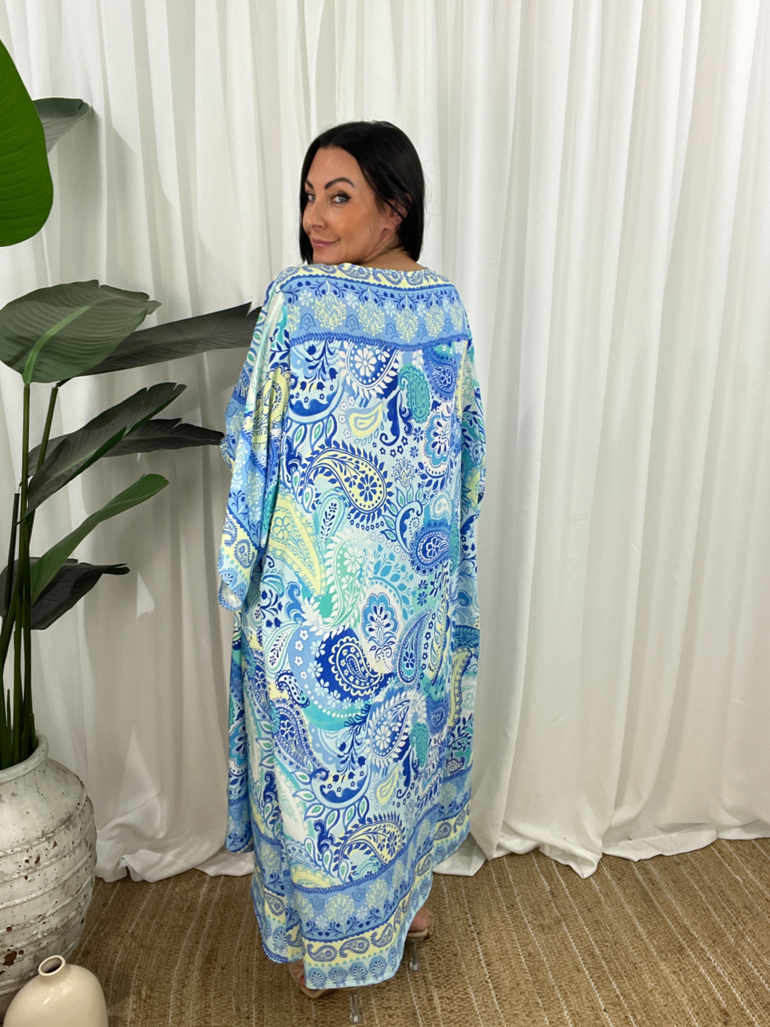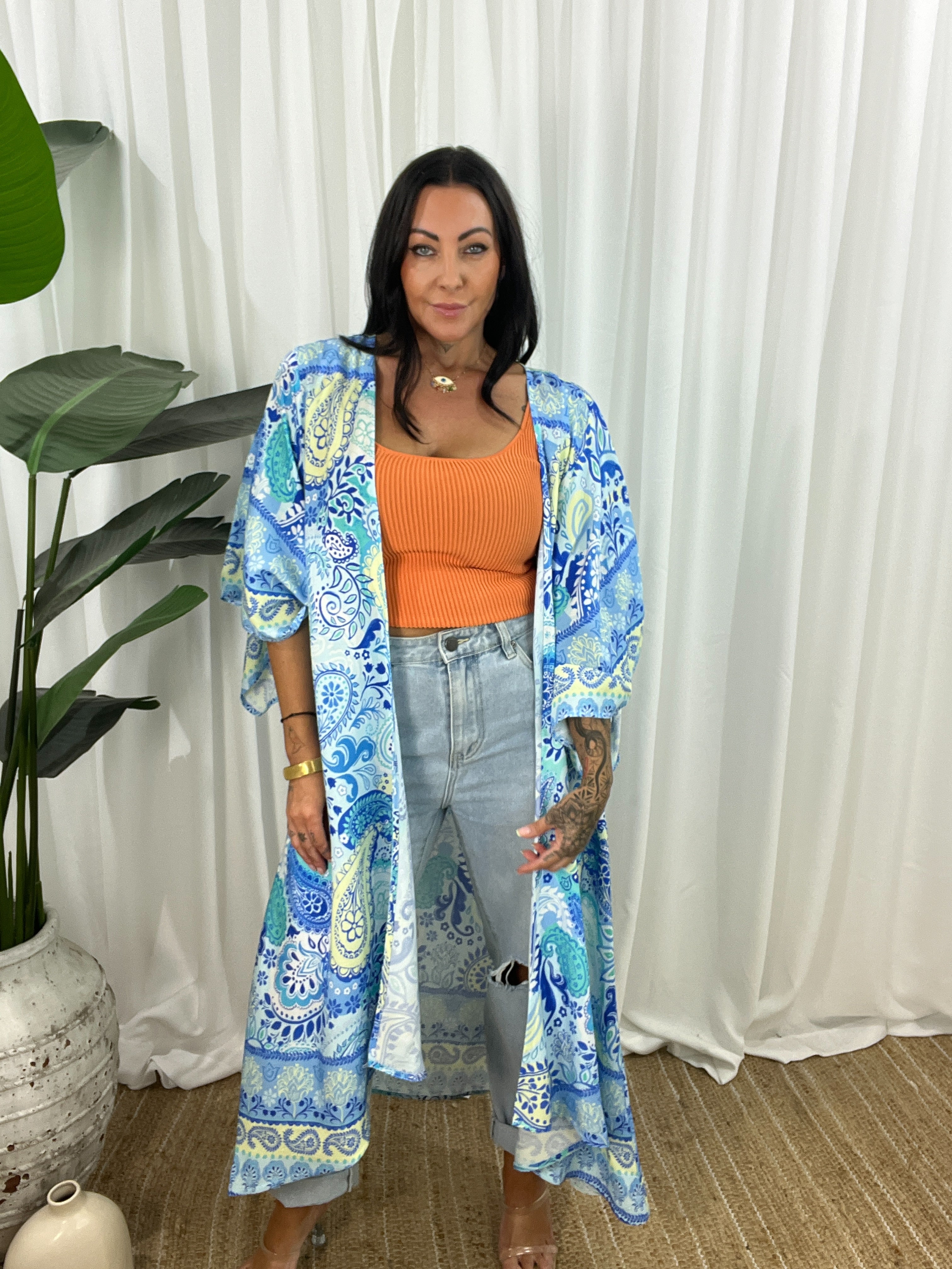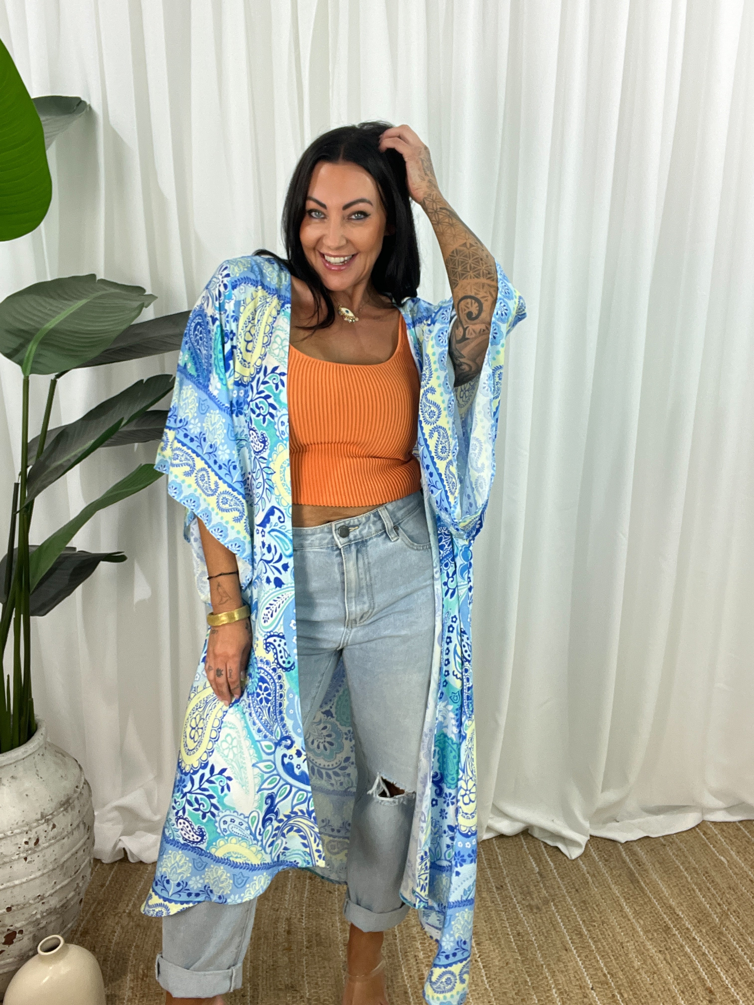 We absolutely love our Sapphire Kimono! This statement piece is a stunning kimono/duster with wide sleeves that instantly give you that boho vibe. The easy-to-wear throw-on design makes it perfect for adding a pop of amazing colors and gorgeous patterns to any outfit. Whether you're heading to the beach, dressing up a casual look, or lounging at home, the Sapphire Kimono is the easiest and most stylish piece to wear. Blues, whites and soft yellow paisley print.