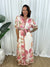 - Design : Button down maxi length with tie belt detail. Pockets. Lined from waist down. Cream base with a pink beige green floral print. Contrast pattern hem and belt