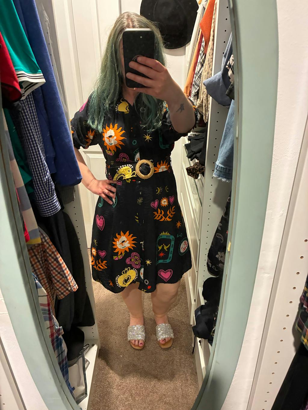• Design : Button down knee length lengh with adjustable belt. Lined from waist down. Black base with a funky motif pattern
