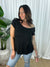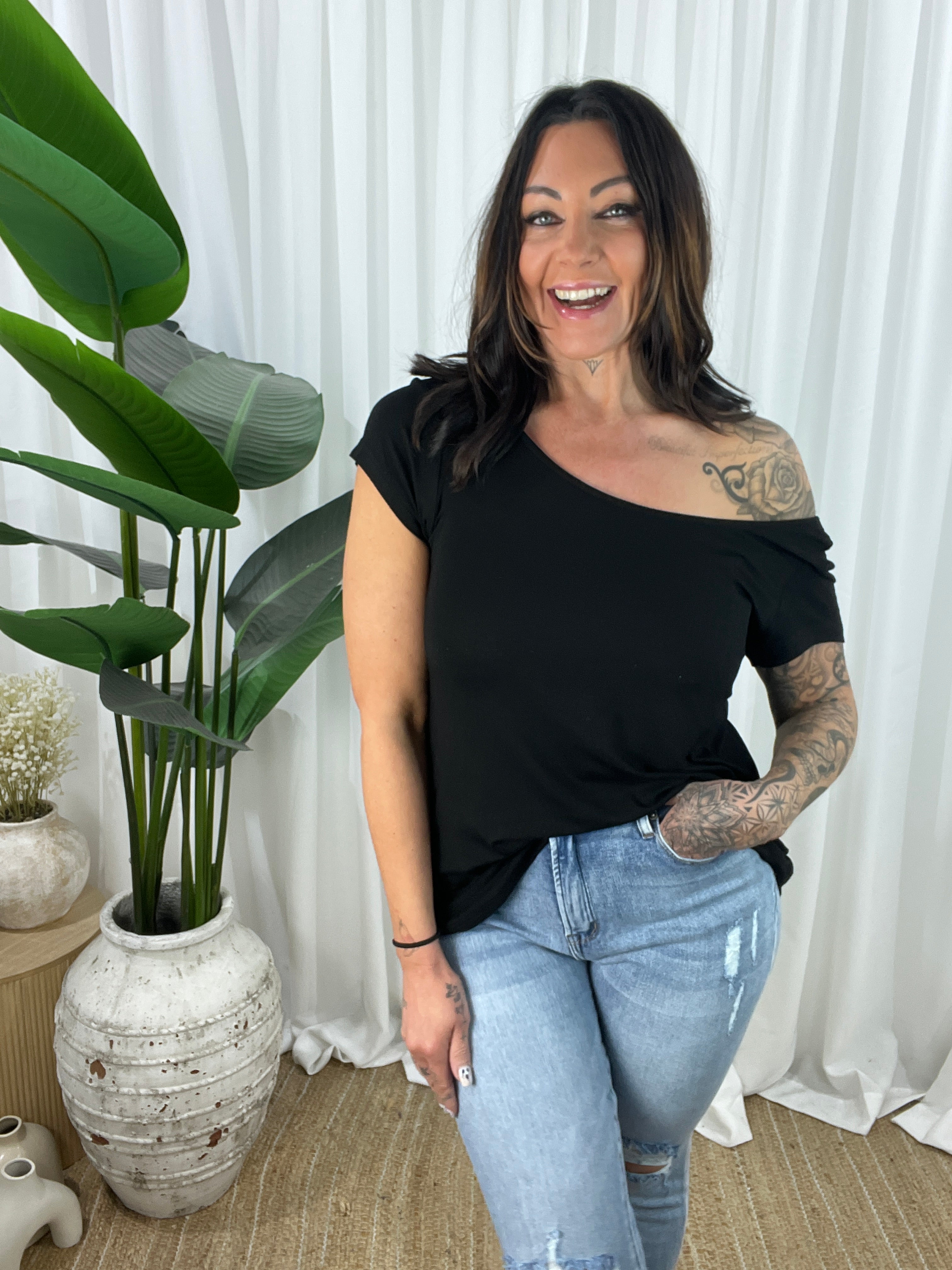 Soft, stretchy, and effortlessly flirty, the Britt Top is your everyday tee essential with a playful twist. Designed with a wide off-shoulder neckline, cap-style sleeves, and a flattering scoop hem, this tee brings relaxed polish to your off-duty wardrobe.