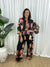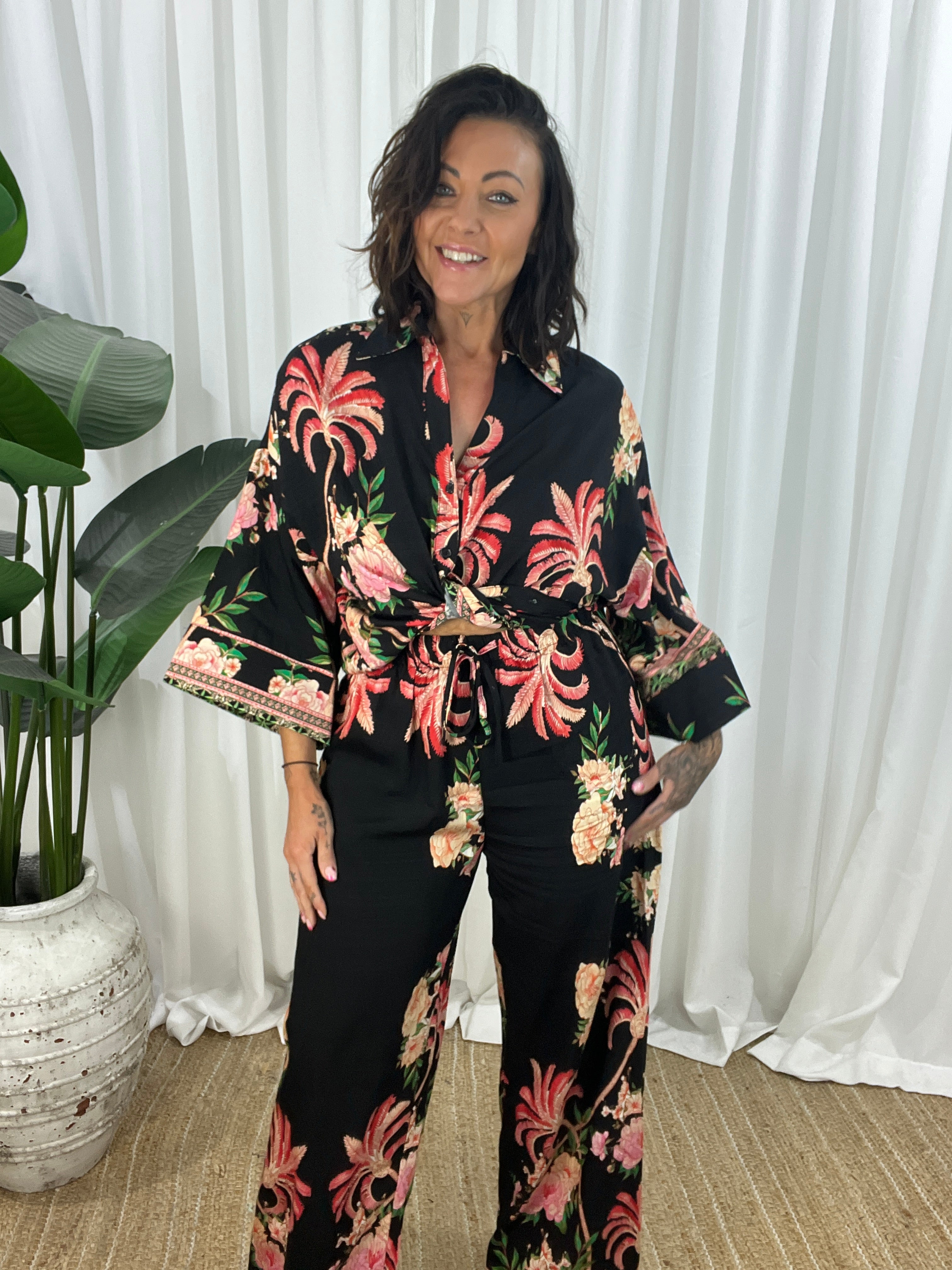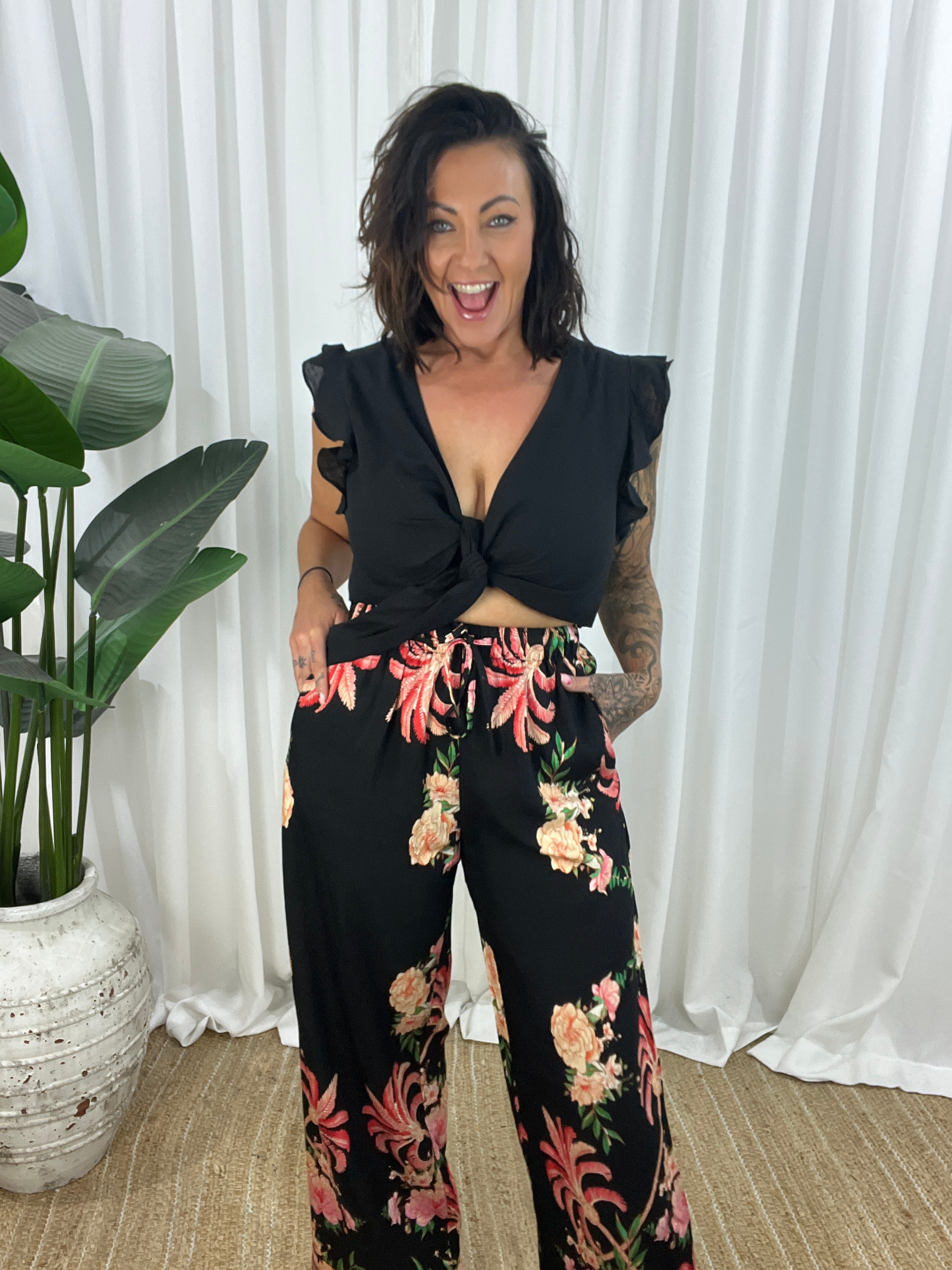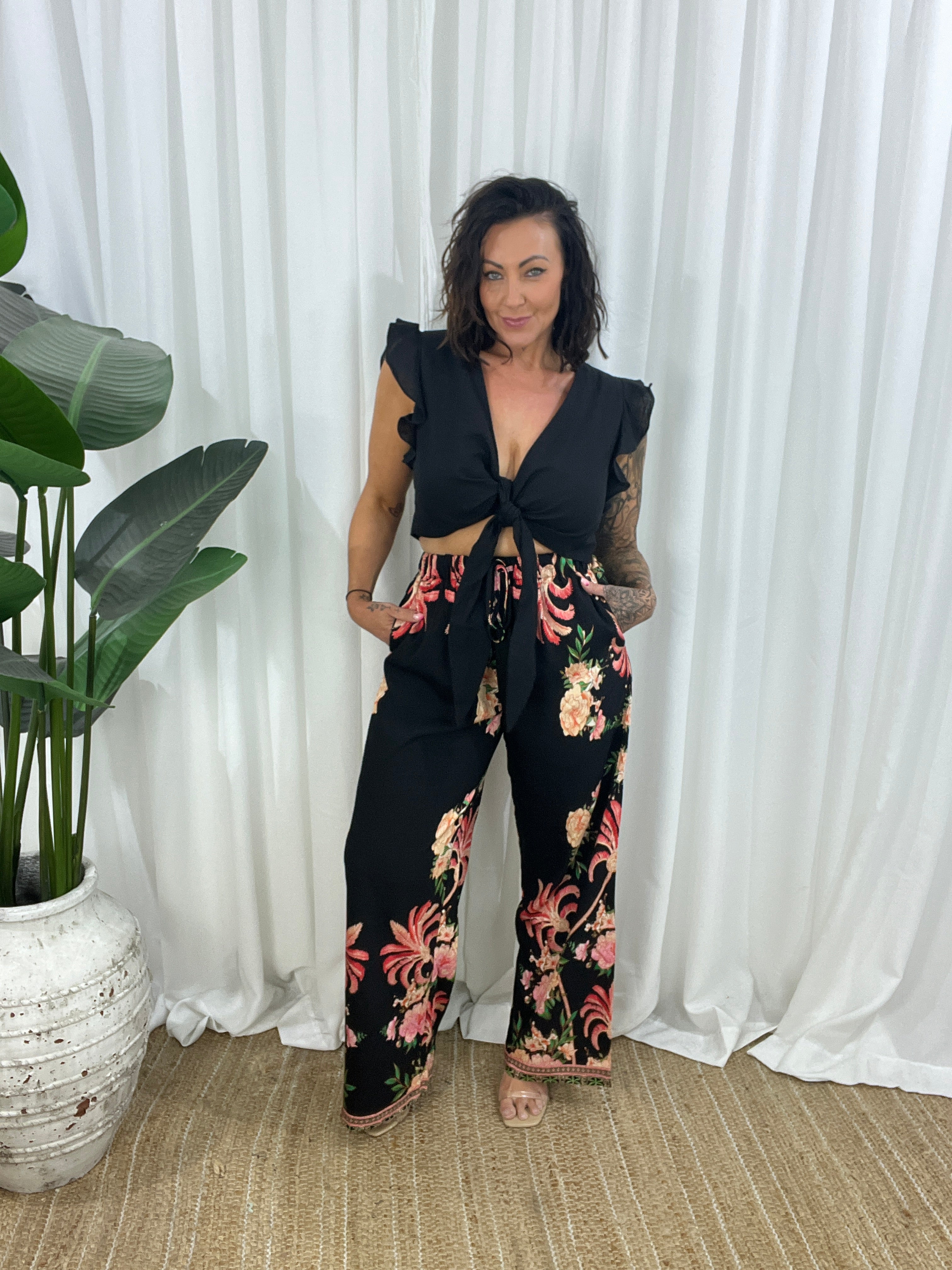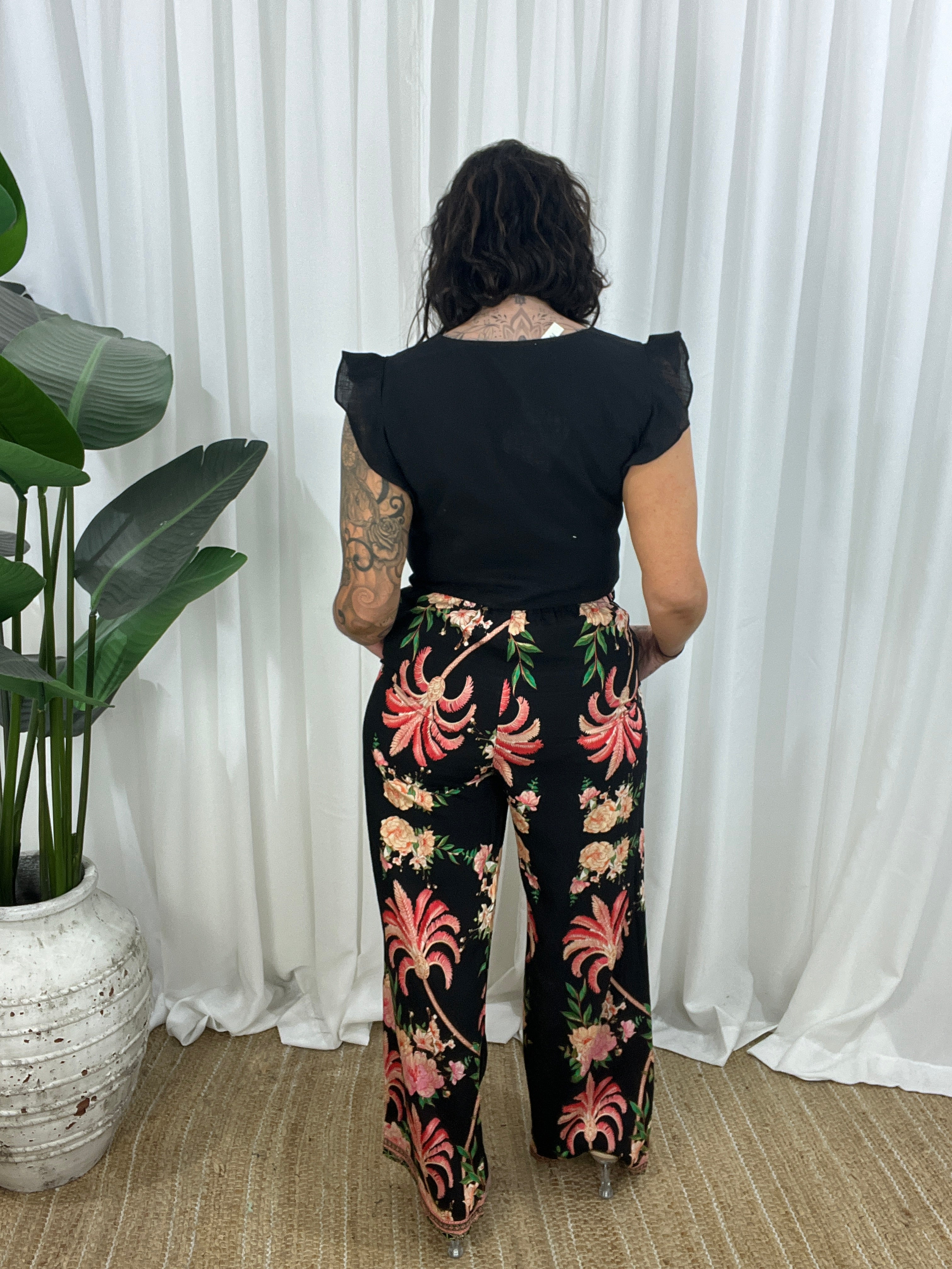 - Design : Cool casual lightweight pants in a black base with a pink and beige floral palm pattern