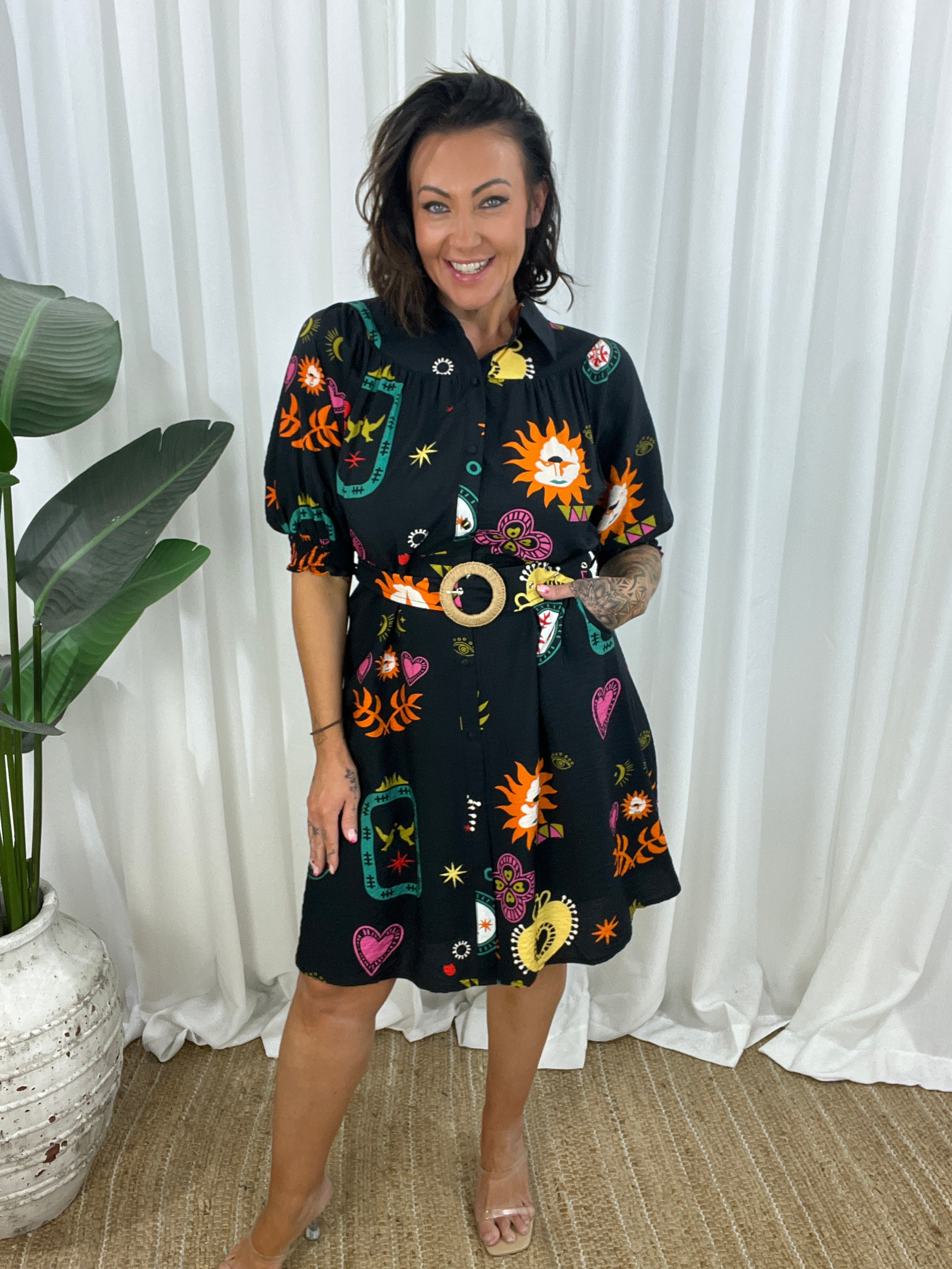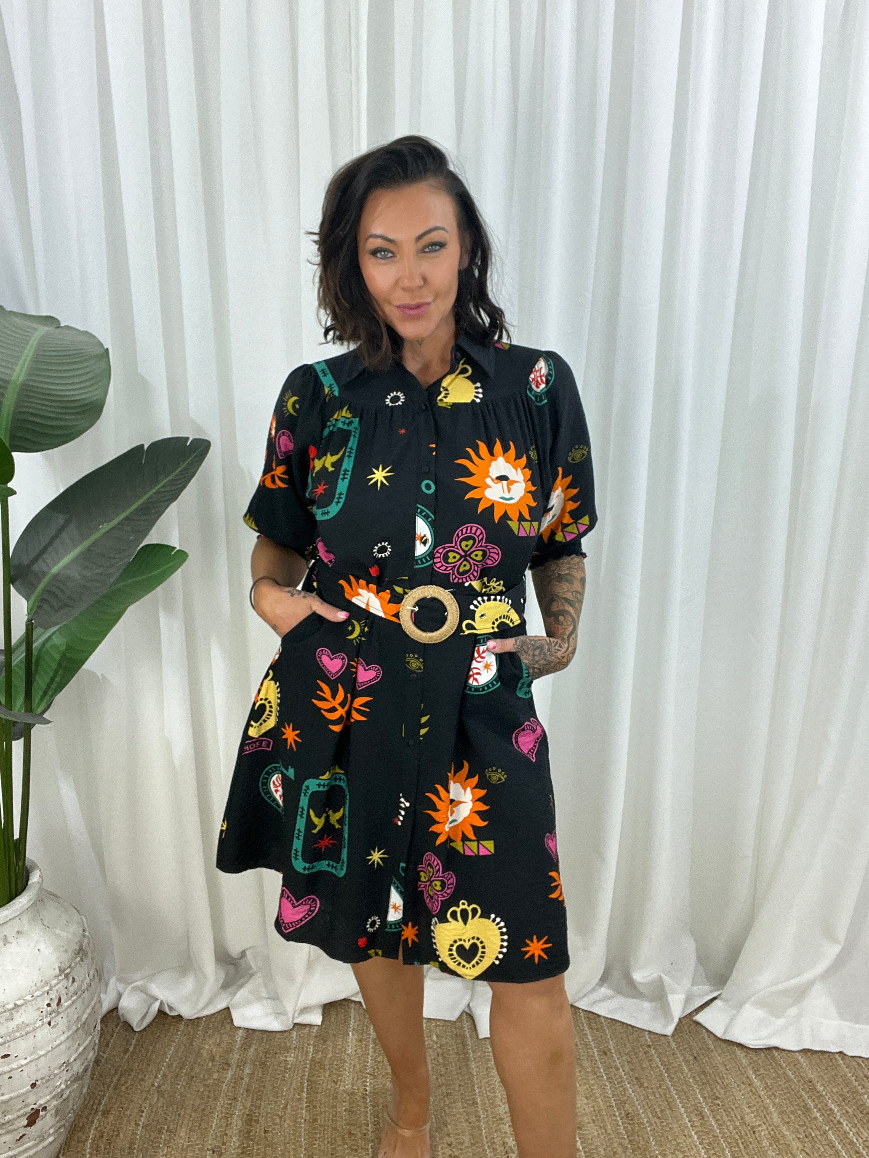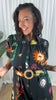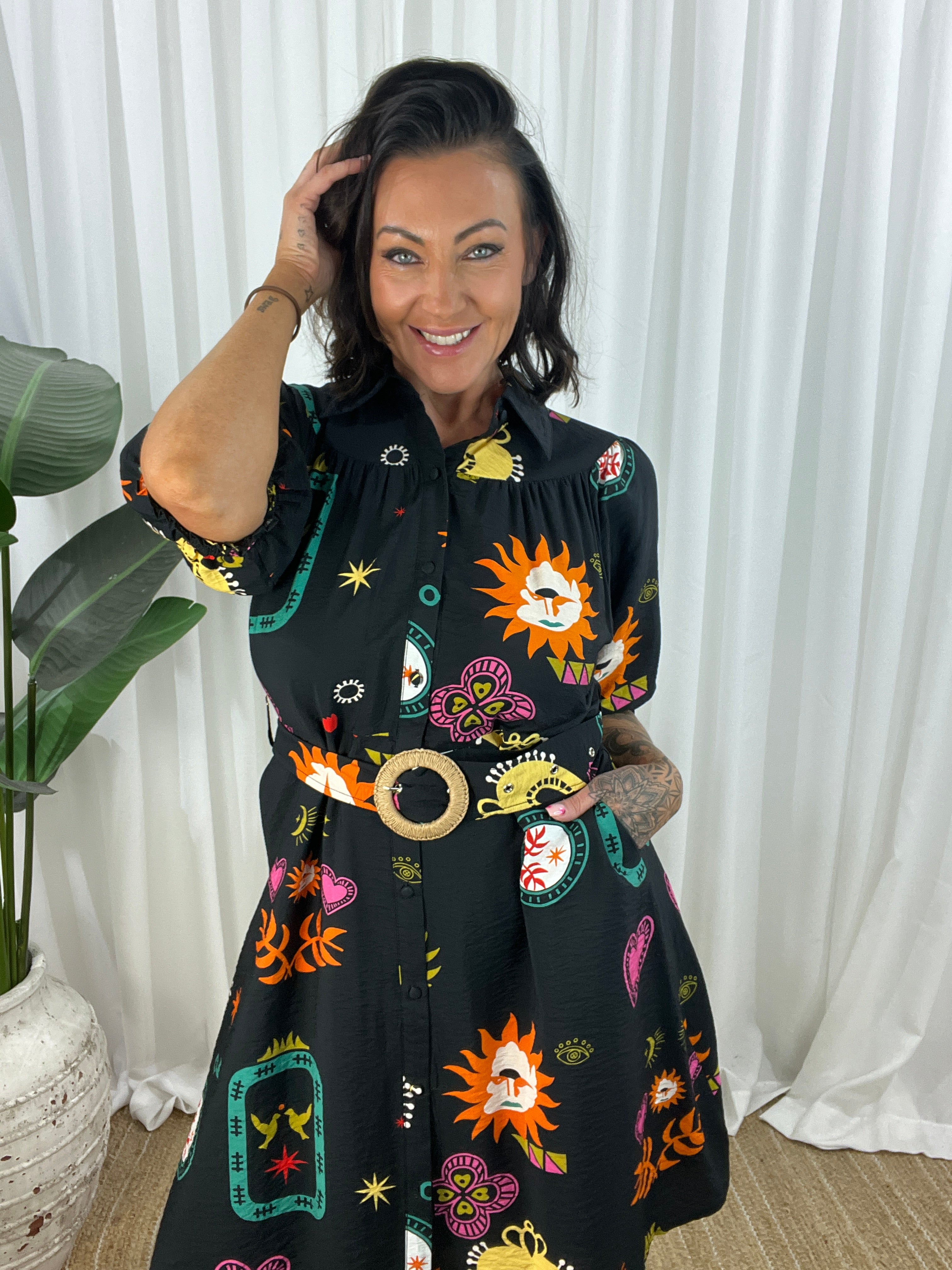 - Design : Button down knee length lengh with adjustable belt. Lined from waist down. Black base with a funky motif pattern