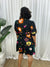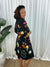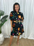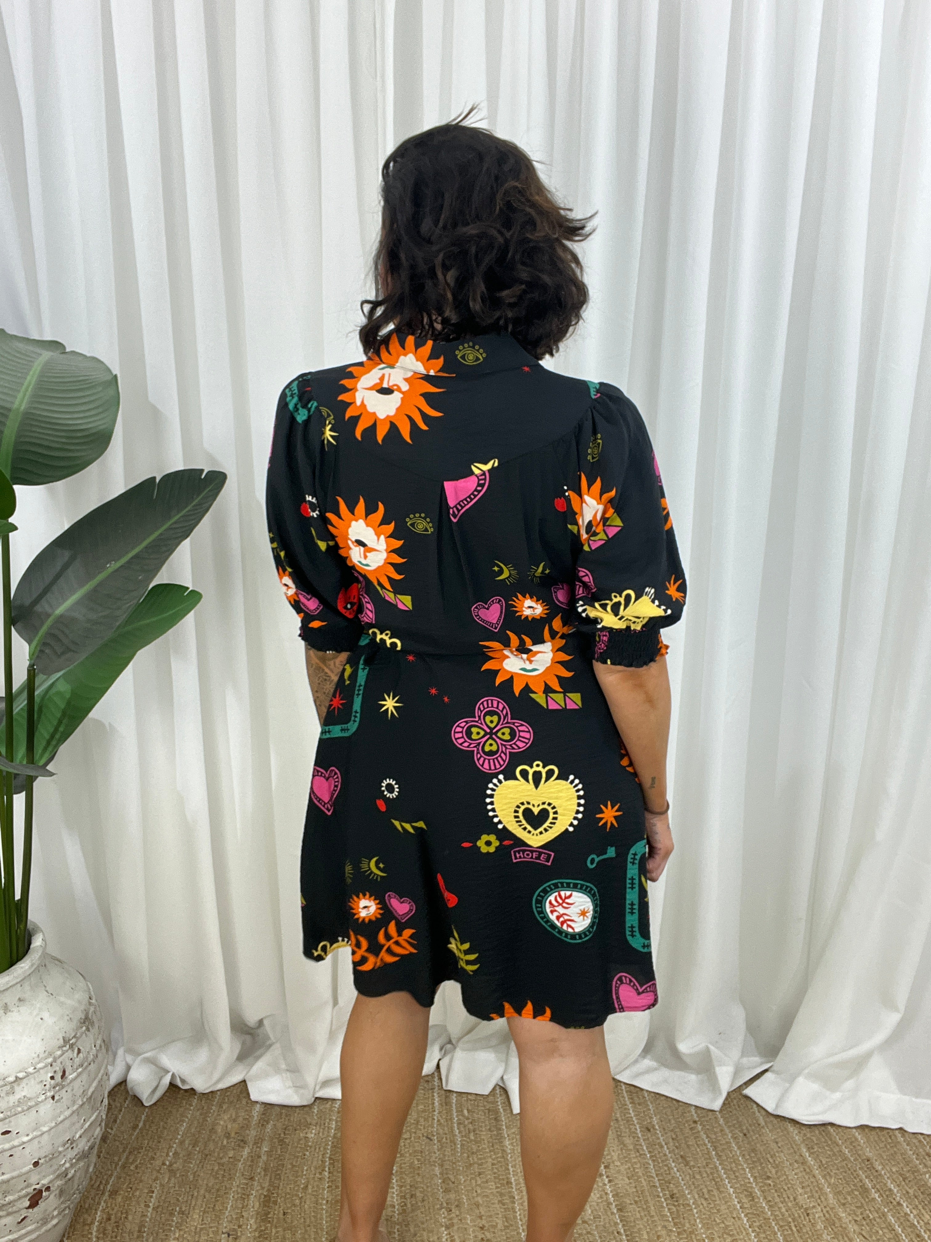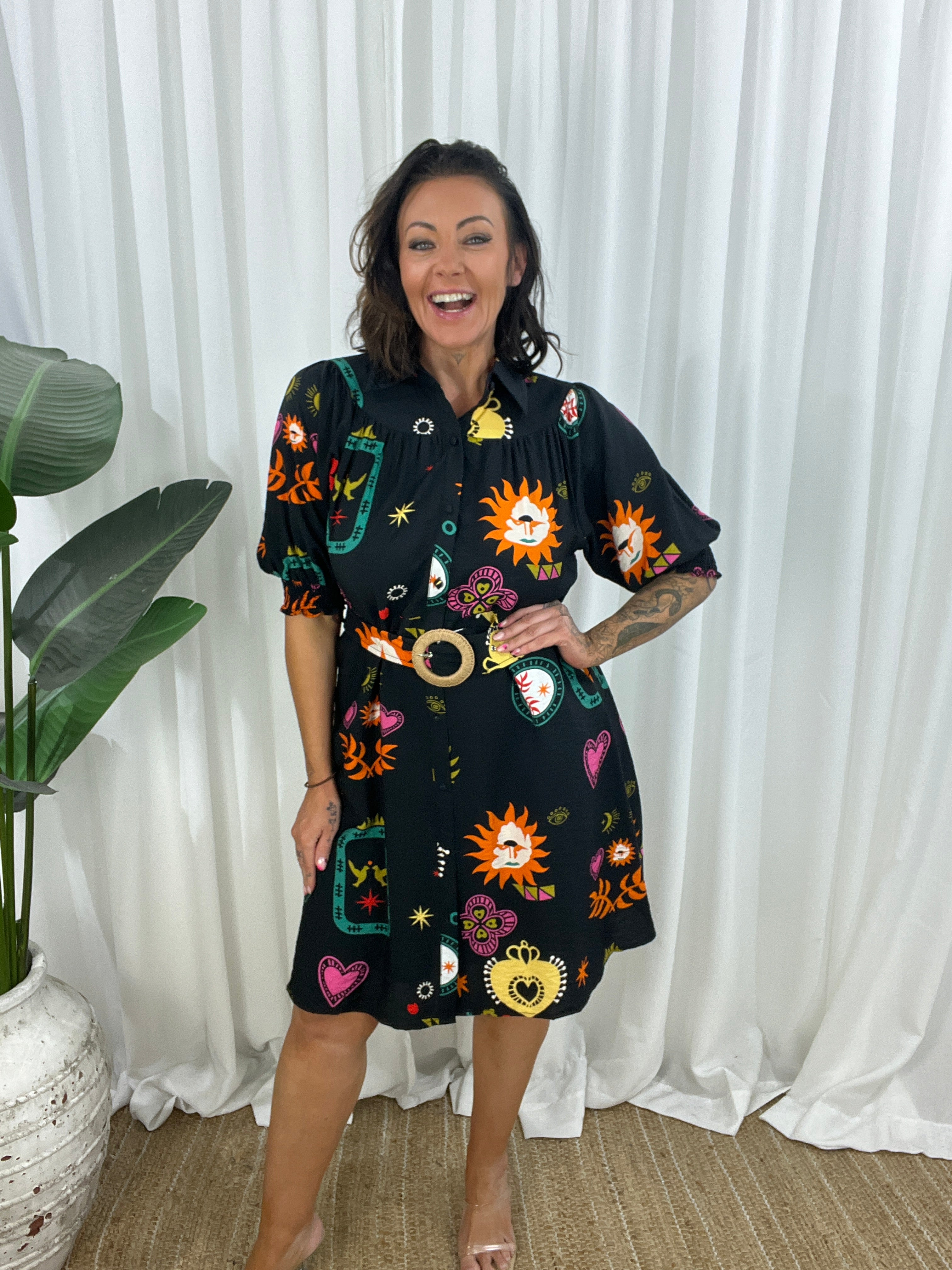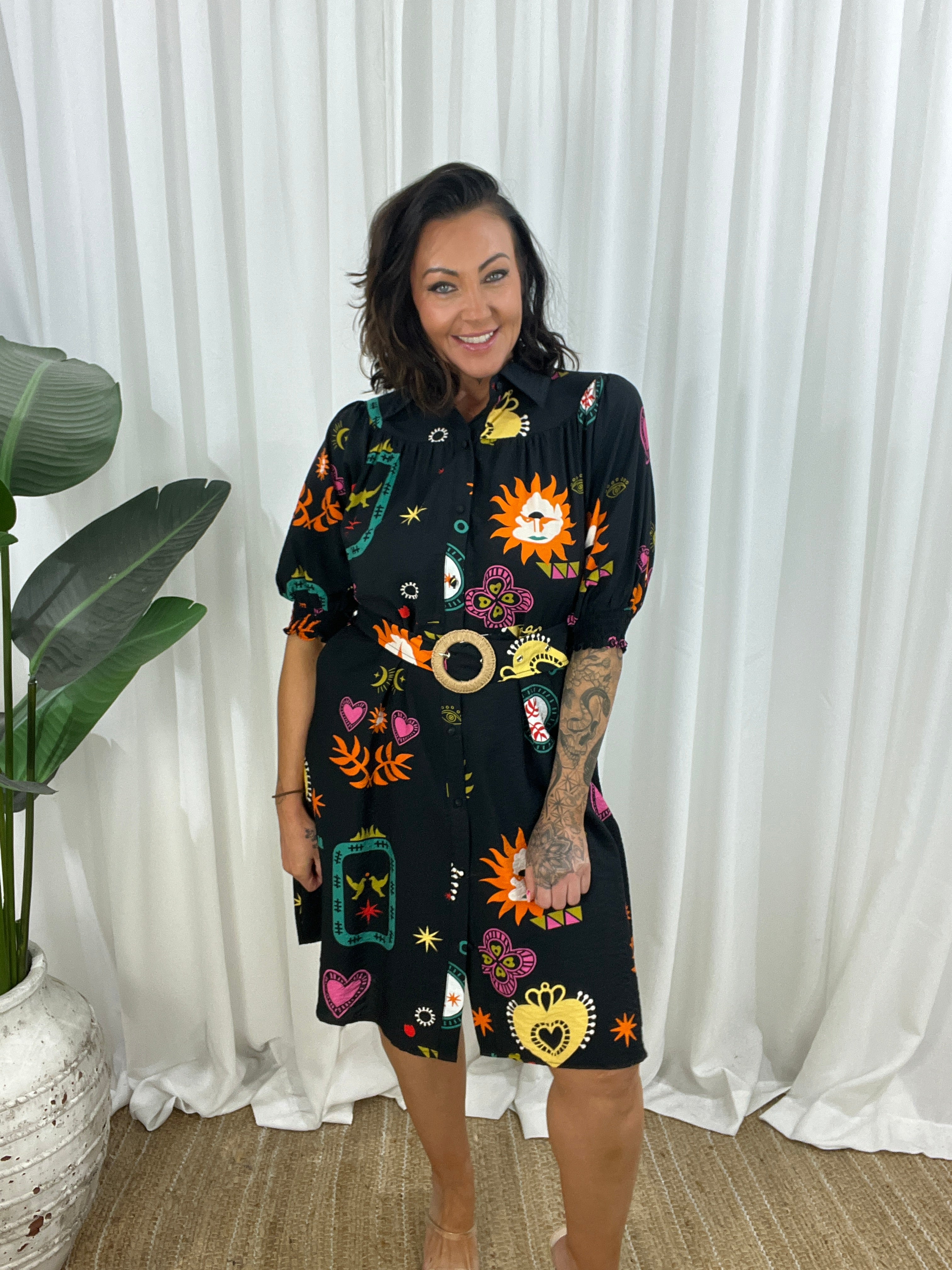 - Design : Button down knee length lengh with adjustable belt. Lined from waist down. Black base with a funky motif pattern