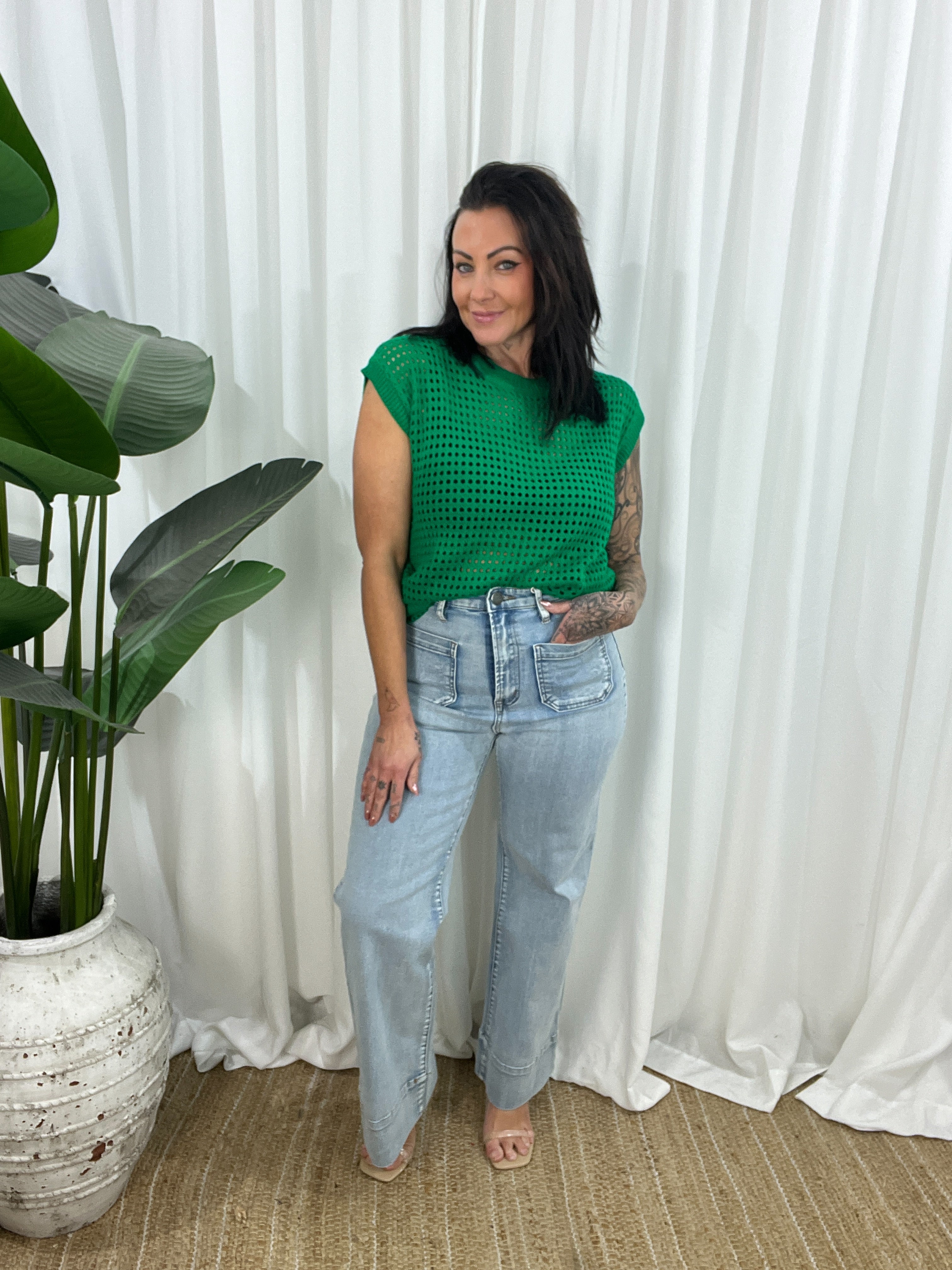 The Josie Top is all about laid-back edge with a hint of attitude. Designed in a crochet-look knit, this sleeveless style channels muscle tee energy with a relaxed silhouette. The open weave creates a subtle peek-a-boo effect, perfect for layering over a singlet if you prefer more coverage. Finished with a crew neckline and ribbed hem, it’s stretchy, breathable, and effortlessly cool.