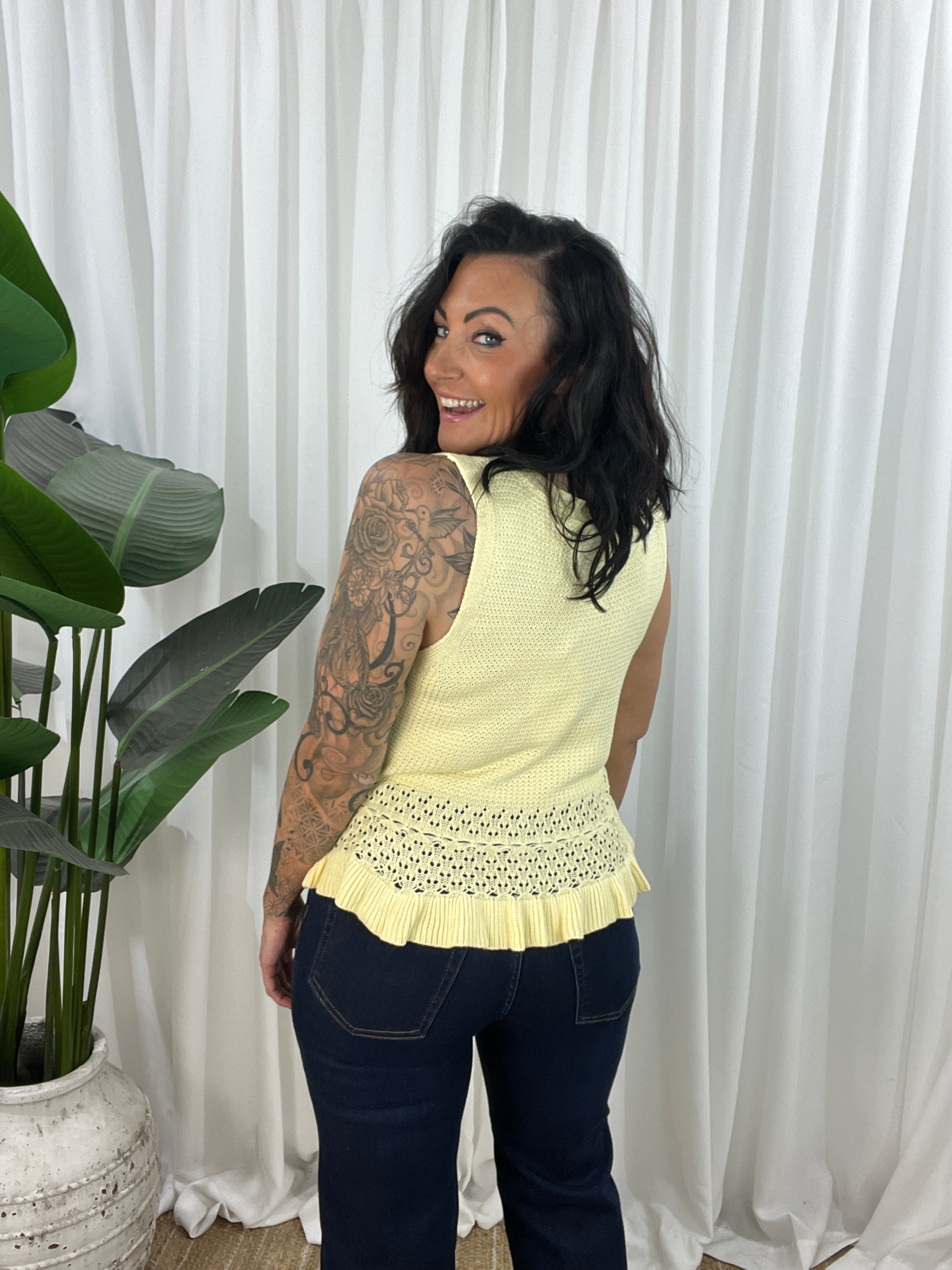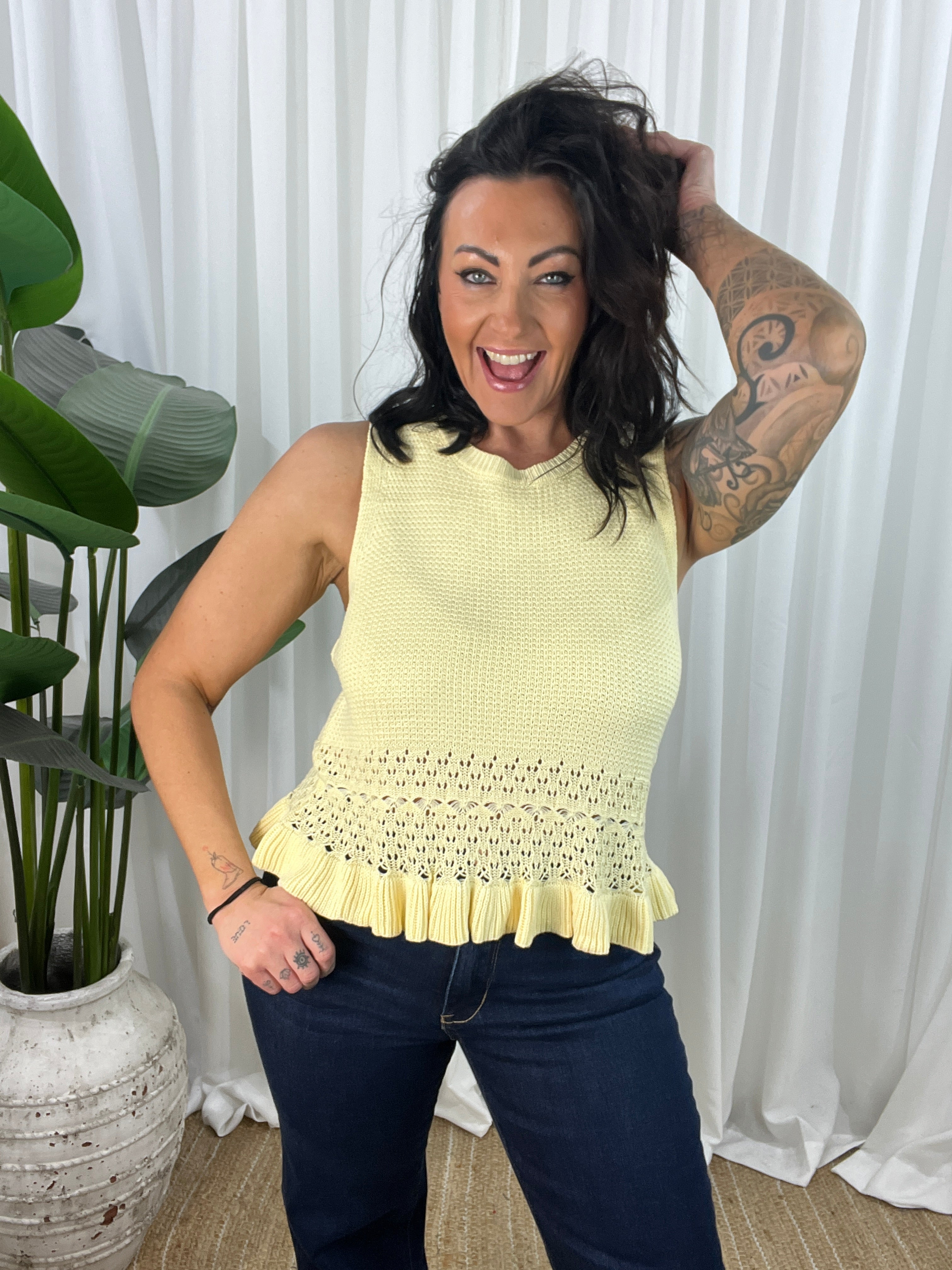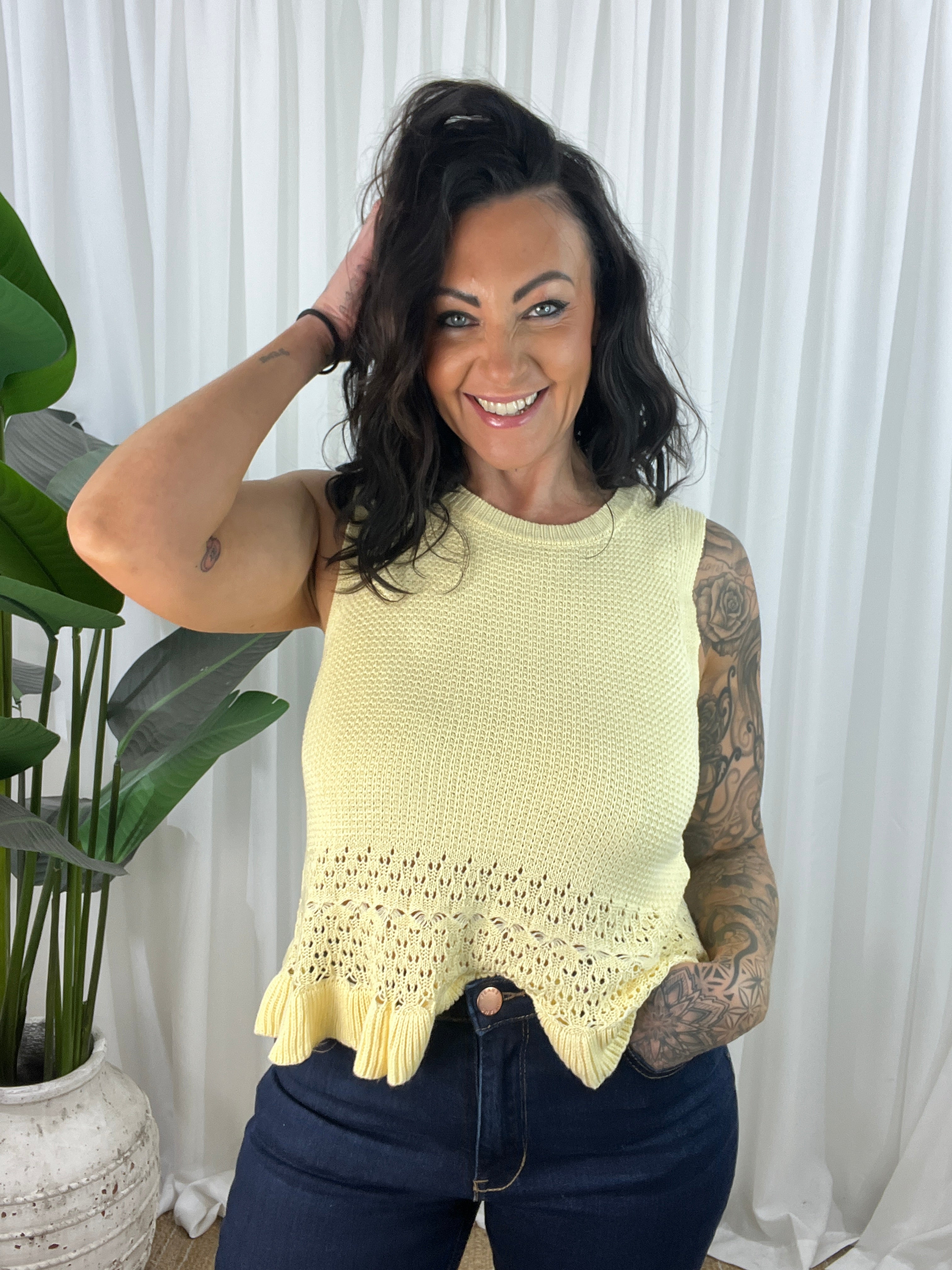 Soft, sculptural, and effortlessly charming—the Kiki Frill Hem Top brings a playful twist to everyday dressing. With its crochet-look knit and delicate frill hem, this sleeveless style blends texture and femininity in a way that feels both elevated and easy. The rounded neckline and neutral beige tone make it a versatile staple for layering or solo styling.