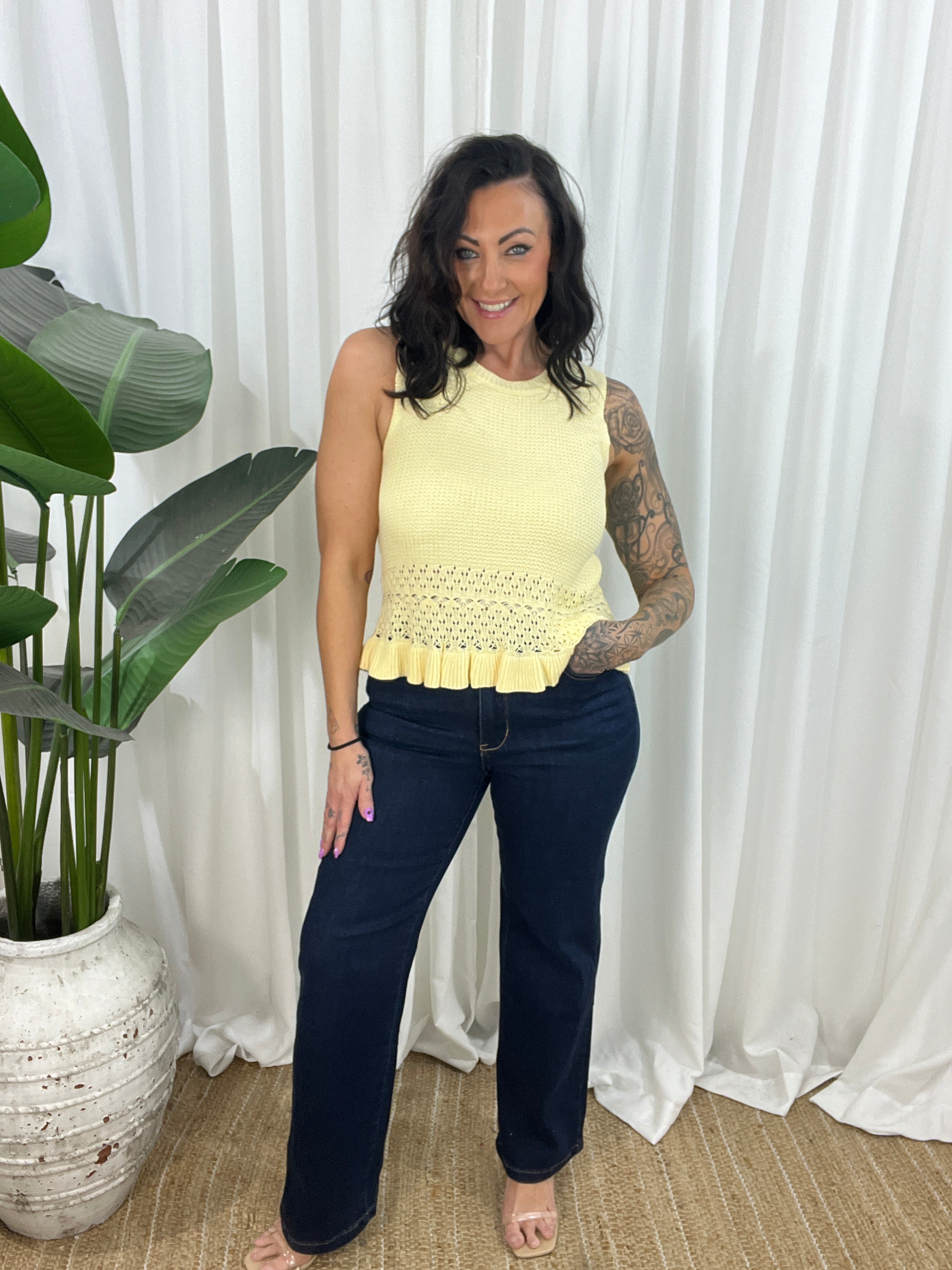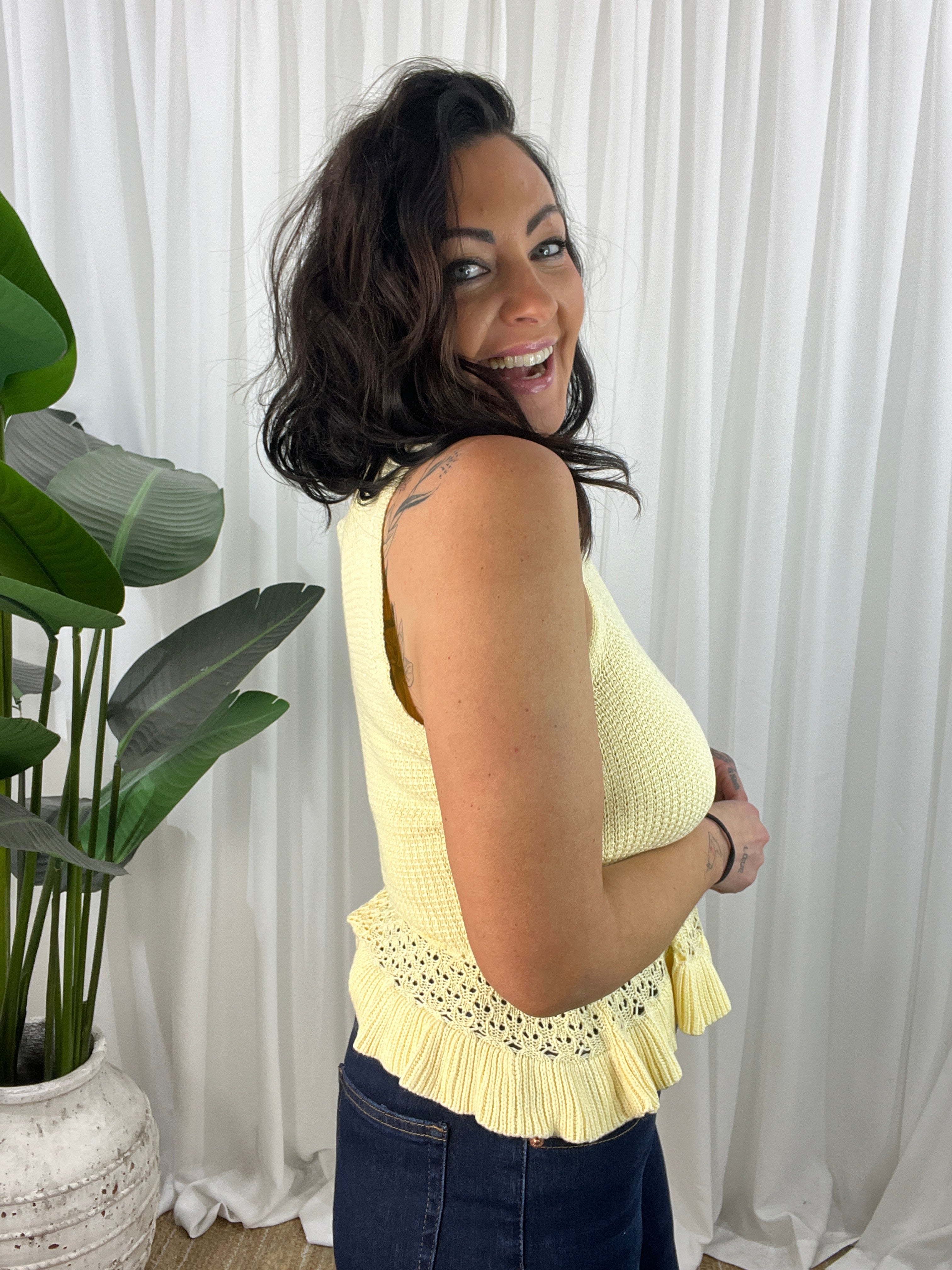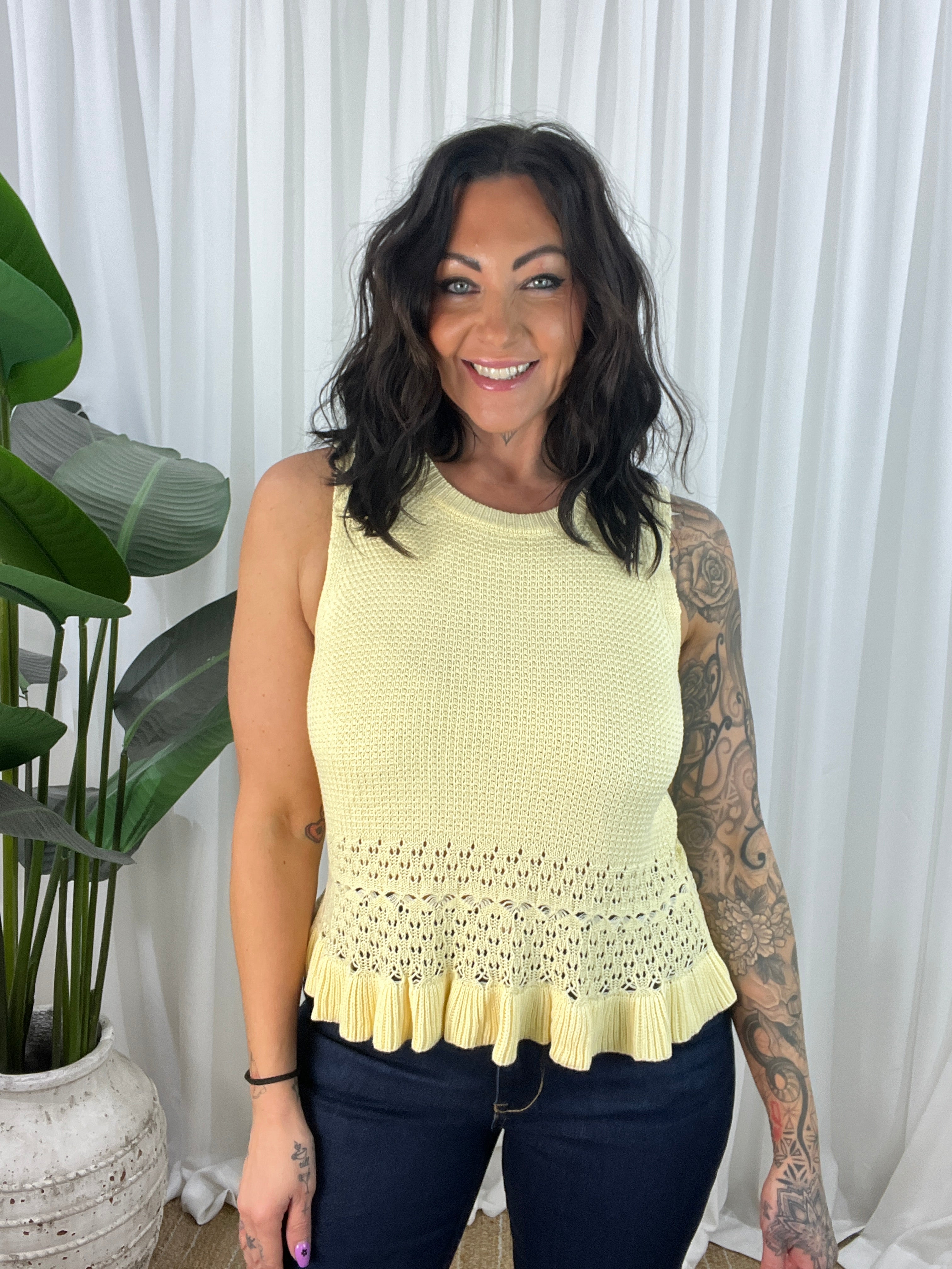 Soft, sculptural, and effortlessly charming—the Kiki Frill Hem Top brings a playful twist to everyday dressing. With its crochet-look knit and delicate frill hem, this sleeveless style blends texture and femininity in a way that feels both elevated and easy. The rounded neckline and neutral beige tone make it a versatile staple for layering or solo styling.