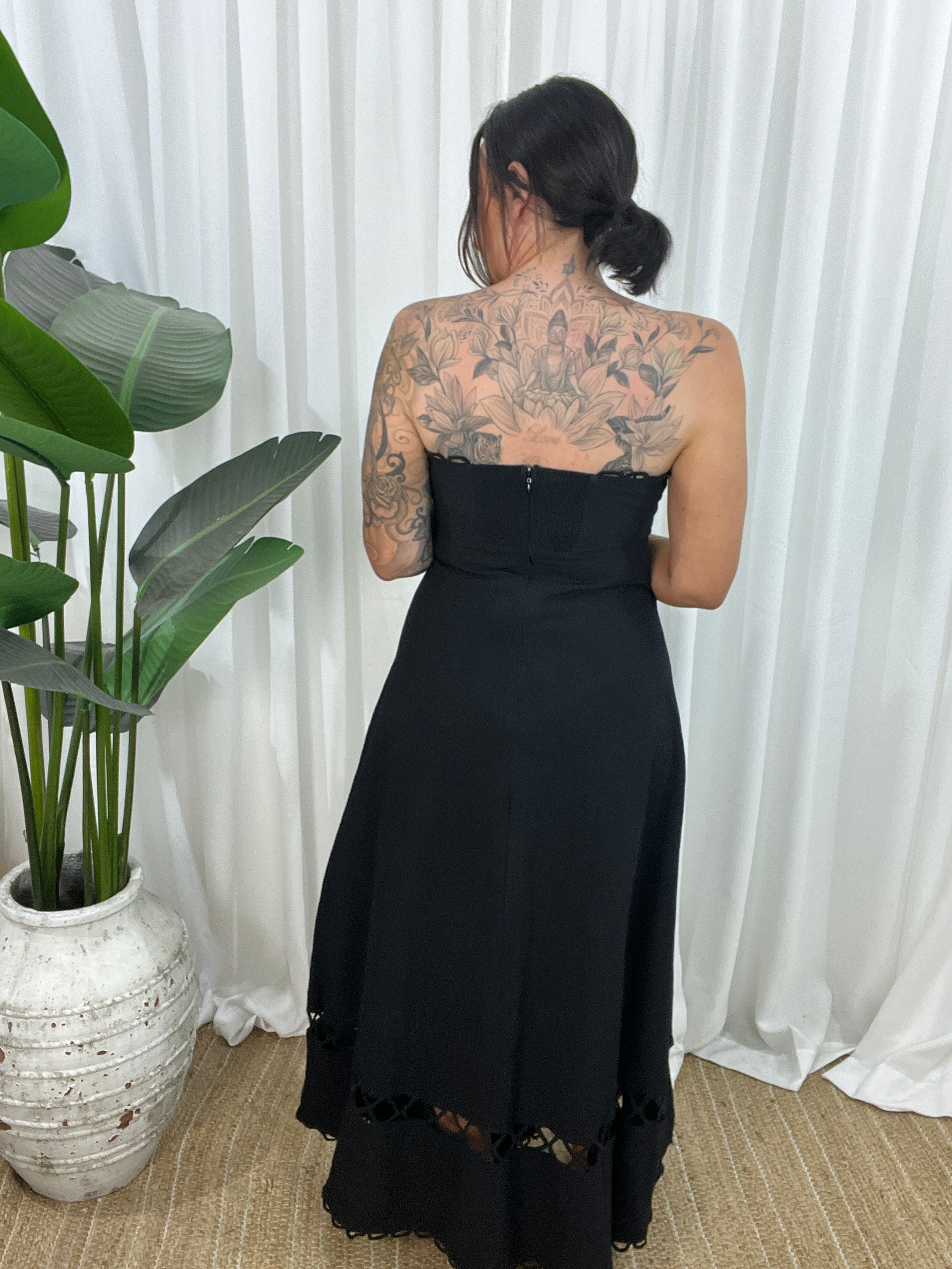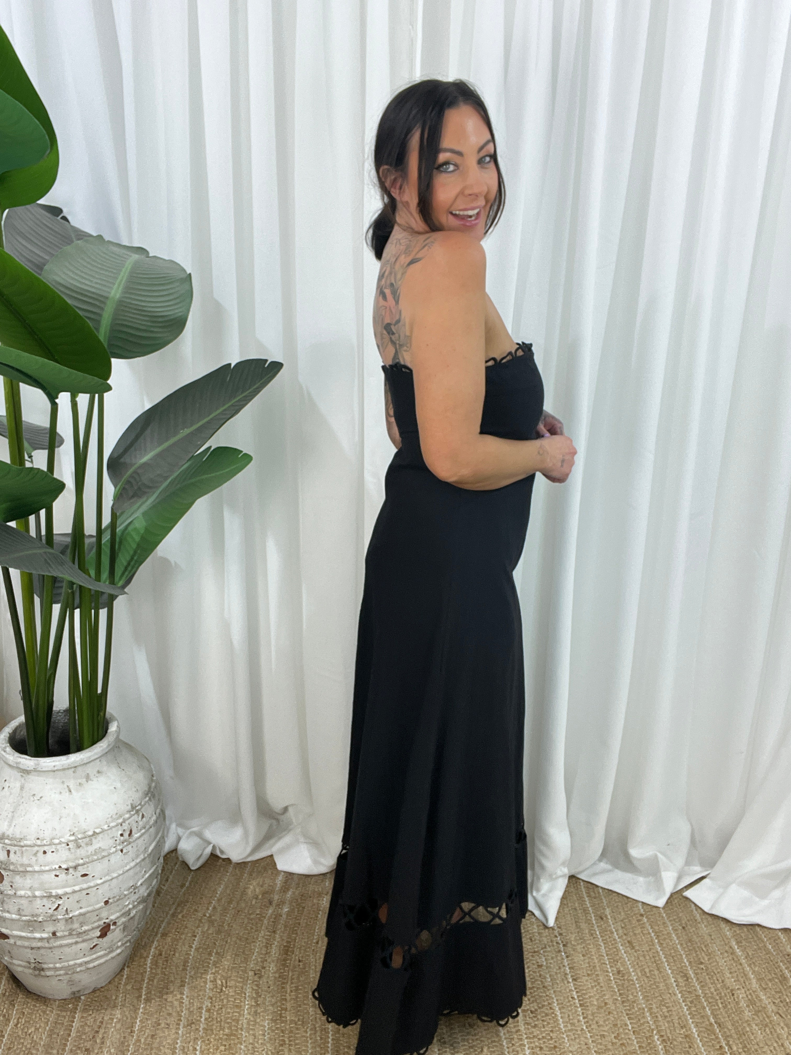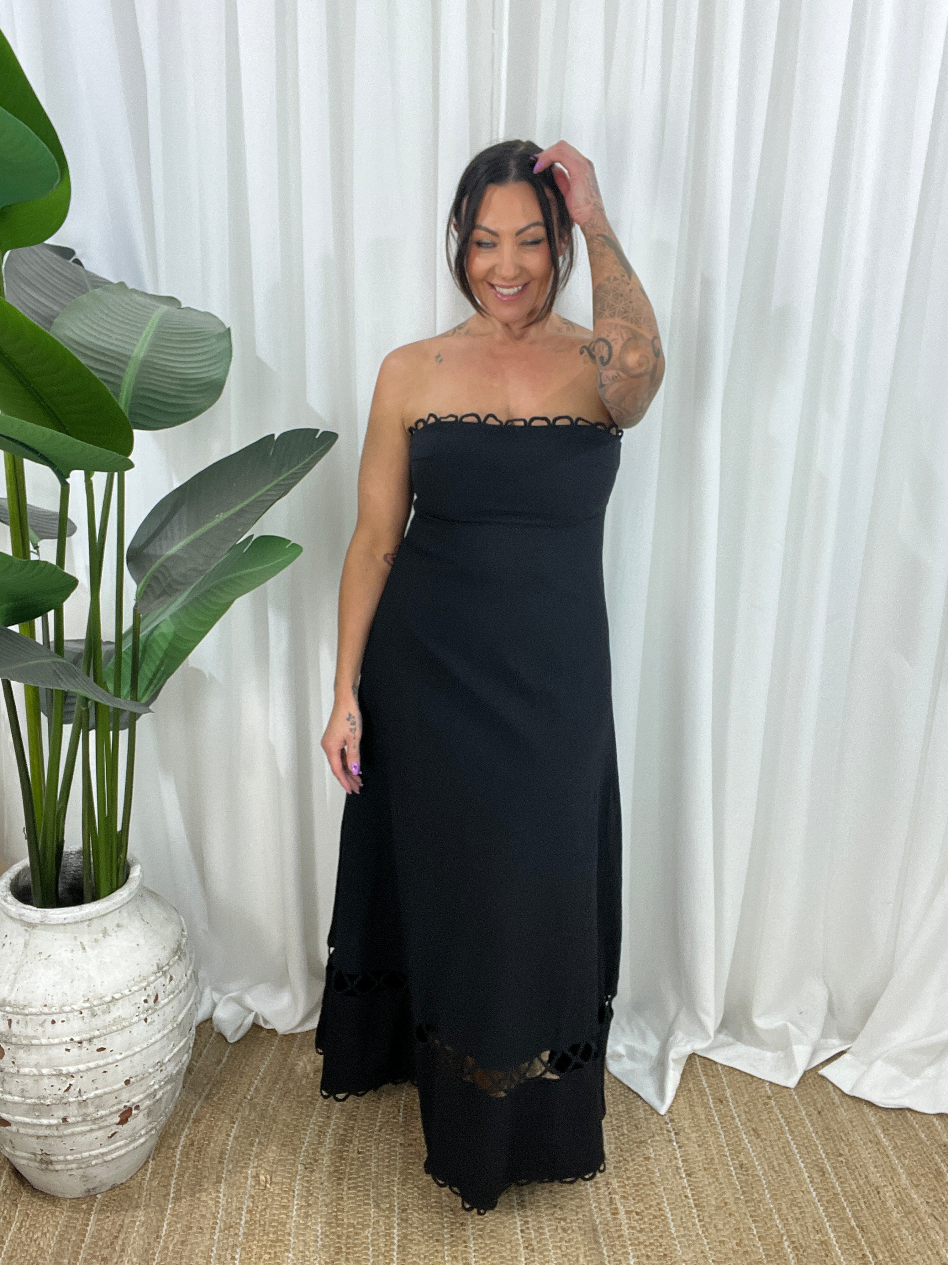Elegant, edgy, and effortlessly romantic—the Raven Strapless Dress is your go-to for statement style with a sultry twist. Made from 100% cotton in classic all-black, this maxi features loop lace trim around the bustline and hem, plus a peek-a-boo lace panel near the lower skirt for that extra touch of intrigue.