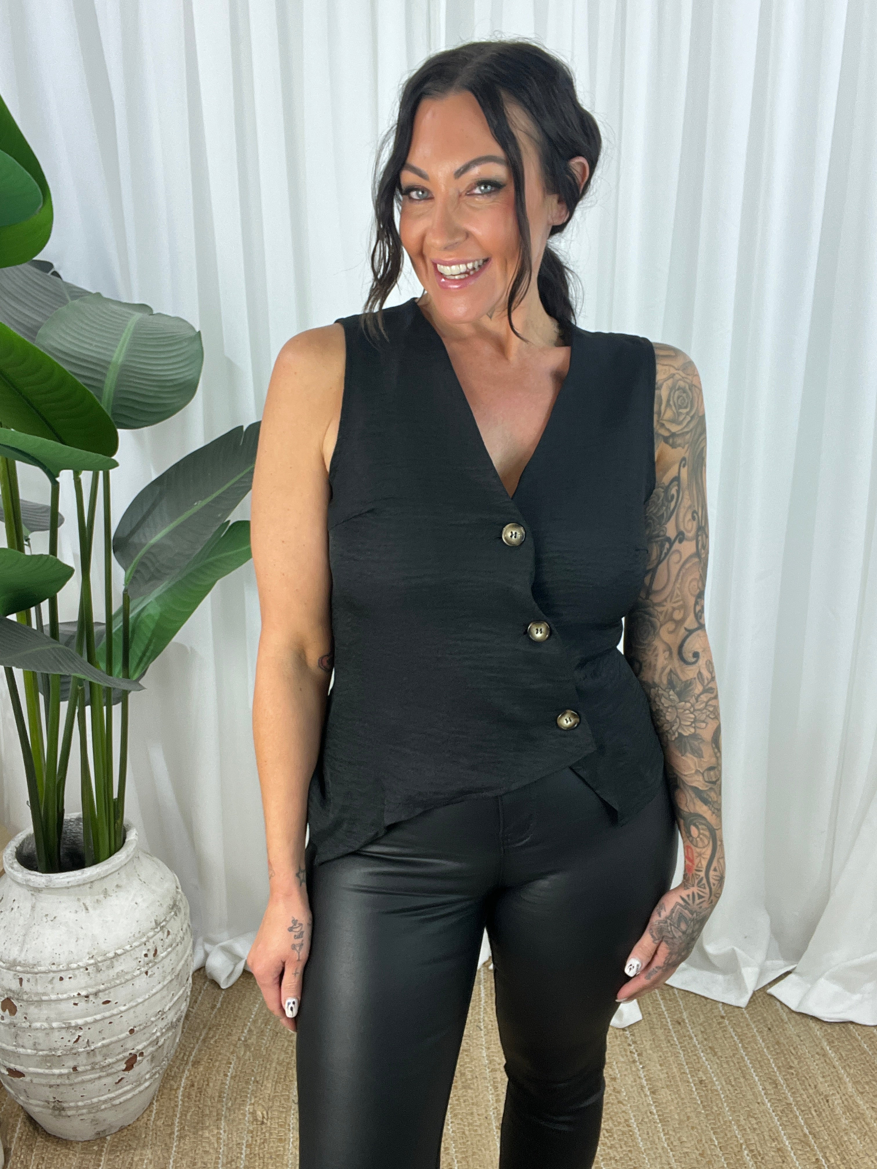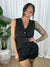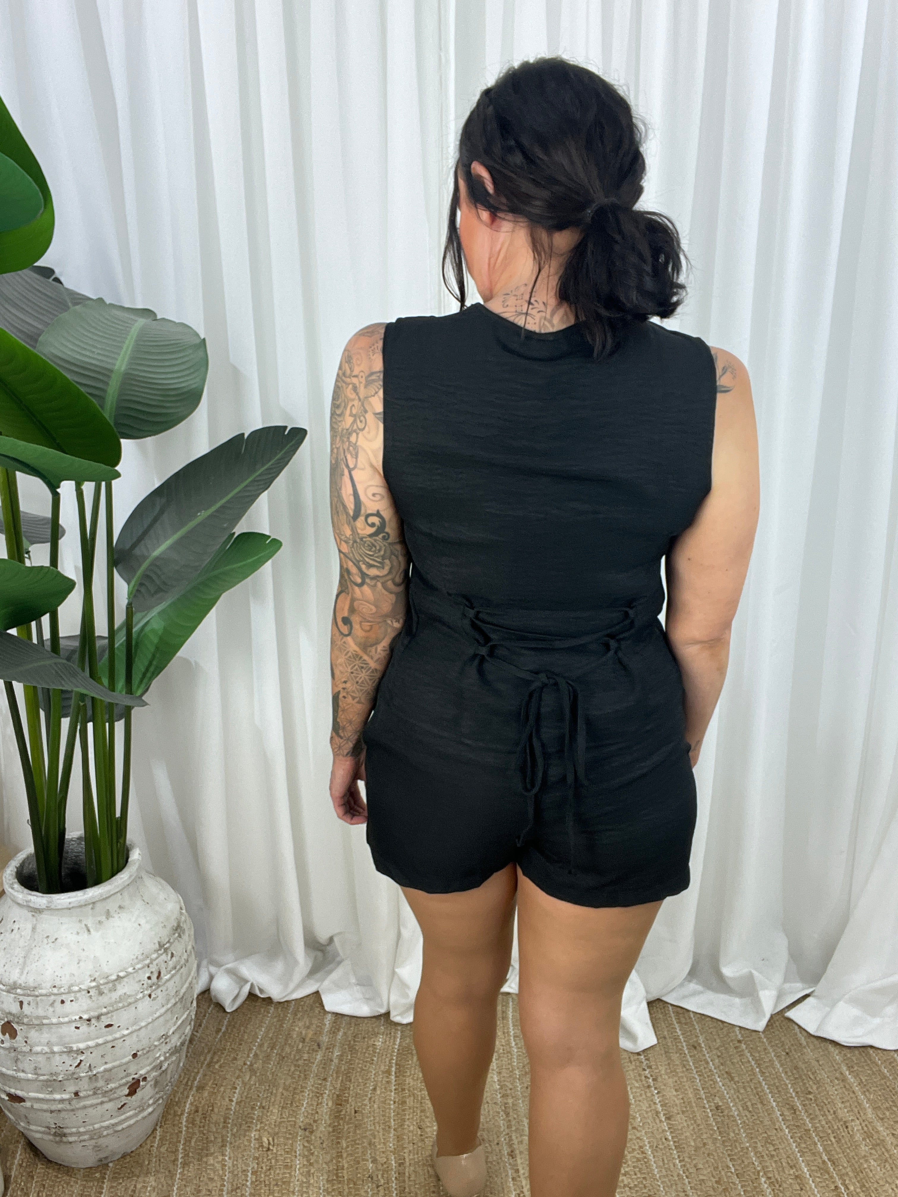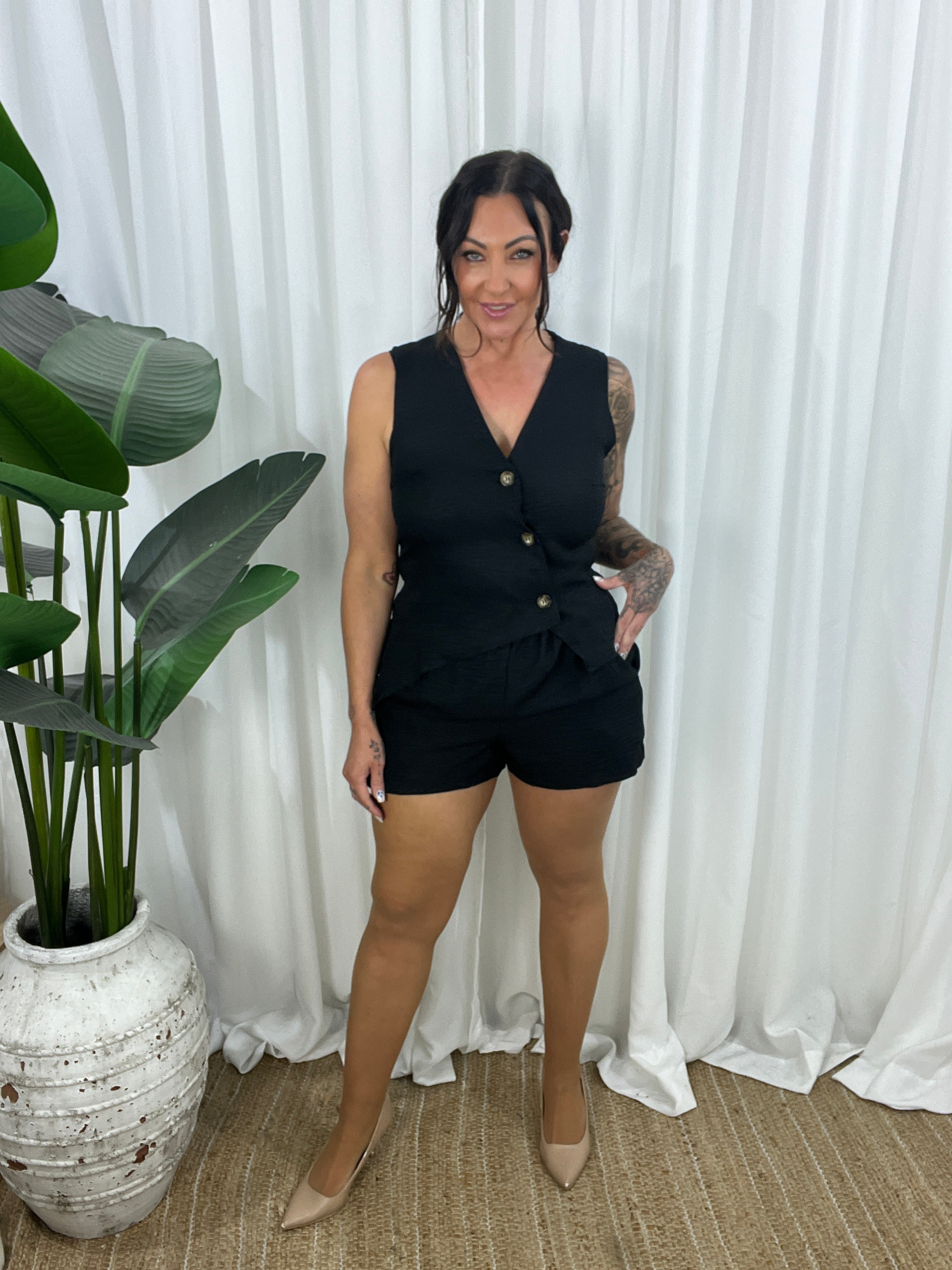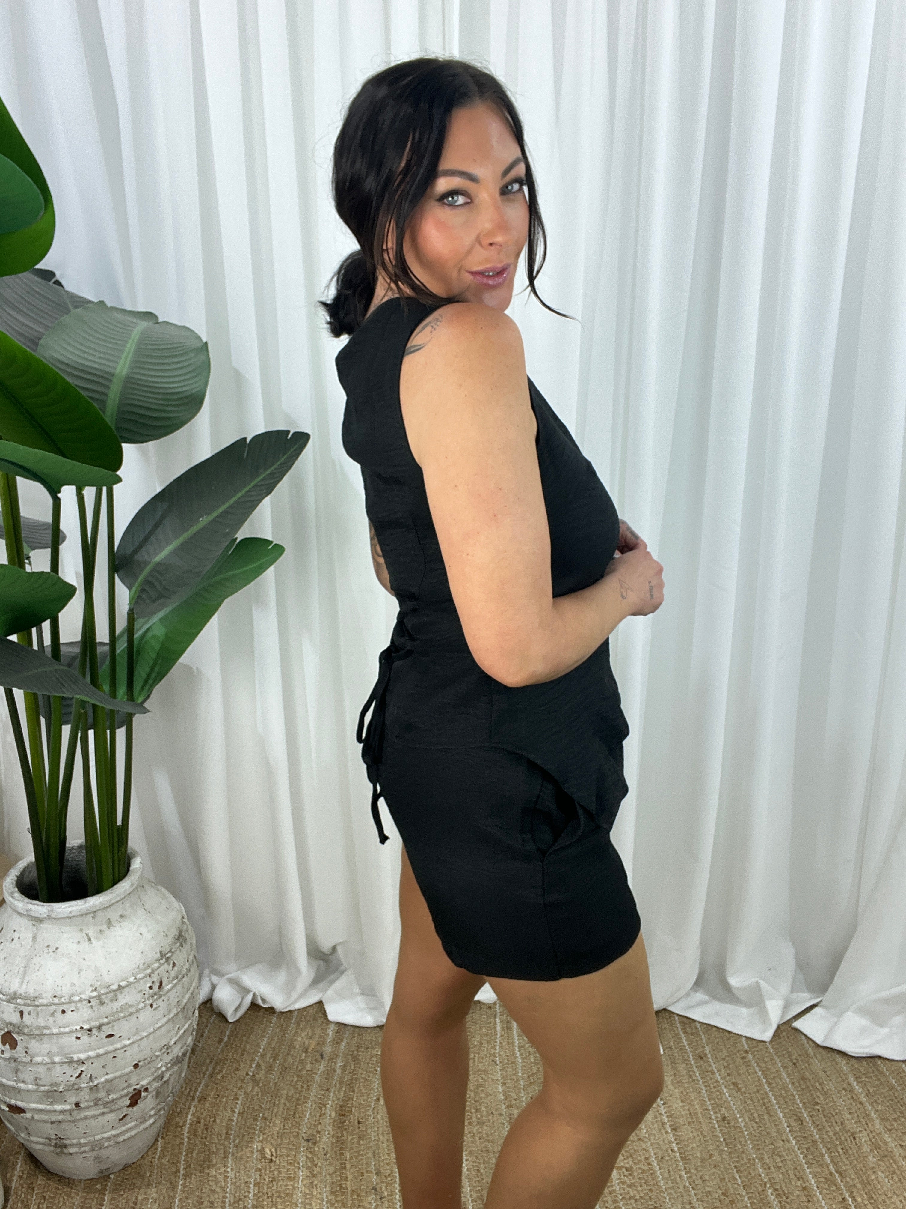 The shorts feature a booty-length cut, elasticated waistband, and functional pockets, while the button-up vest offers a flattering V neckline and a criss-cross tie detail at the back for a touch of unexpected charm.