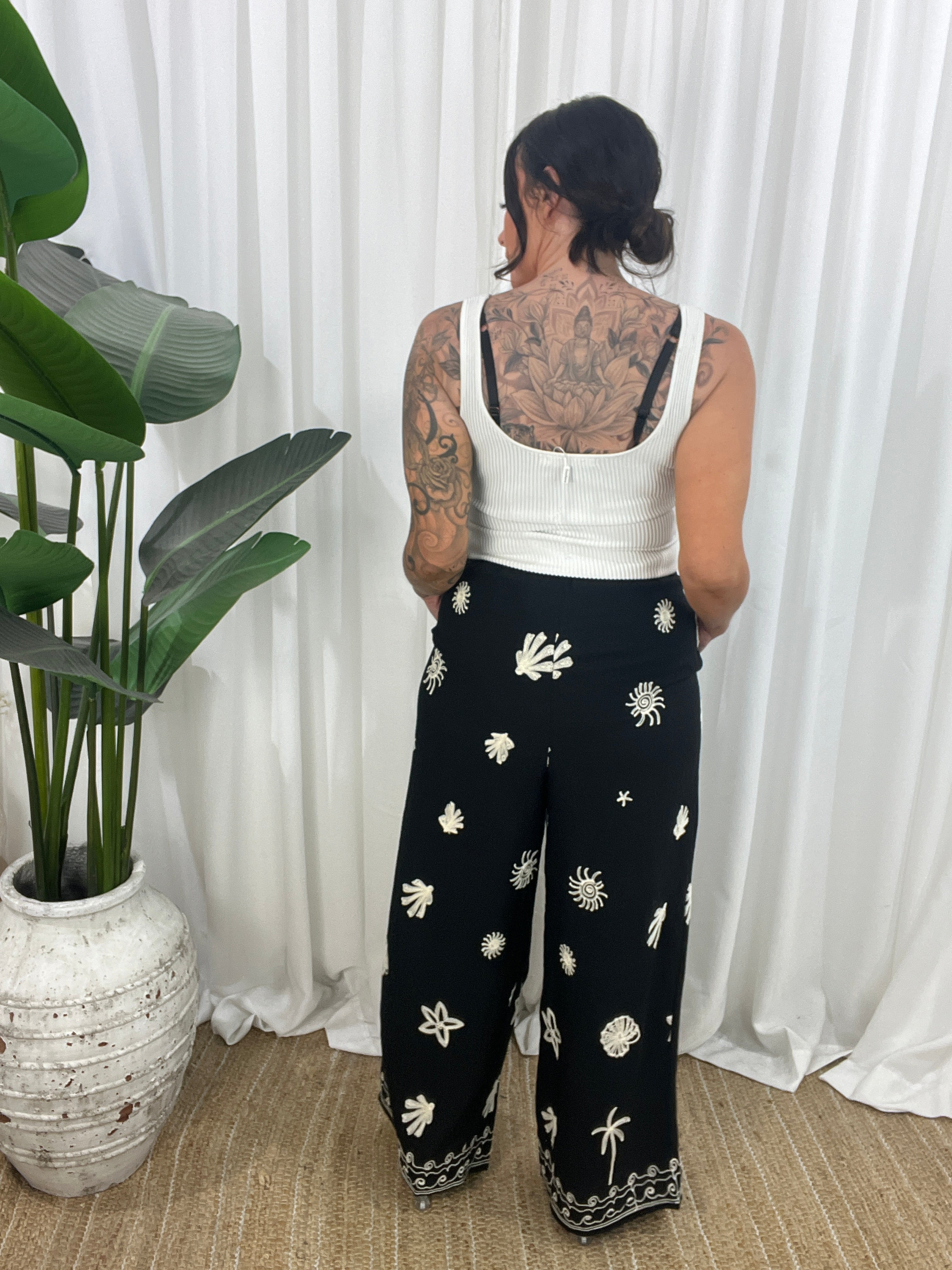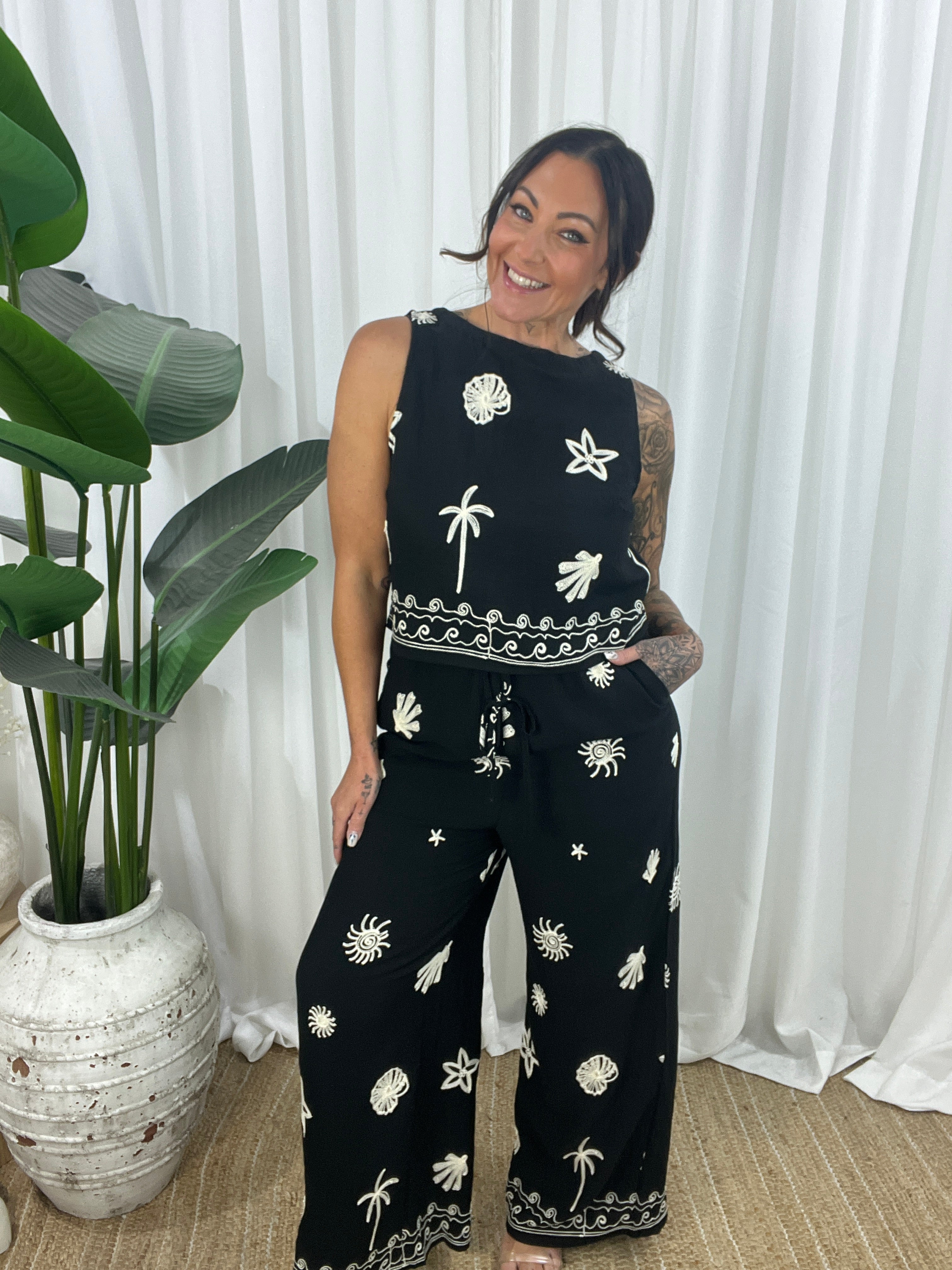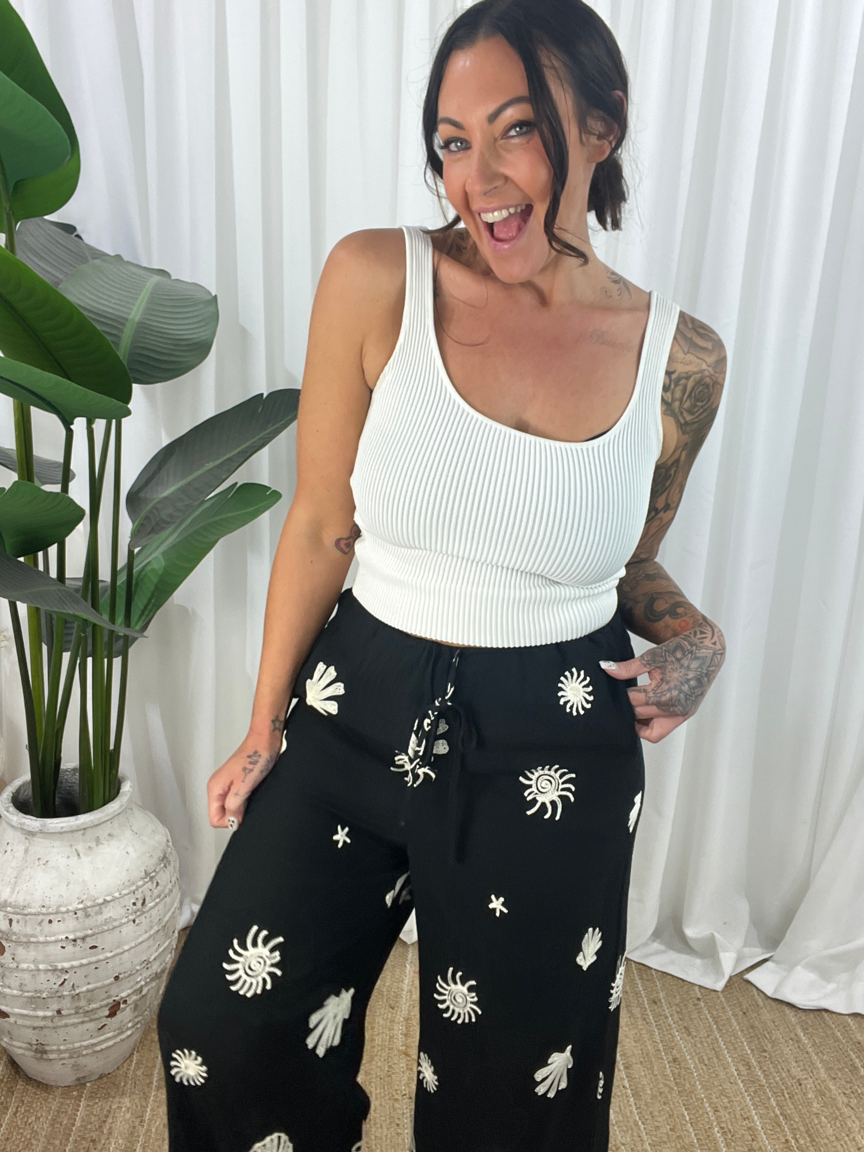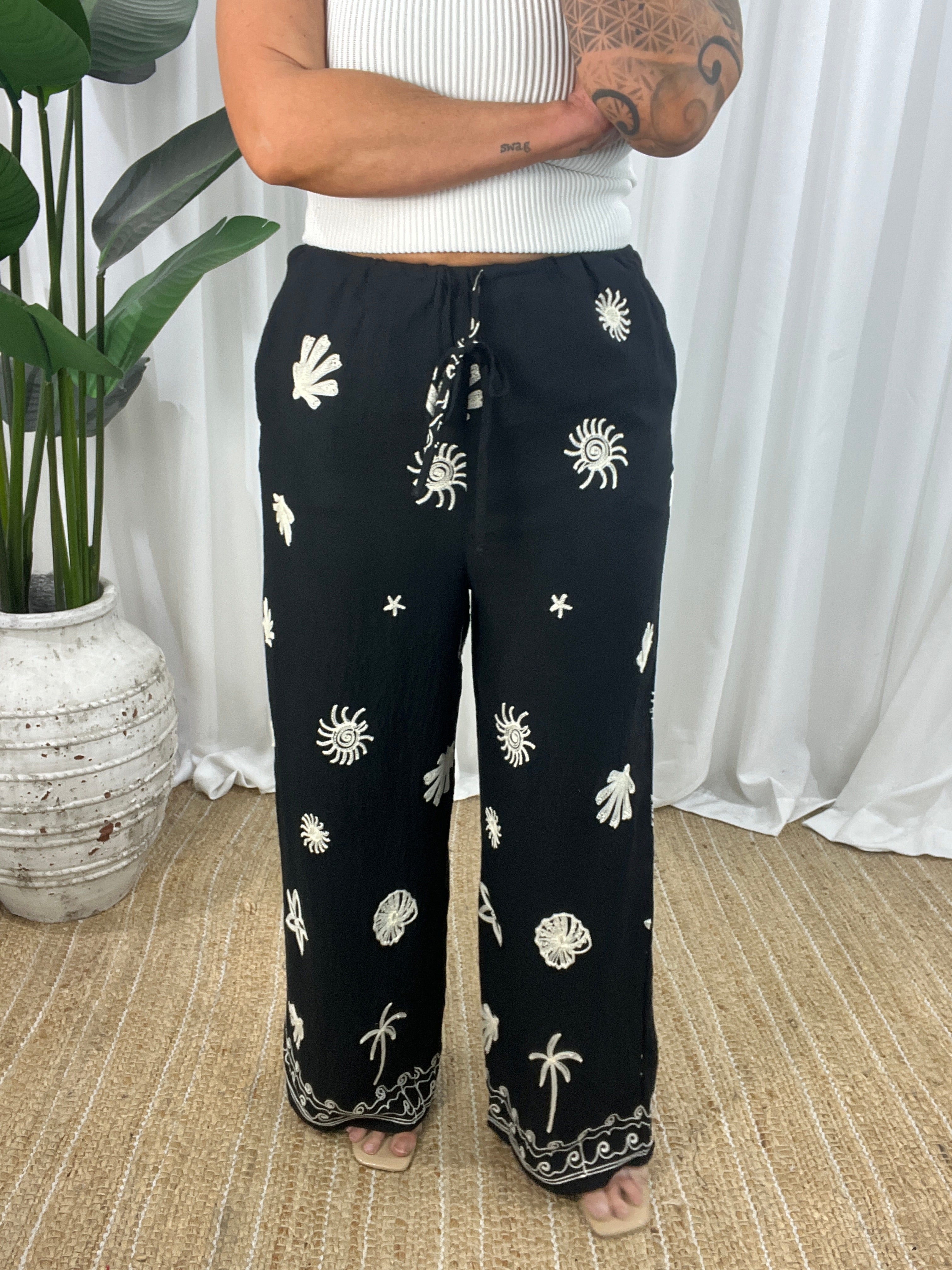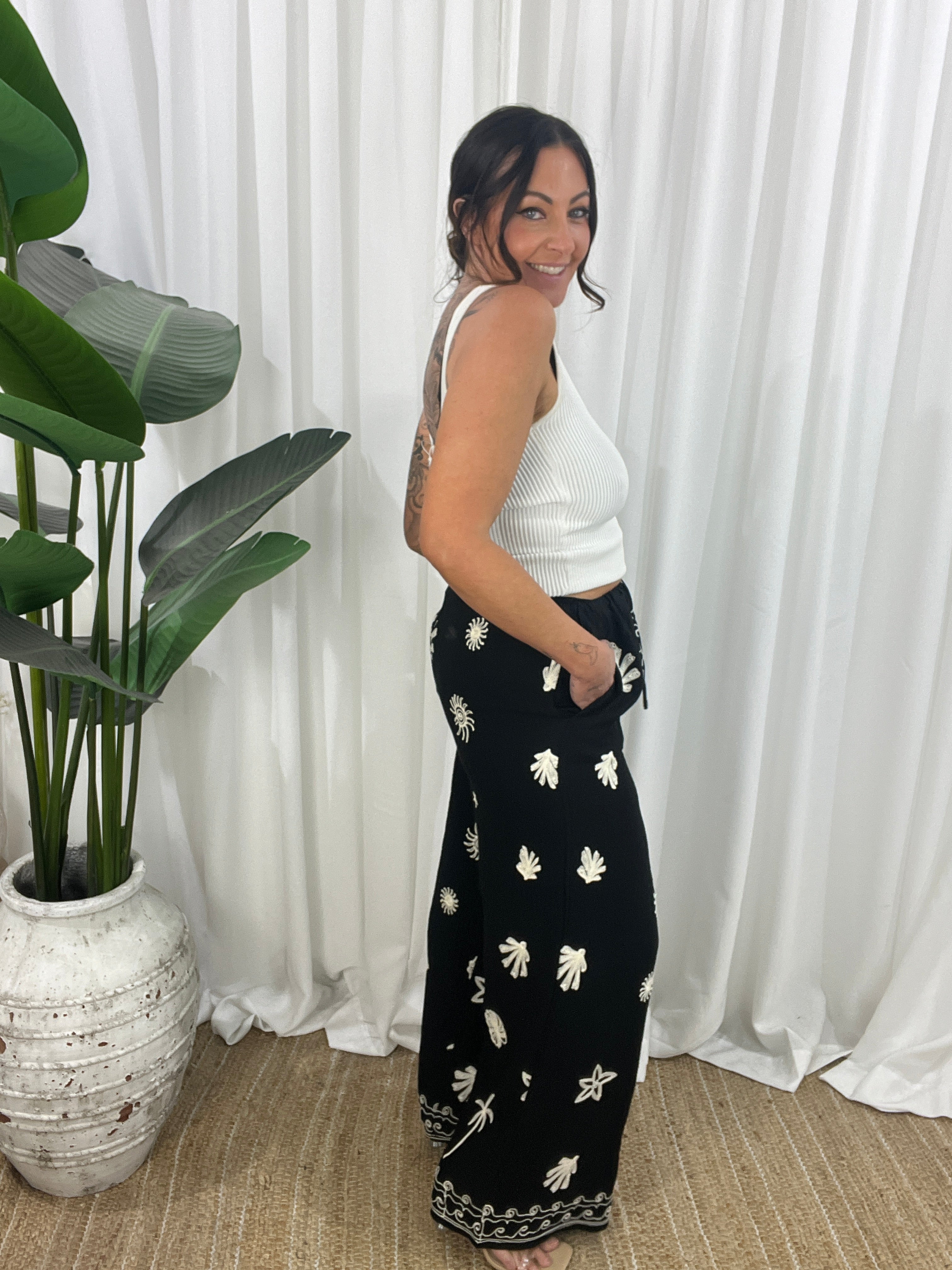 The Sandy Days pants are a sophisticated loungewear pants with cute embroided detail. These versatile fully lined pants are perfect for the spring/summer season.. The pants feature a relaxed wide leg, with a comfortable pull-on style, elasticated waist with tie detail, and essential pockets. The Sandy pants: perfect for those who love versatile, comfortable, and stylish pieces that can easily transition from day to night. Whether you’re heading out for a casual outing or a special event, this set will make you look and feel fabulous.