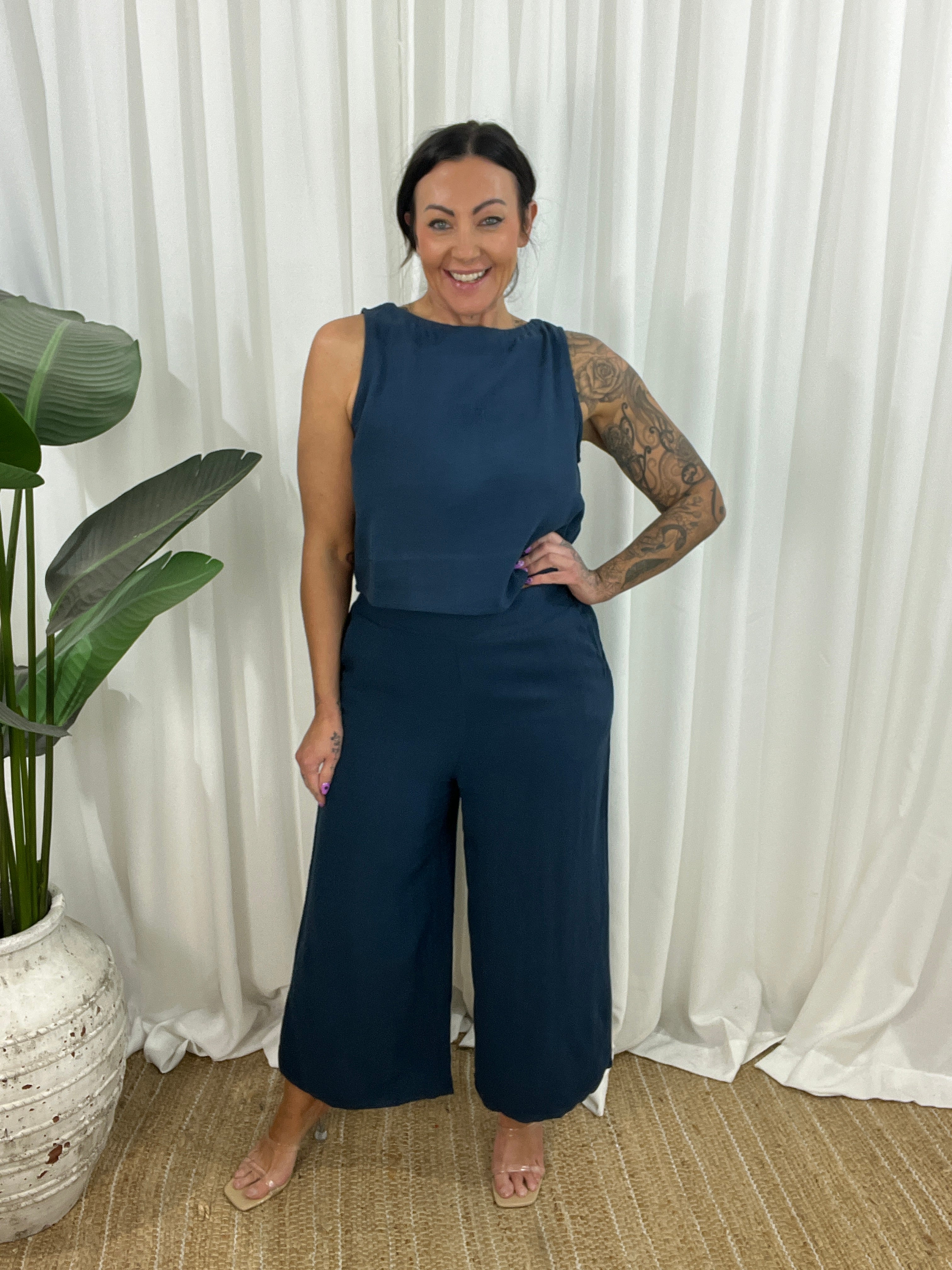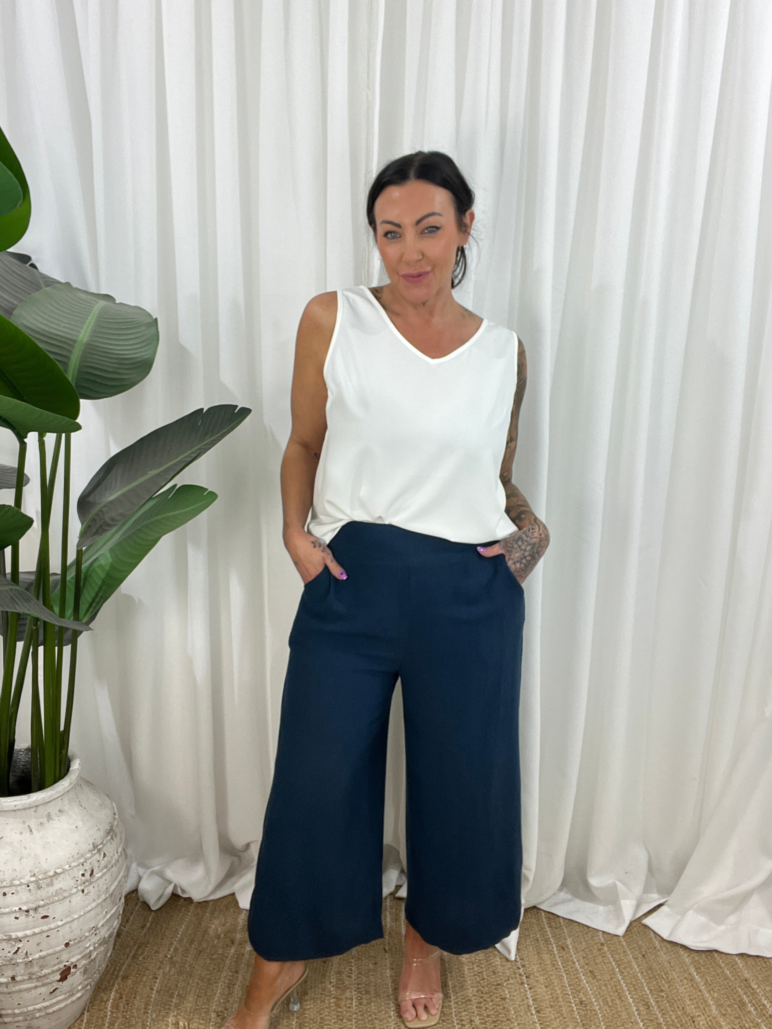The Pheobe wide leg pants are a sophisticated linen blend piece. These versatile pants are perfect for the spring/summer season. The pants feature a relaxed wide leg, 7/8th length depending on height, with a comfortable pull-on style, flat front, elasticated shirred back, and essential pockets.