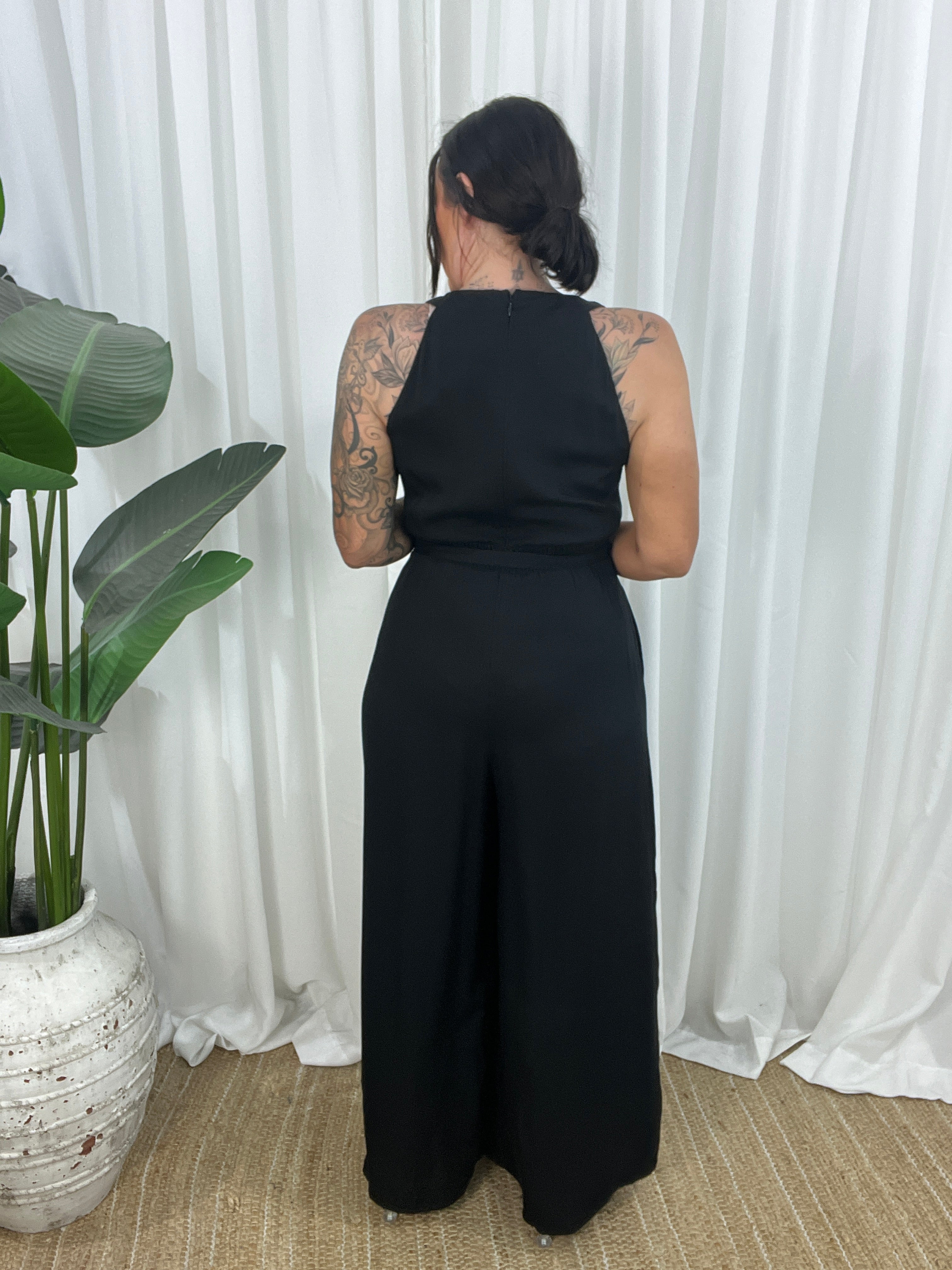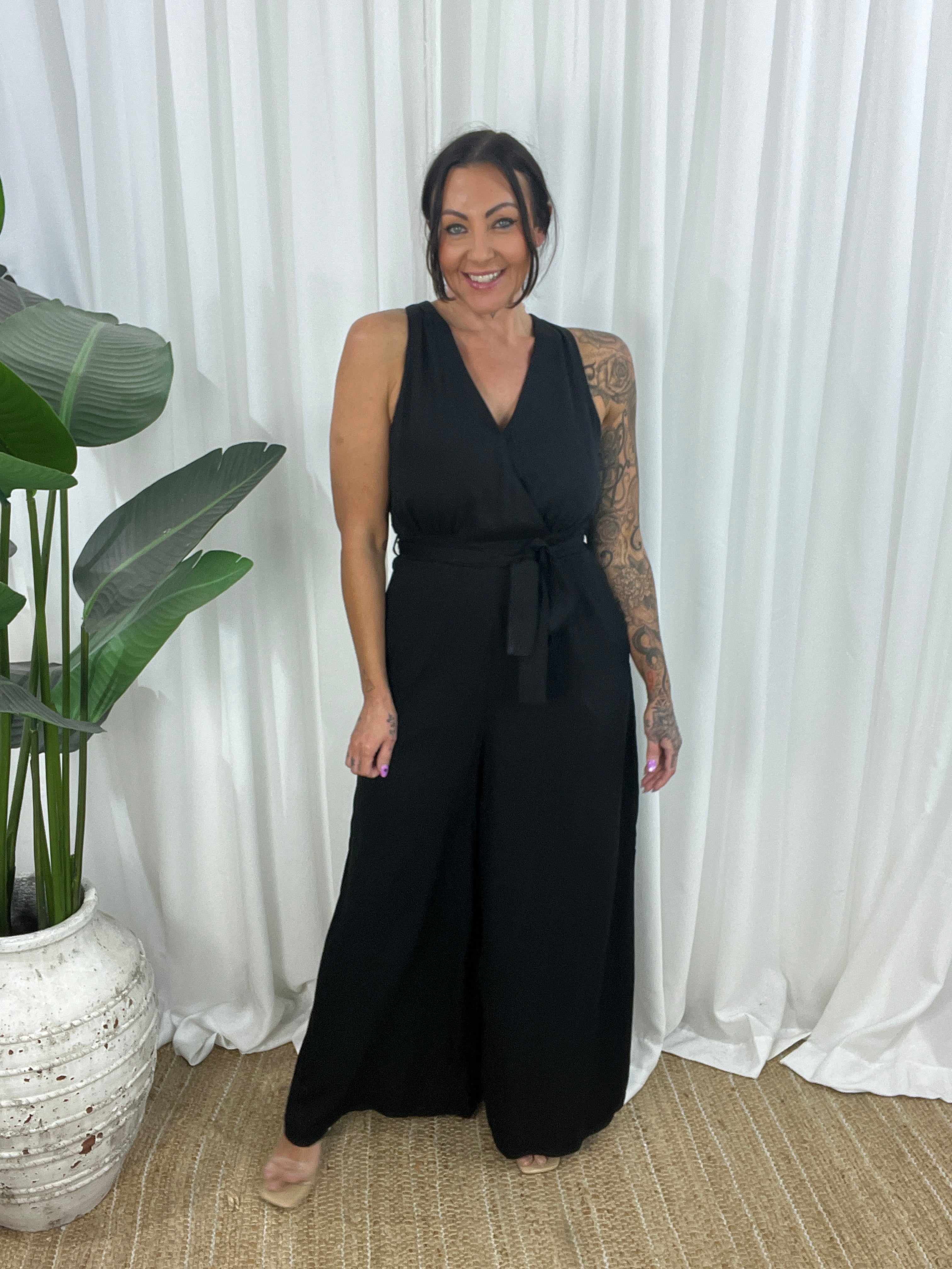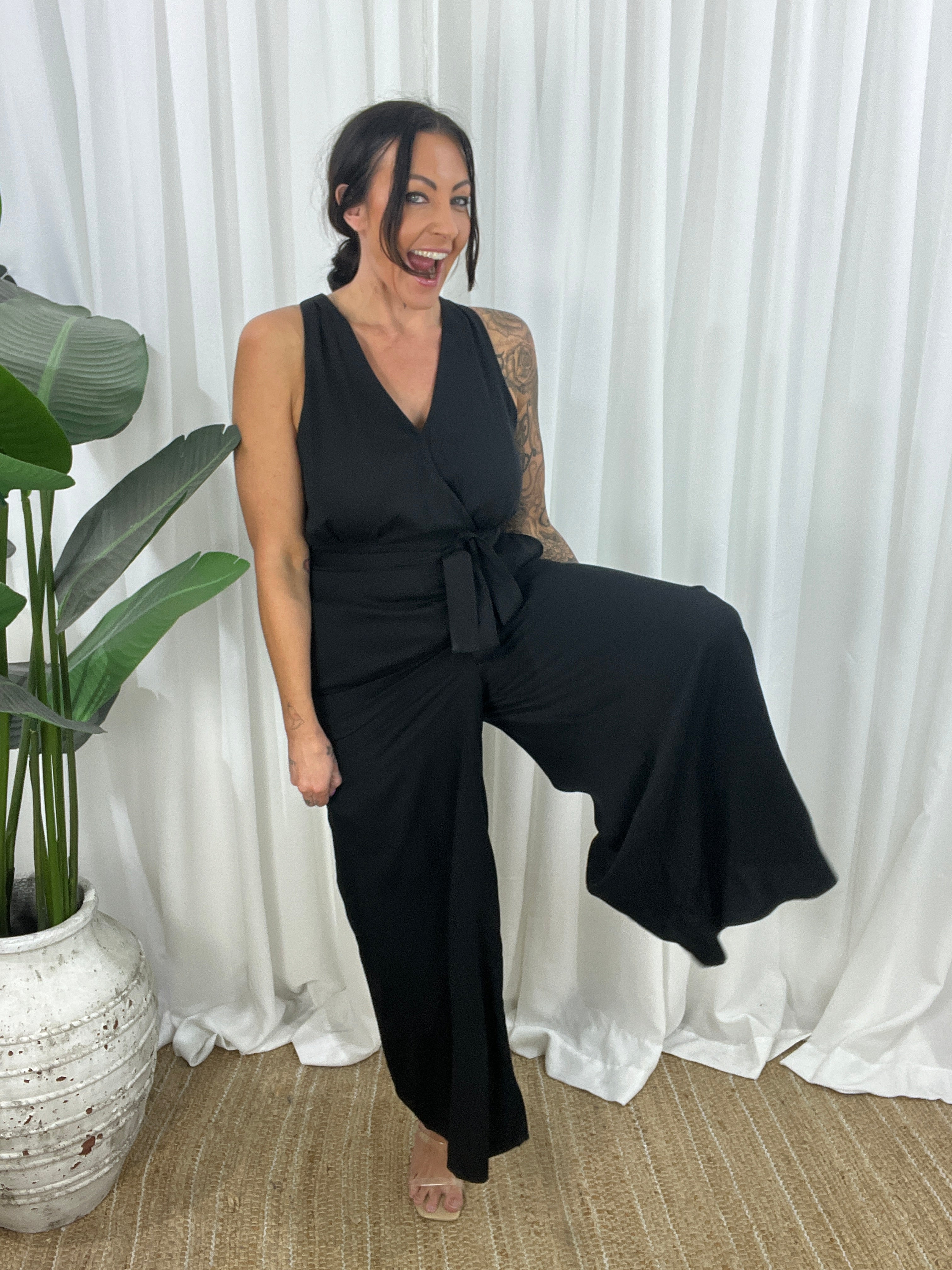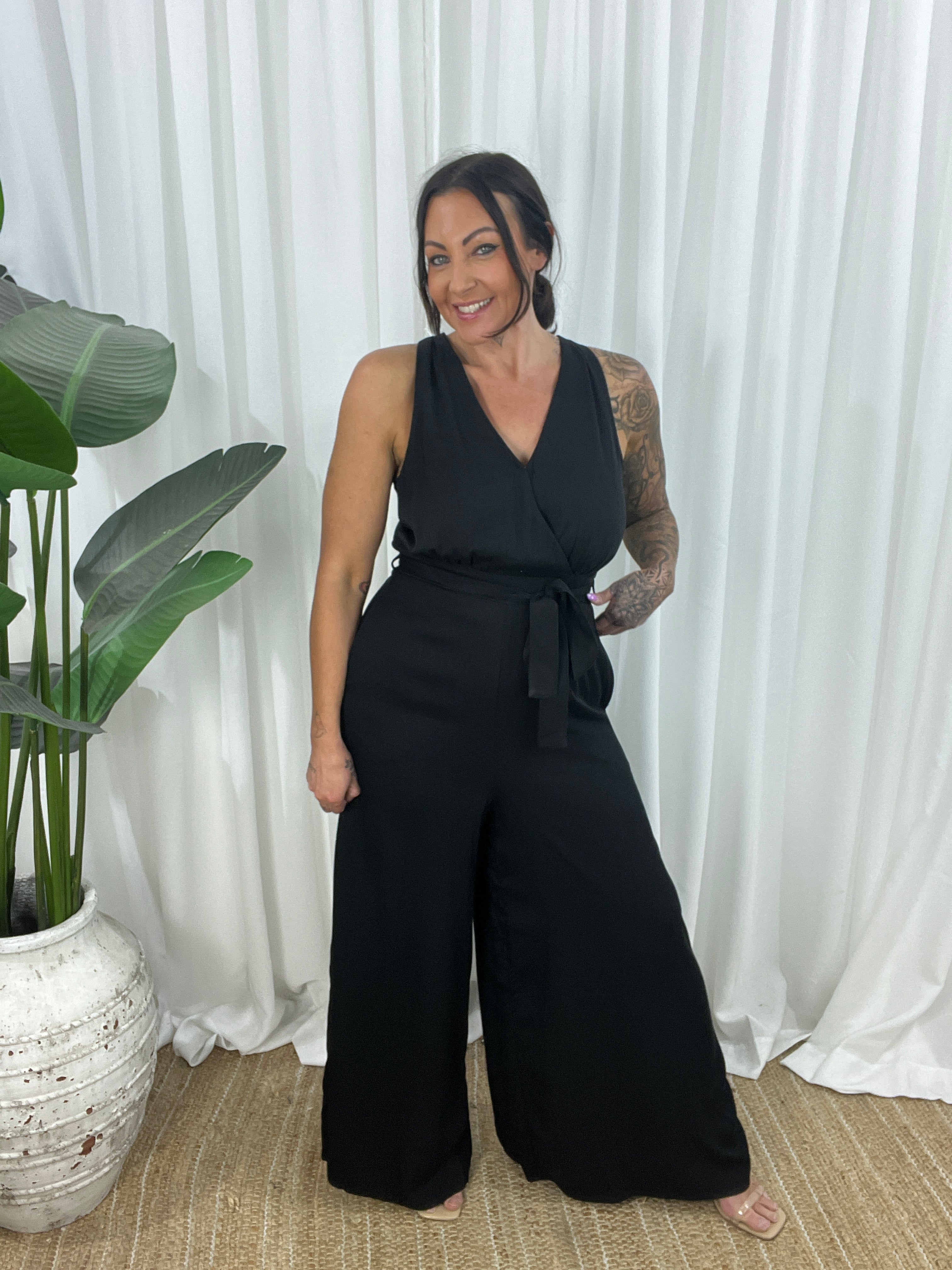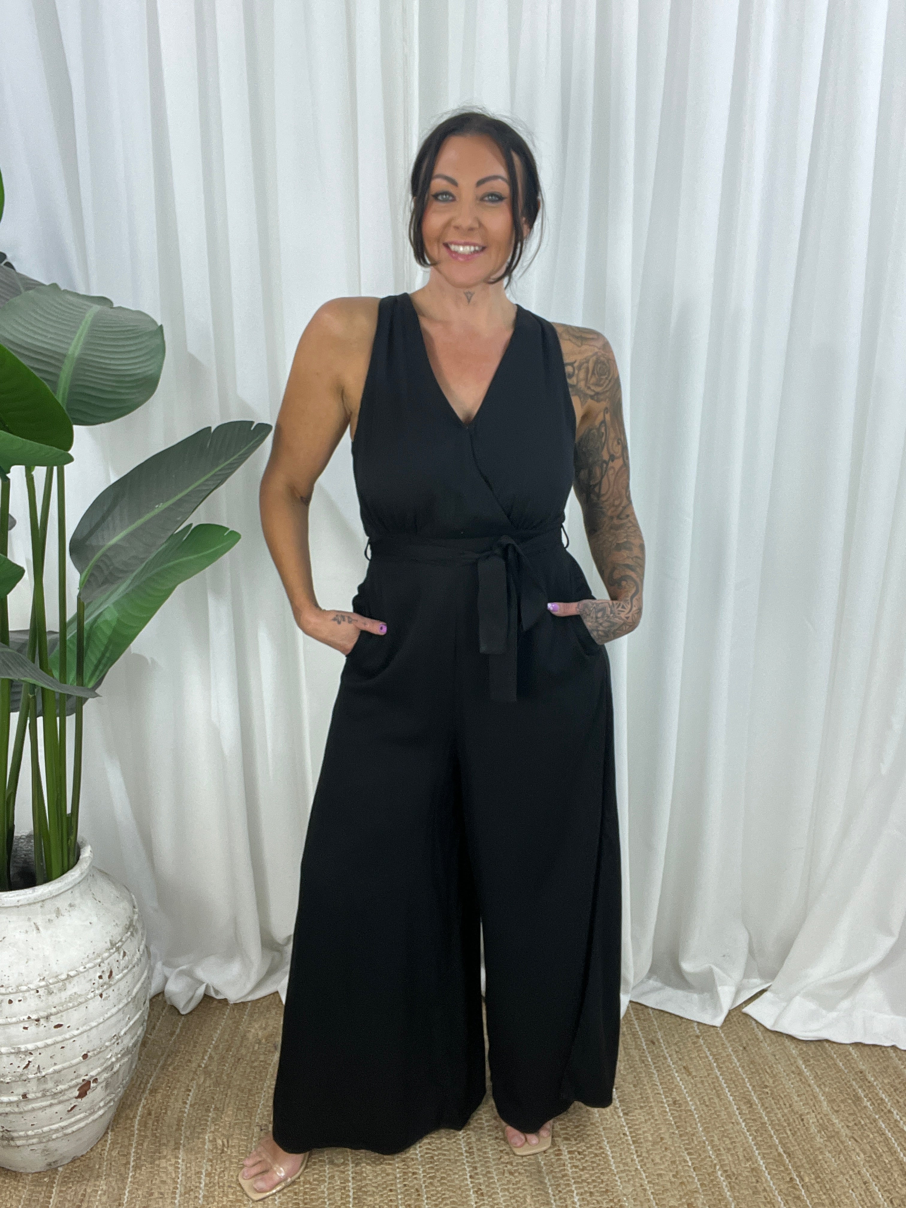 Introducing the Pixie Jumpsuit, a stunning slim-fit piece that effortlessly combines elegance and comfort. This jumpsuit features a fitted bodice with a slightly wide leg, creating a flattering silhouette that suits all body types. Cross over race style top with hook and eye to decure the bust opening. Empire linewith tie detail. Zip in rear with a small elastic band for comfort.