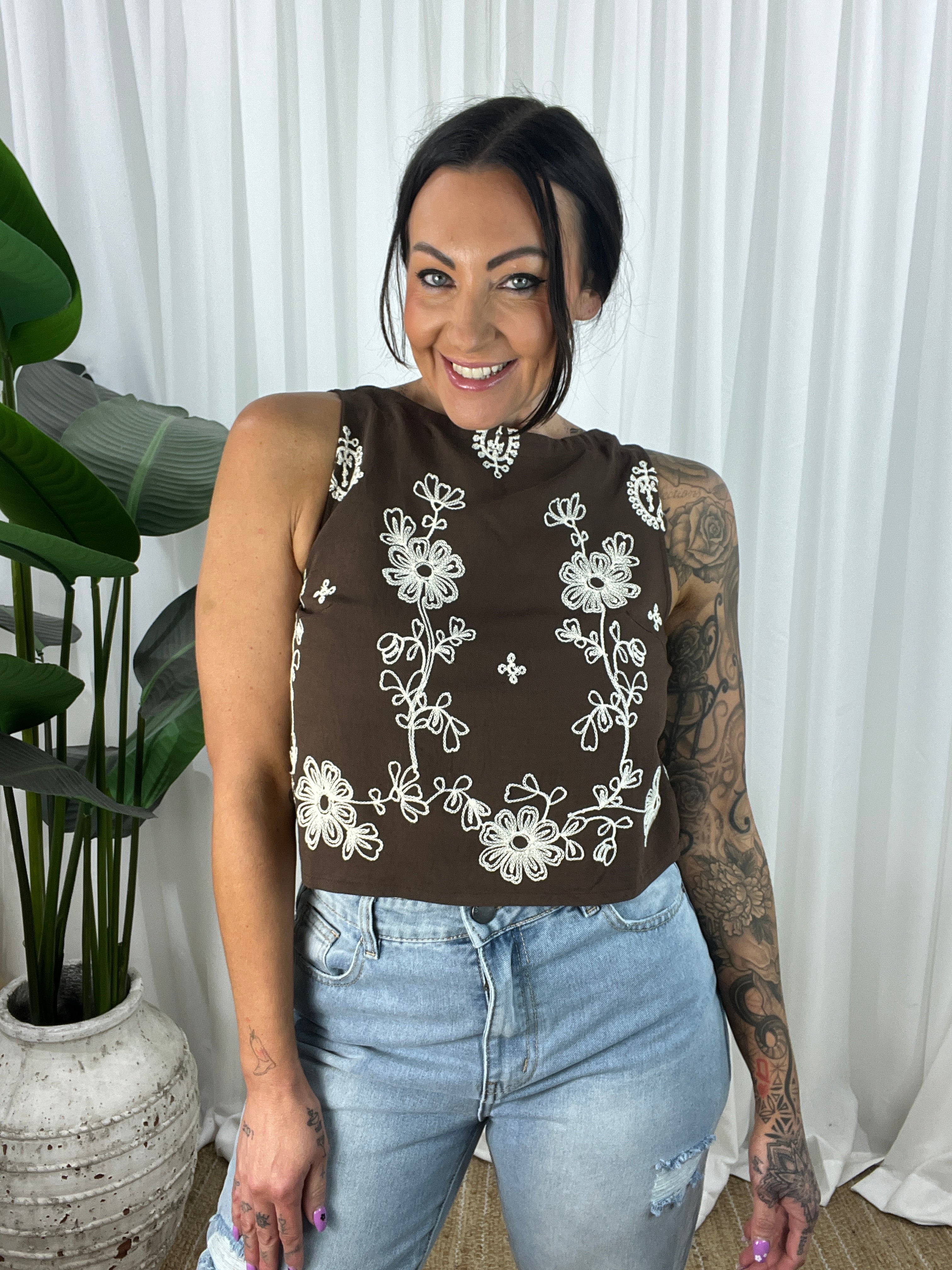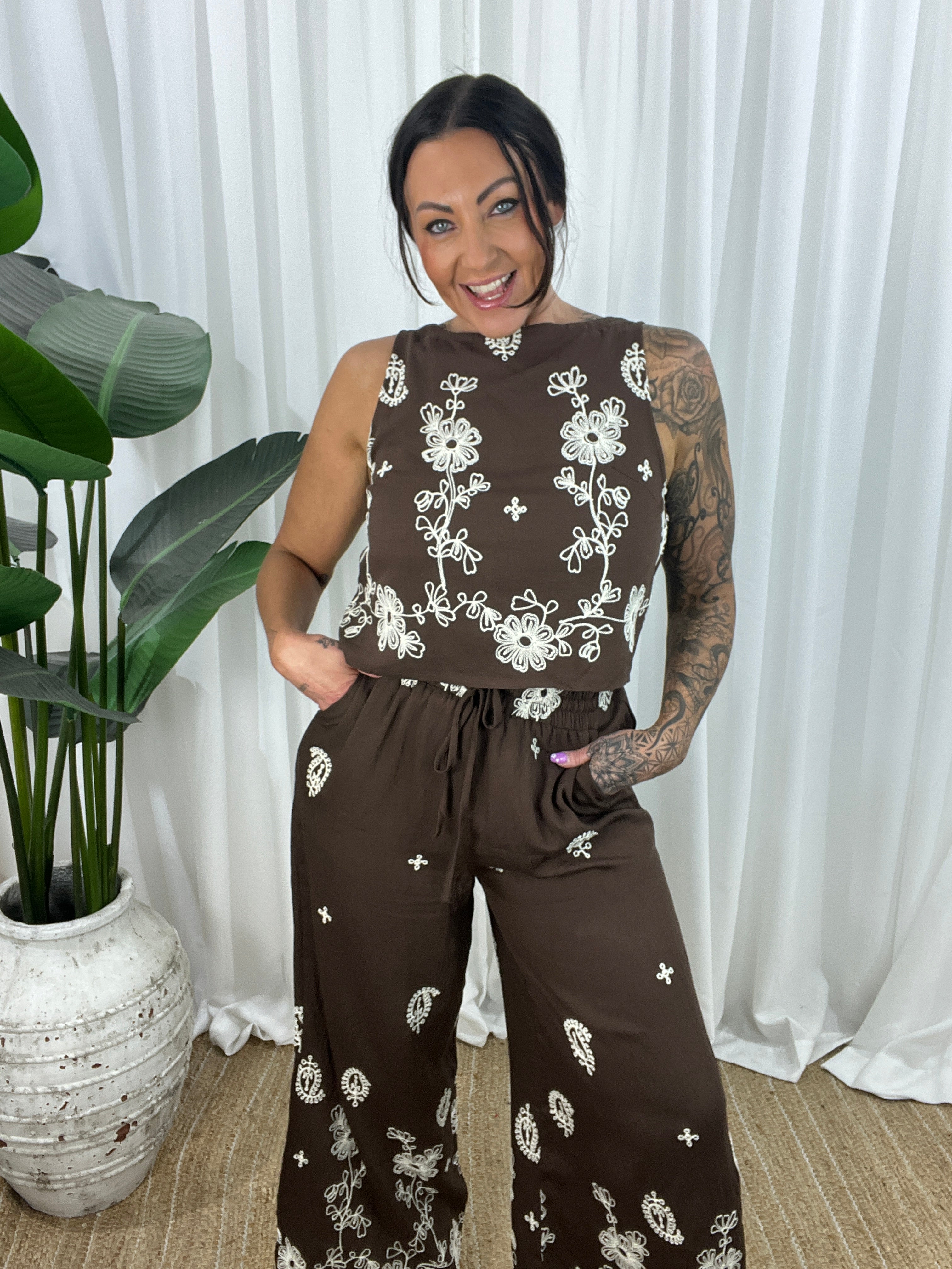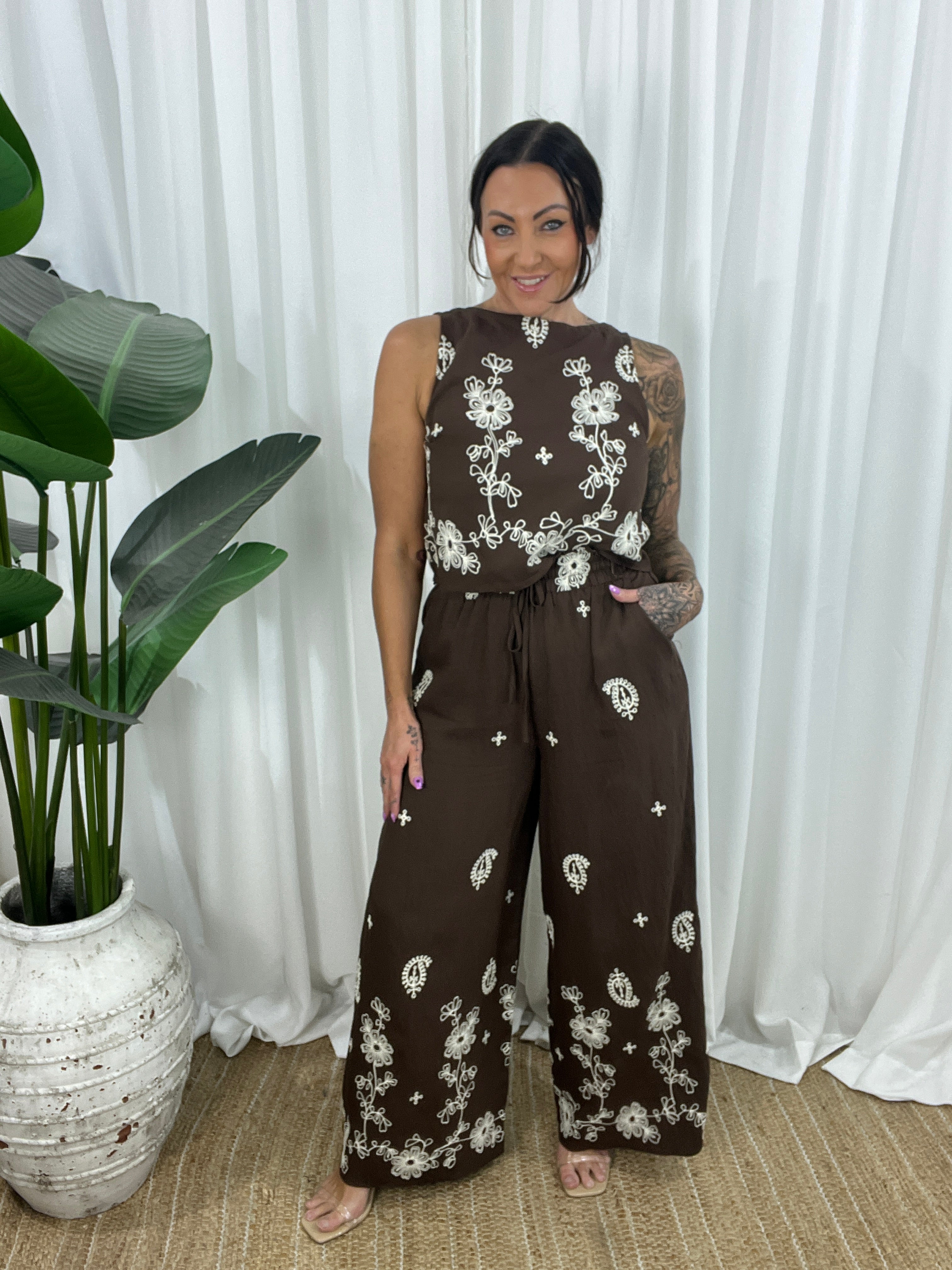 - Embroided Detail: Chovolate base with a cream embroided floral pattern