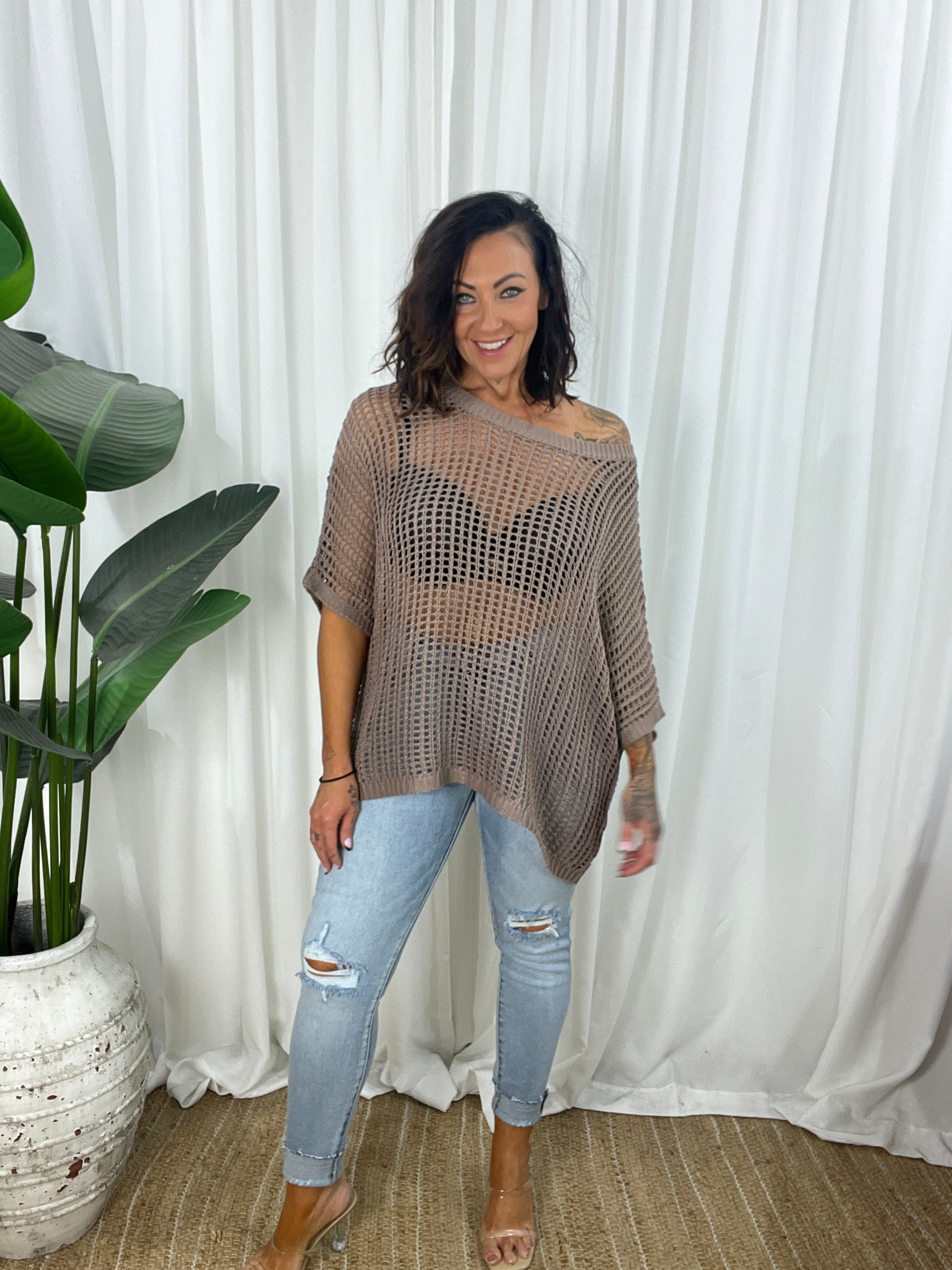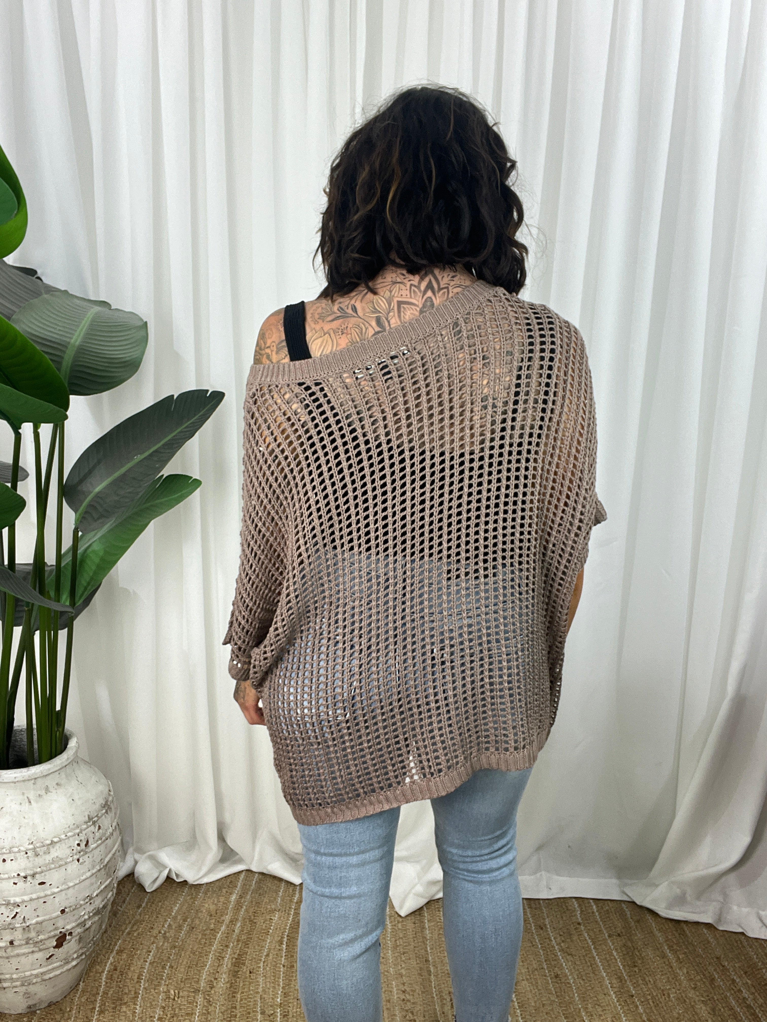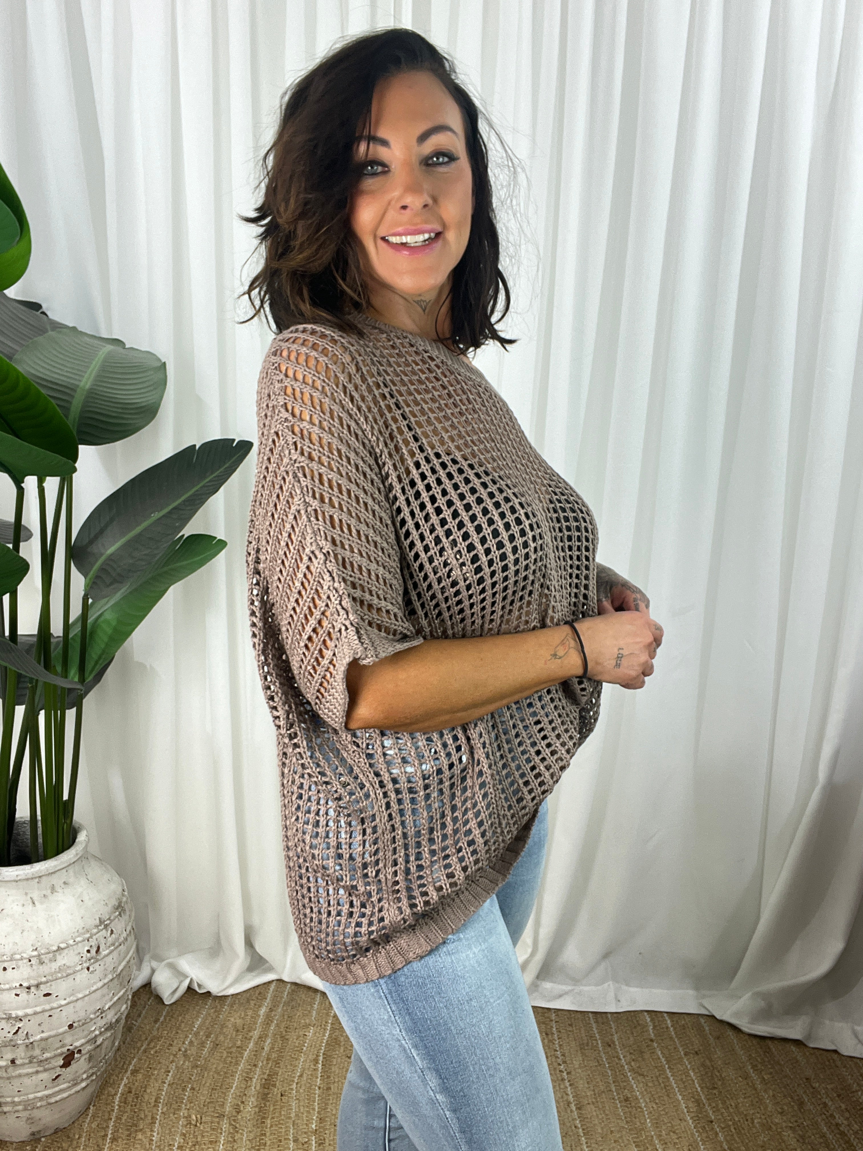 - Design : Relaxed cut, crochet look comfortable light weight loose open knit design. Gorgeous Mocha colour, wear just a bra or add a cami underneath
