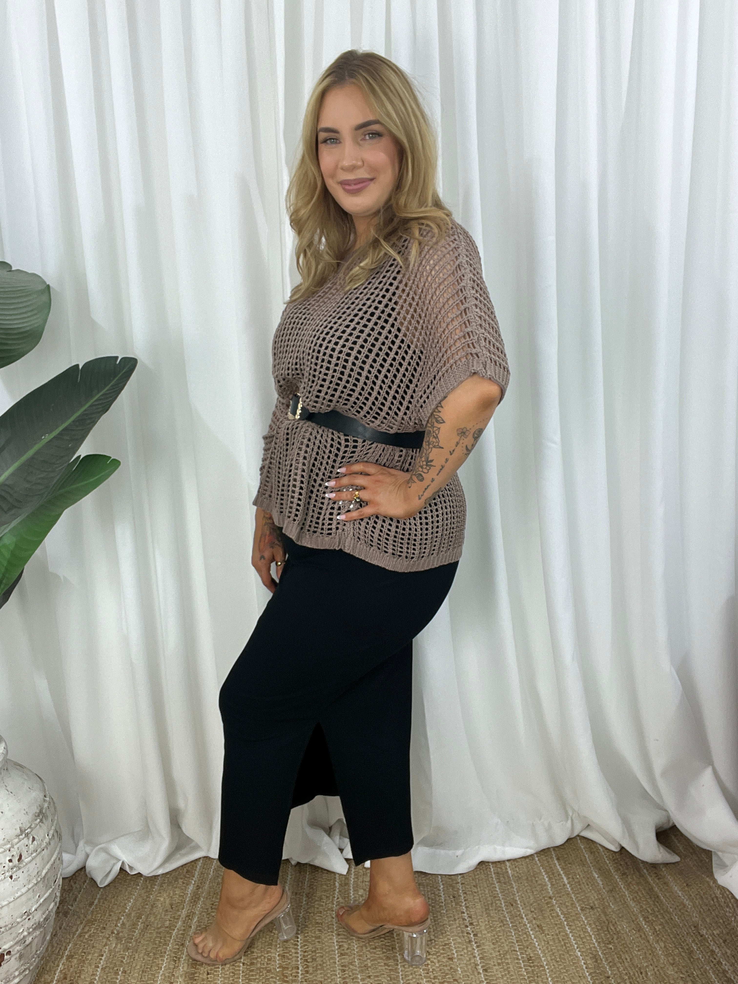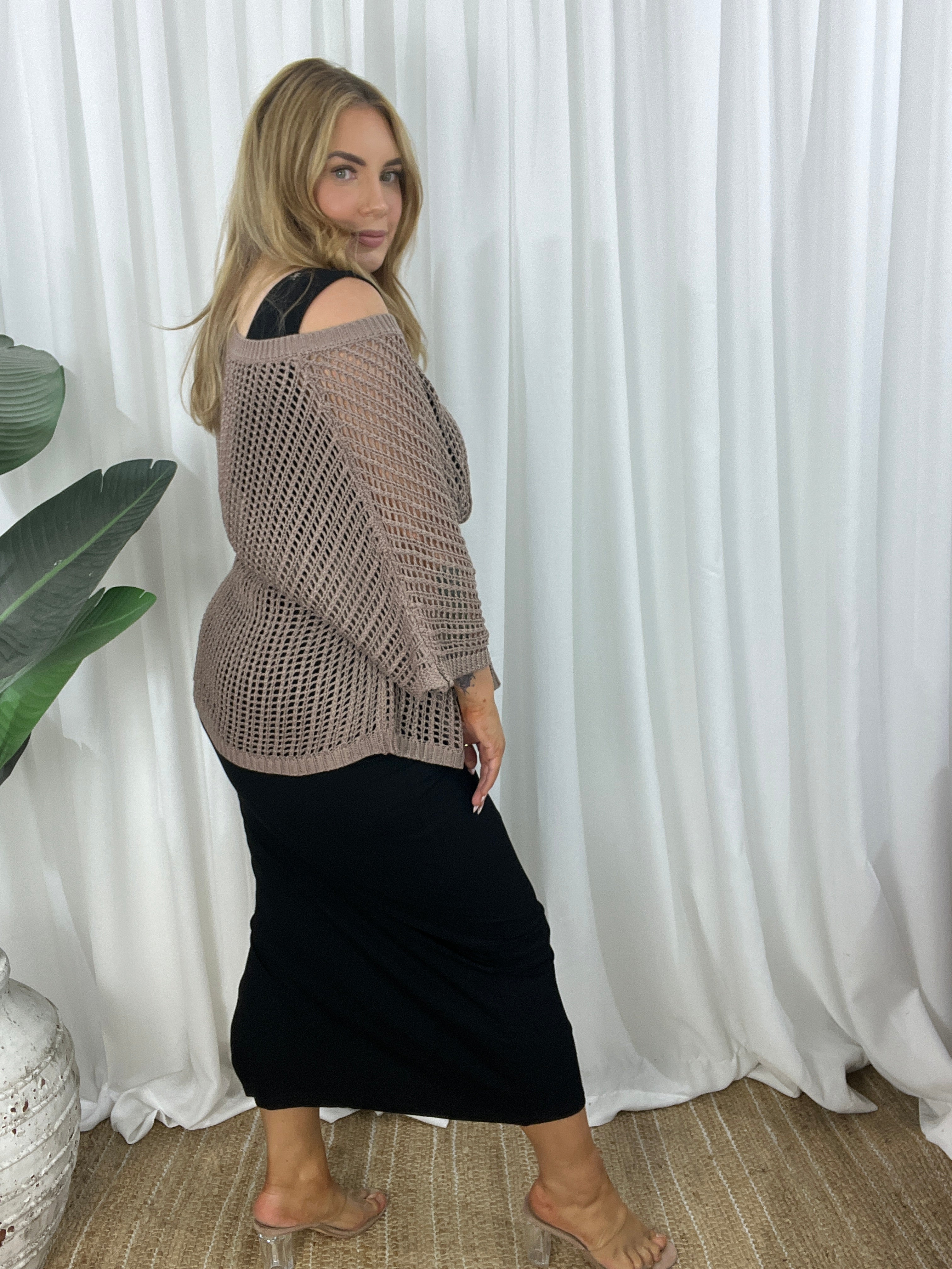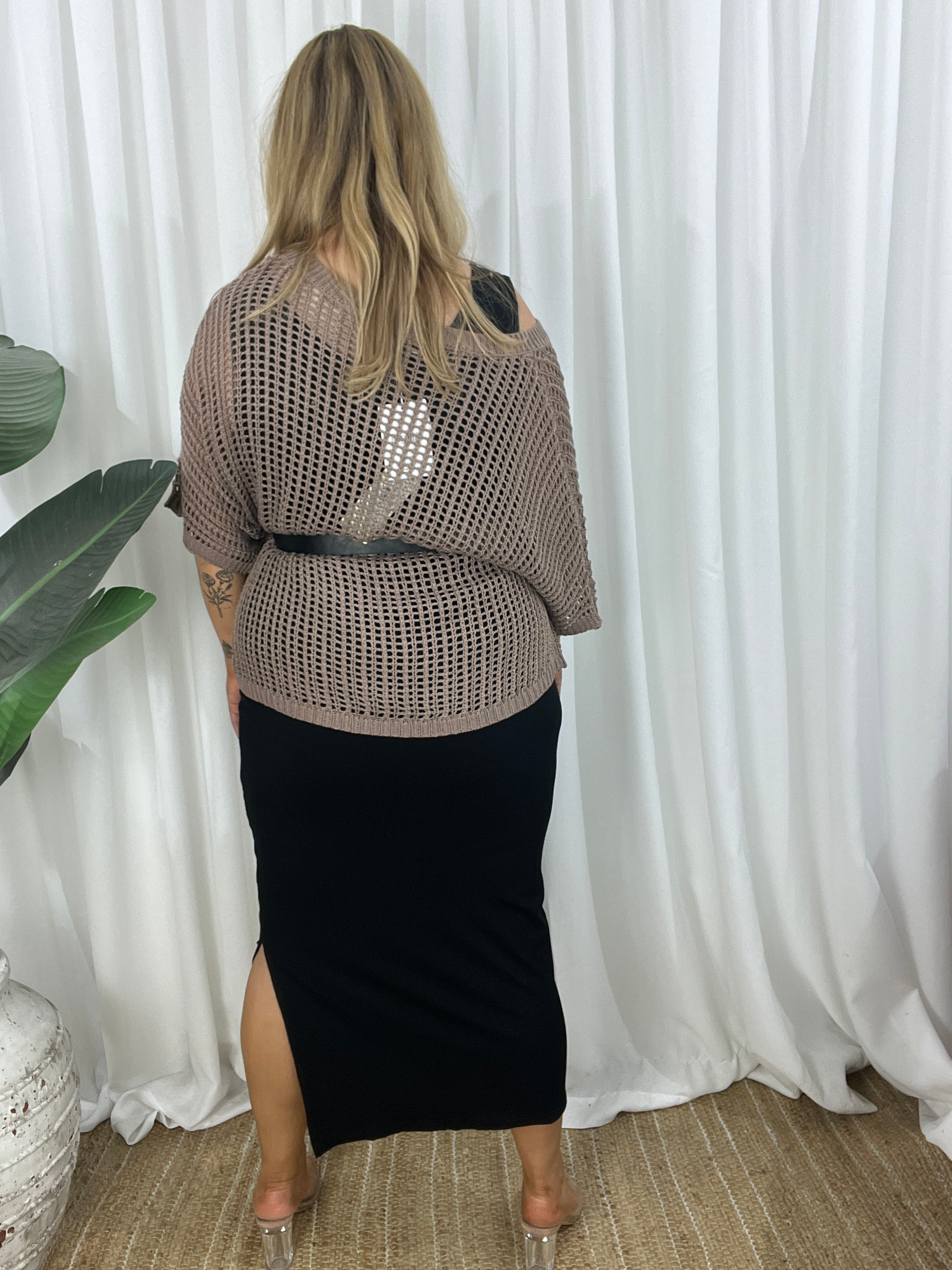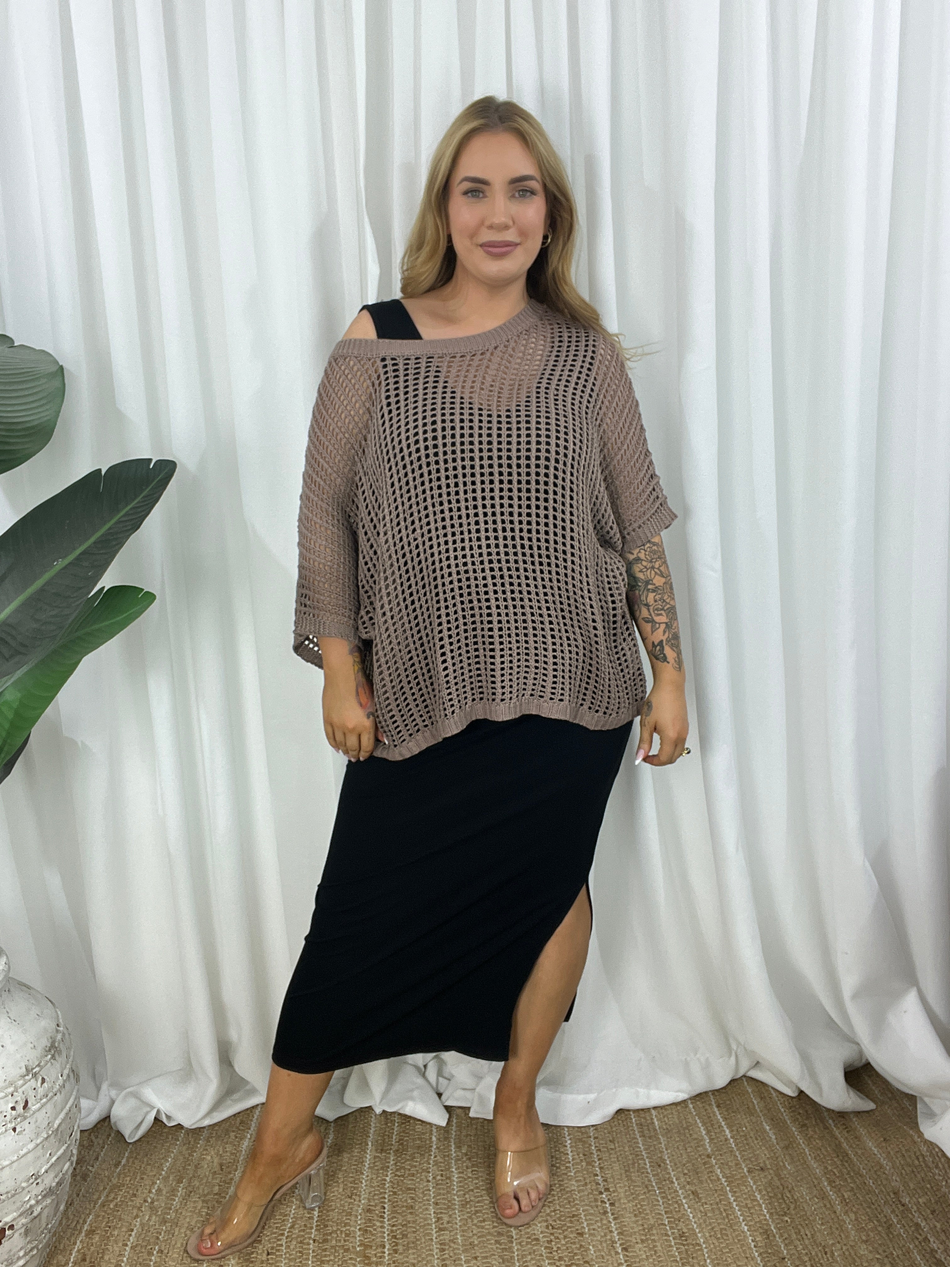 - Design : Relaxed cut, crochet look comfortable light weight loose open knit design. Gorgeous Mocha colour, wear just a bra or add a cami underneath