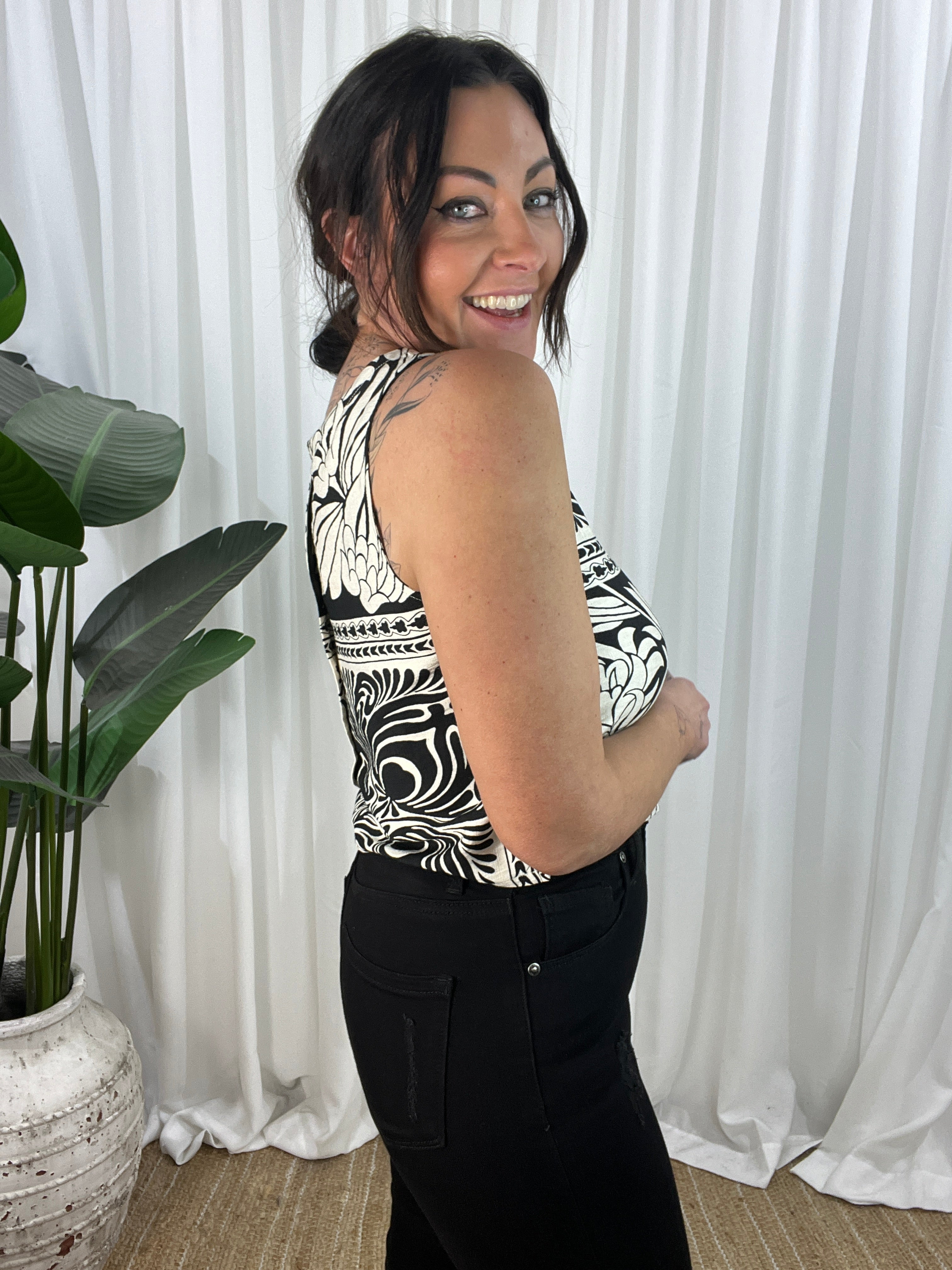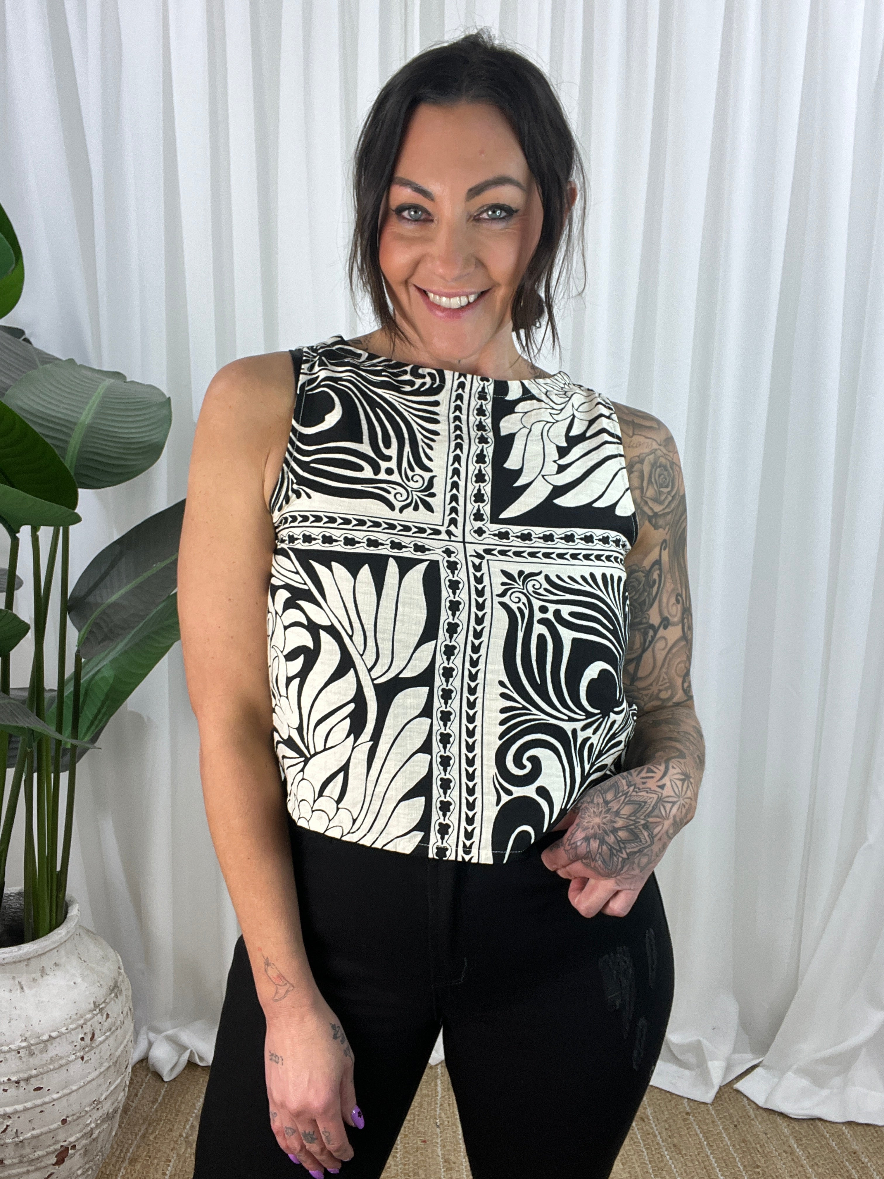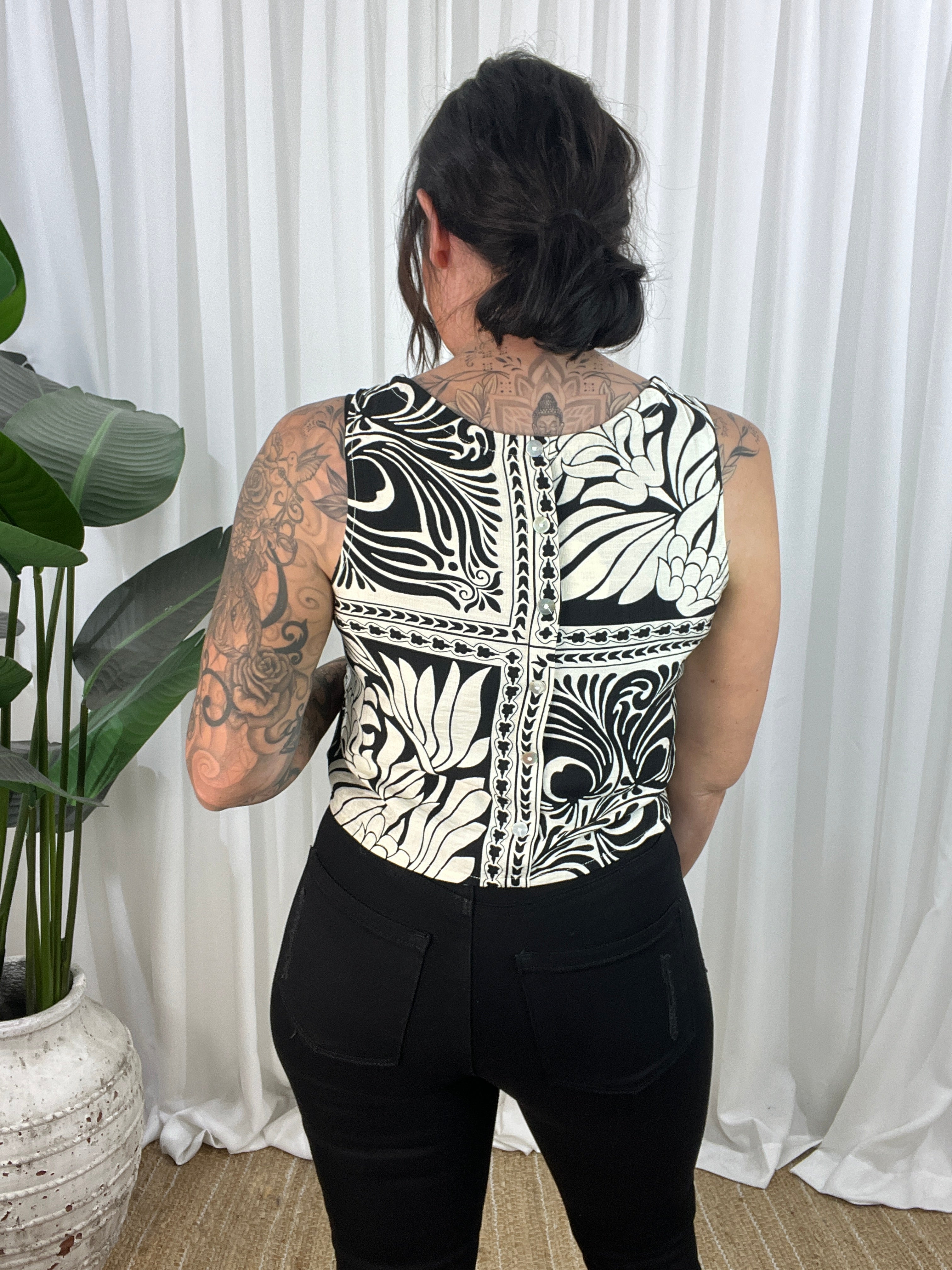 The Indigo Black top is a sophisticated light weight sleeveless top. This versatile Top is perfect for the spring/summer season. The top is a cropped design with a high neckline and non-functional buttons down the back for added style. Thicker straps ensure bra straps are covered, making it the perfect little top. Whether you’re heading out for a casual outing or a special event, this will make you look and feel fabulous.
