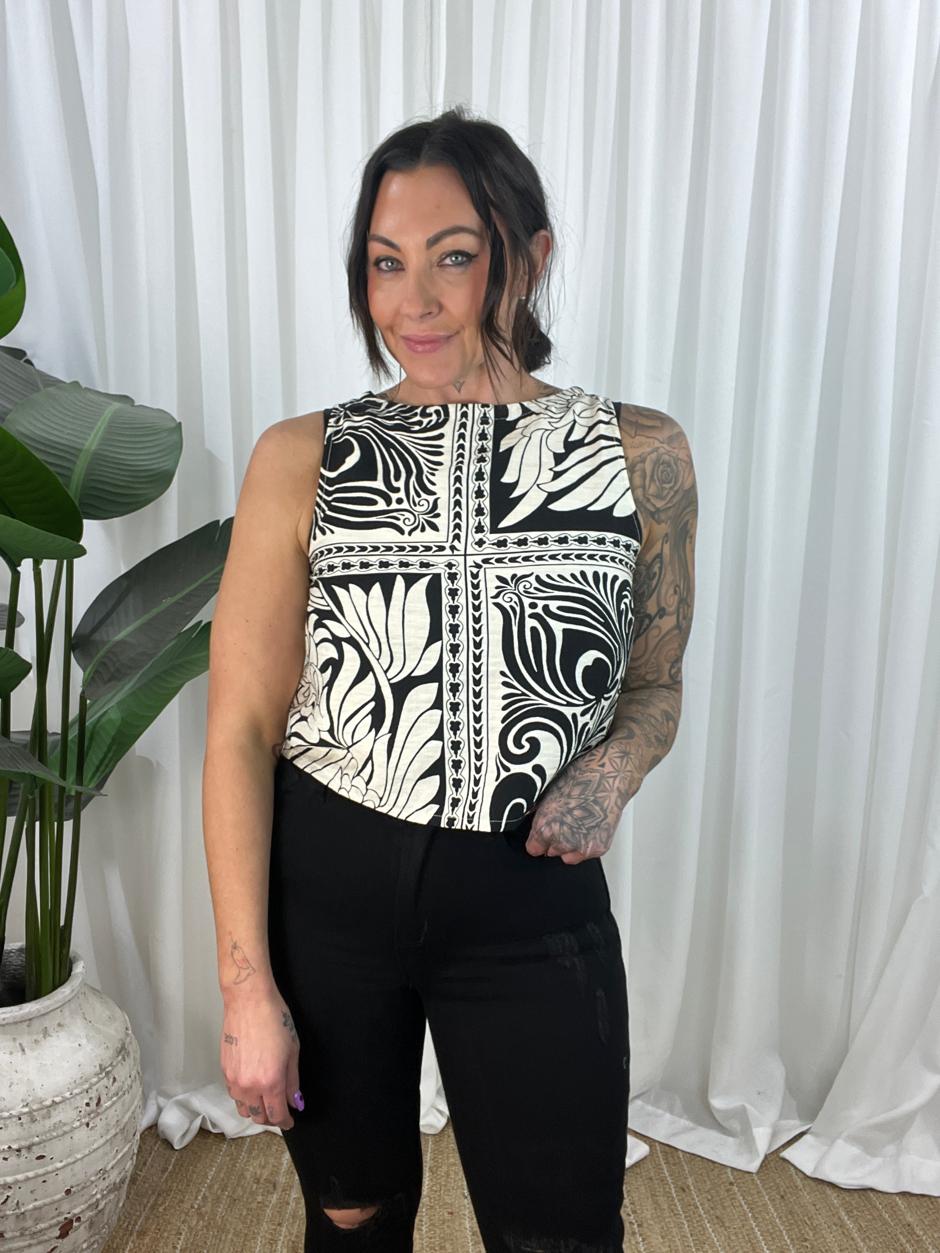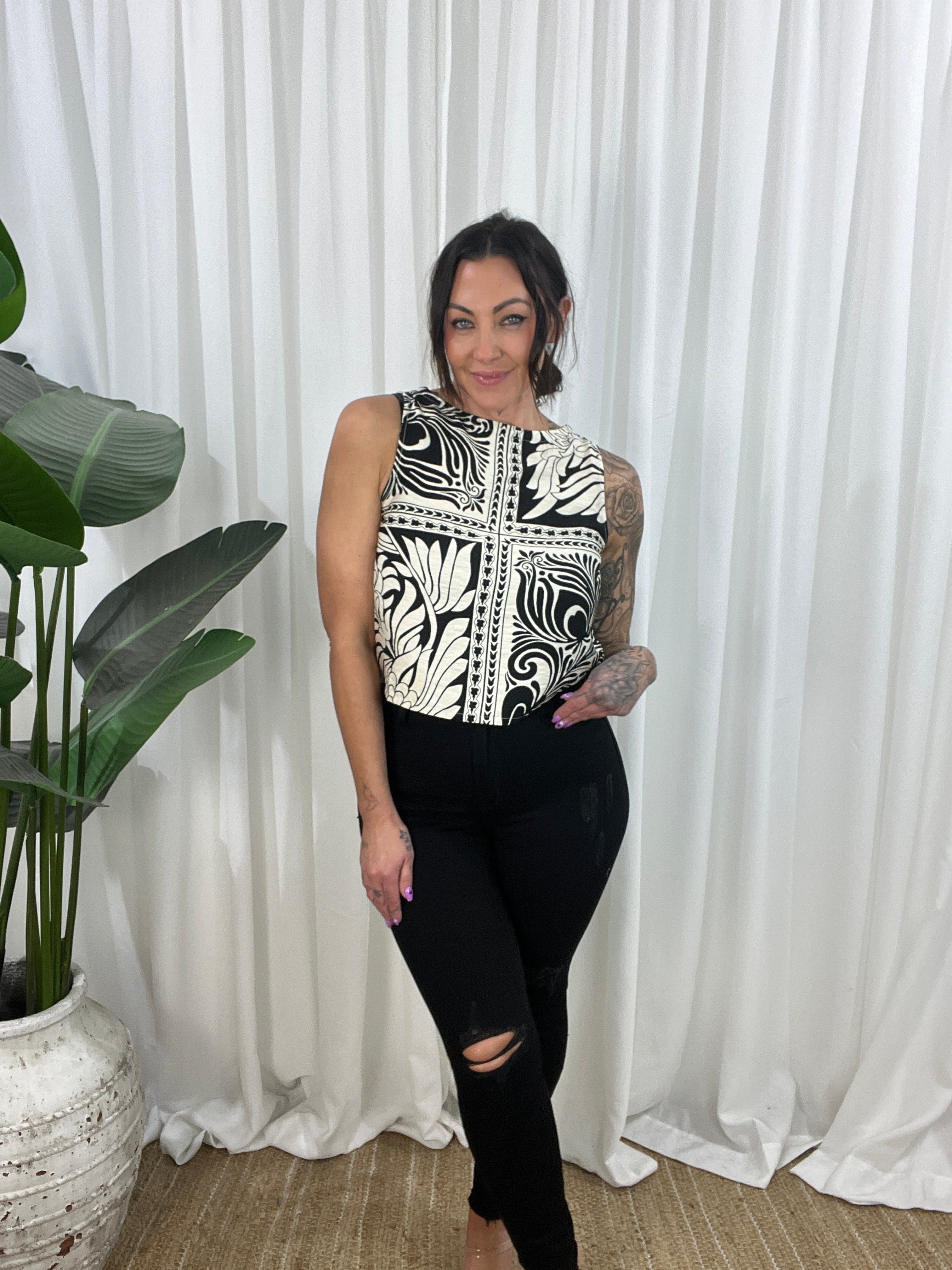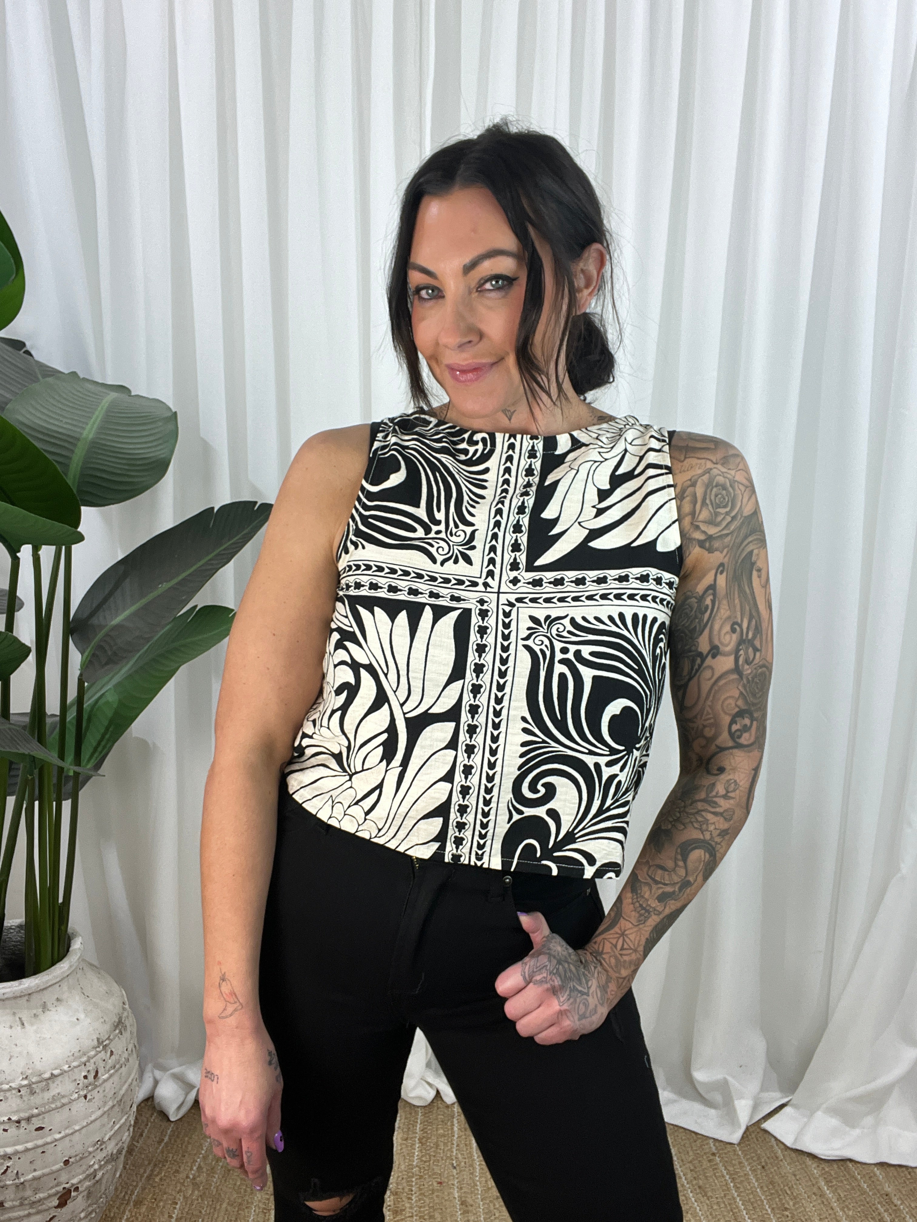 The Indigo Black top is a sophisticated light weight sleeveless top. This versatile Top is perfect for the spring/summer season. The top is a cropped design with a high neckline and non-functional buttons down the back for added style. Thicker straps ensure bra straps are covered, making it the perfect little top. Whether you’re heading out for a casual outing or a special event, this will make you look and feel fabulous.