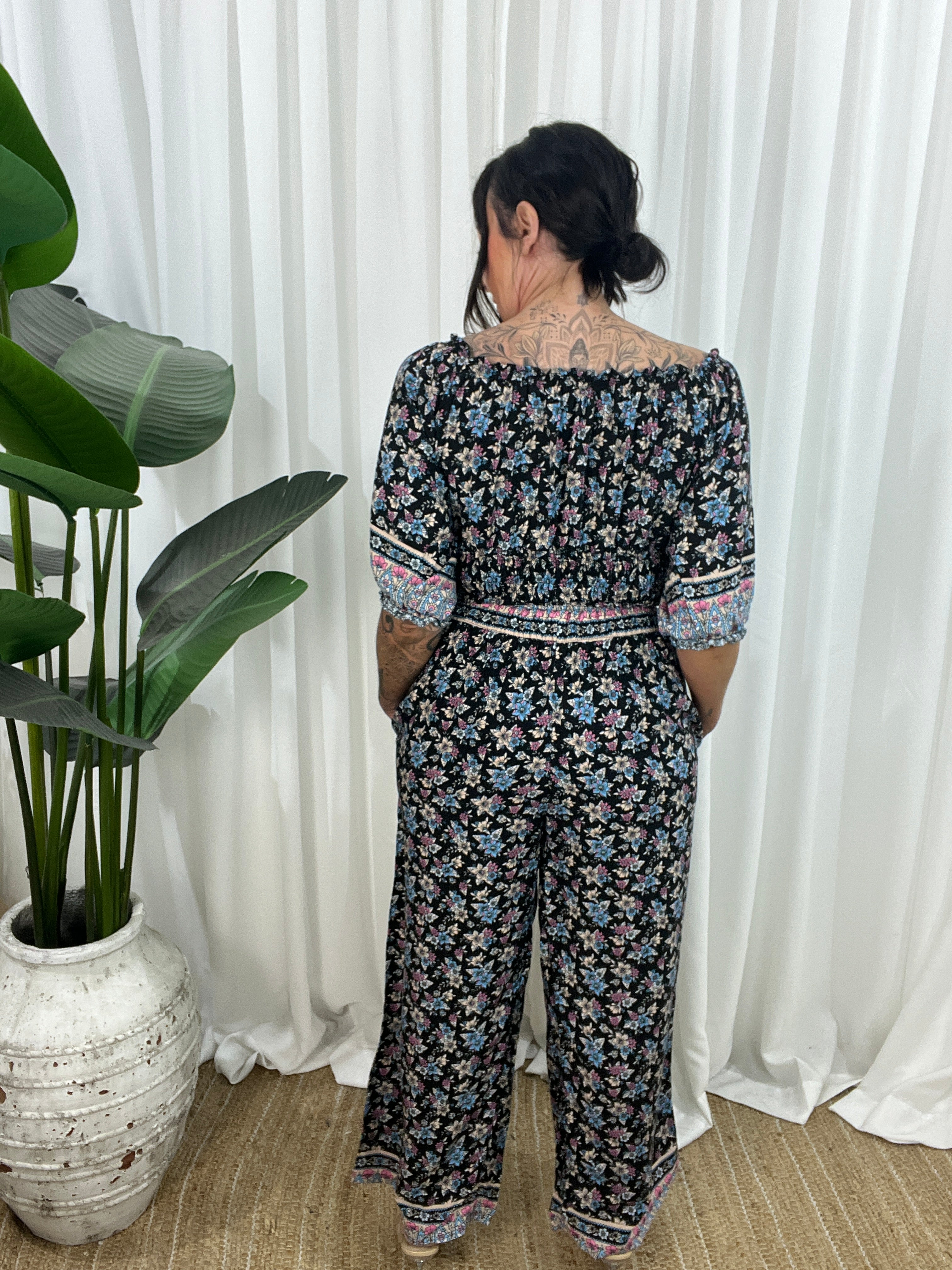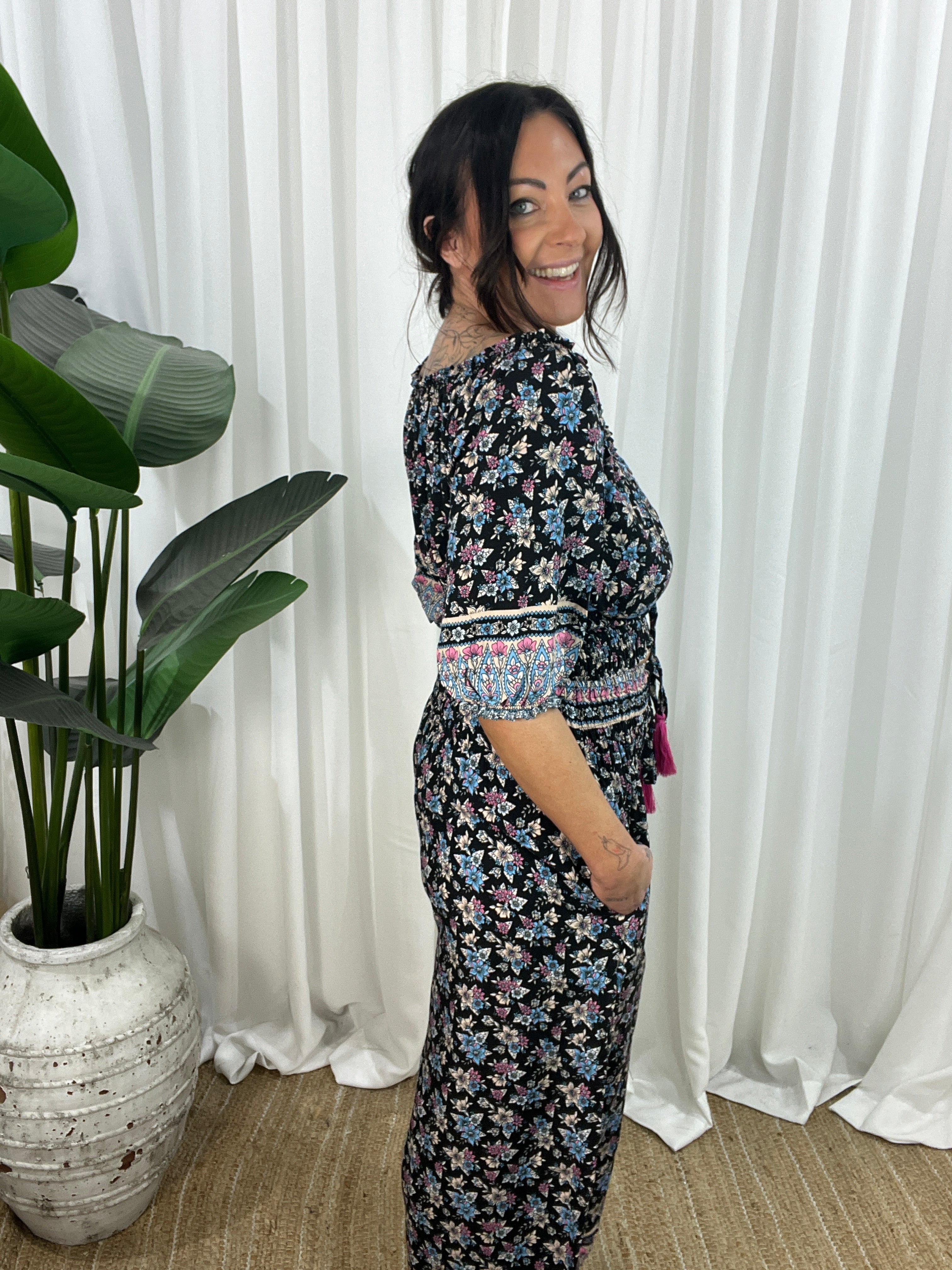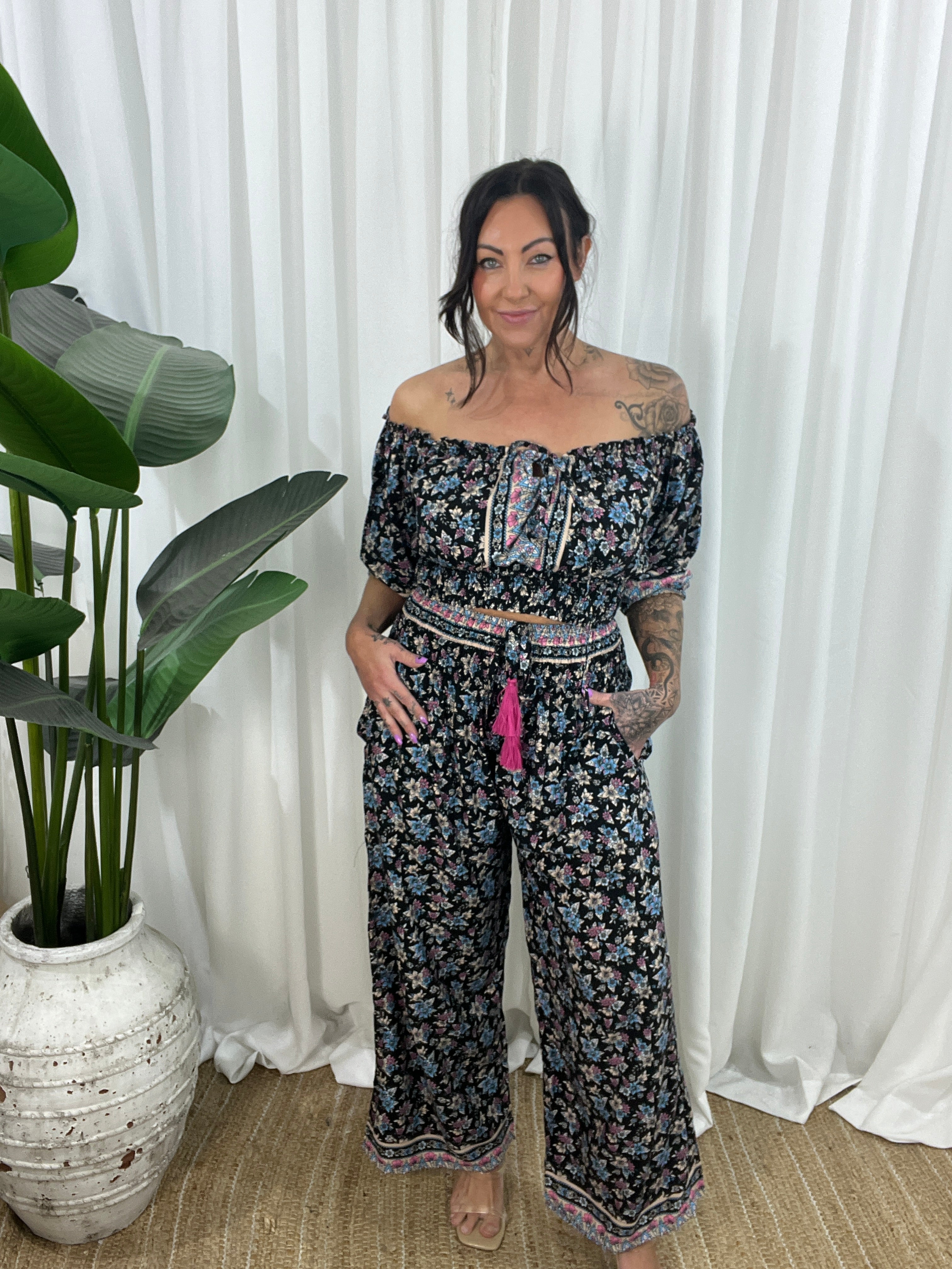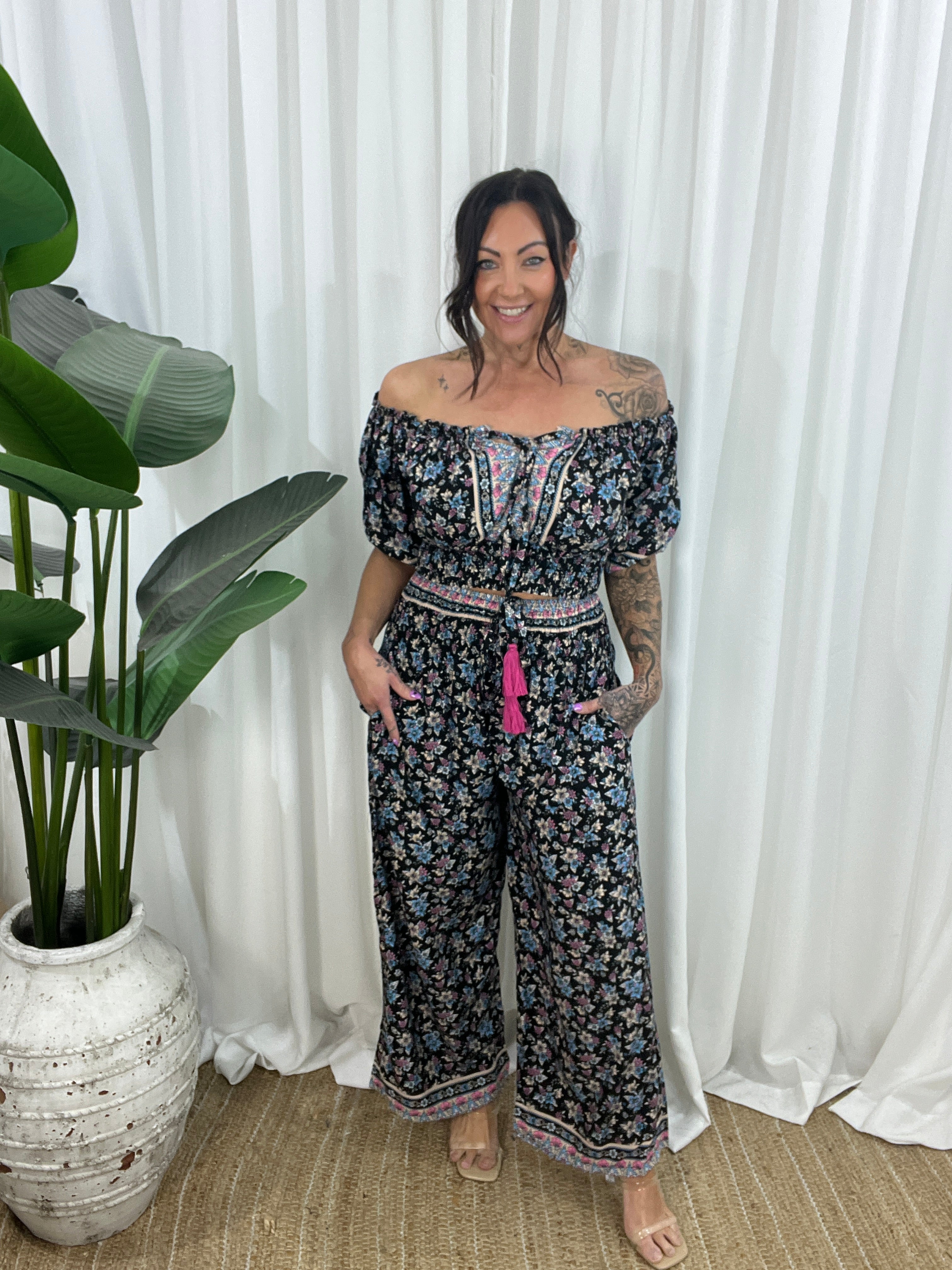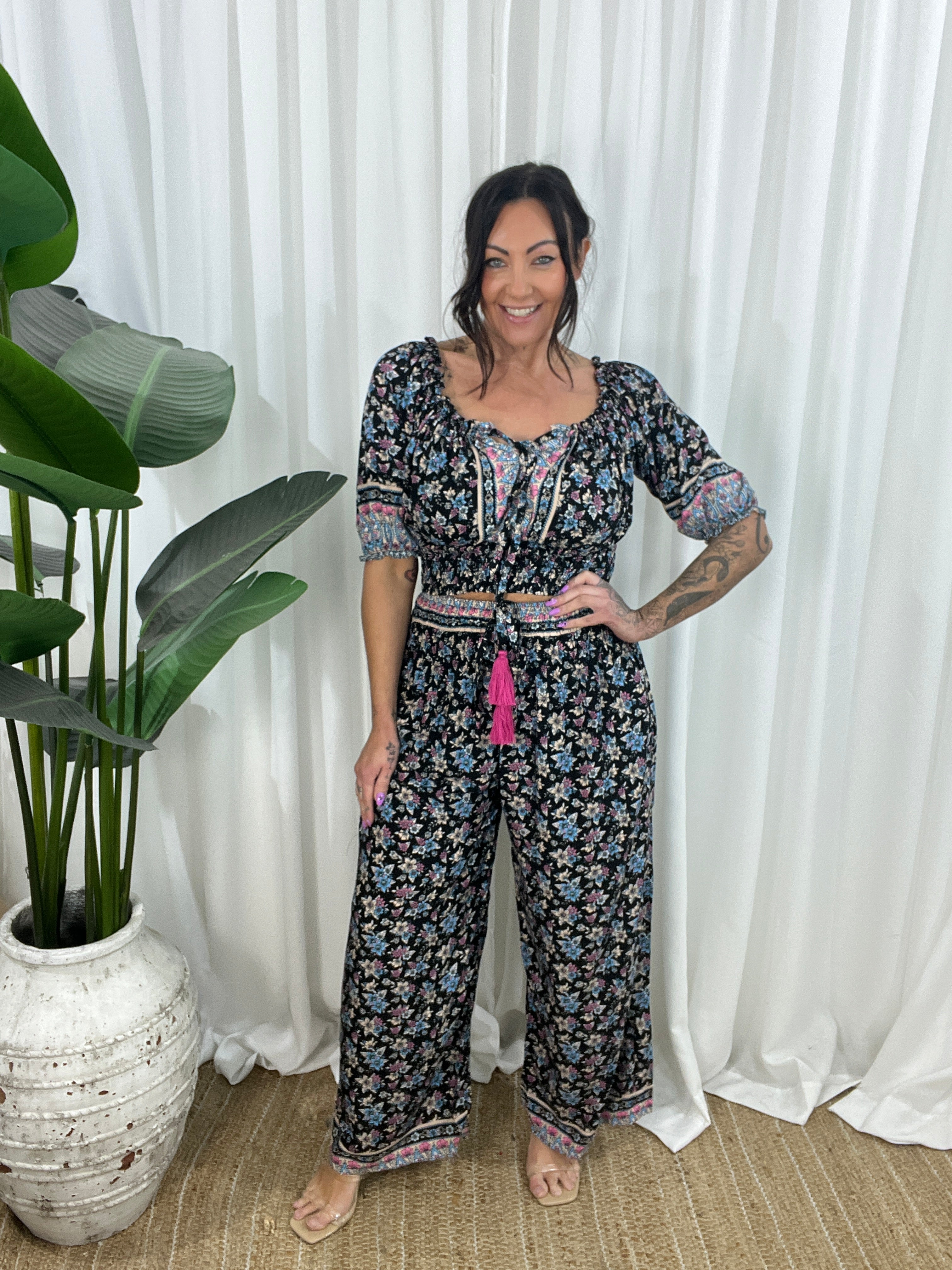 Our Stunning Jeanie Set features a beautiful boho Pants and top set , a wide leg pant with faux tie and tassels, the cute mid length sleeve top is shirred in the body and cropped to perfection, she is designed to wear off the shoulder or on making it the perfect outfit for everyday or special occasions.