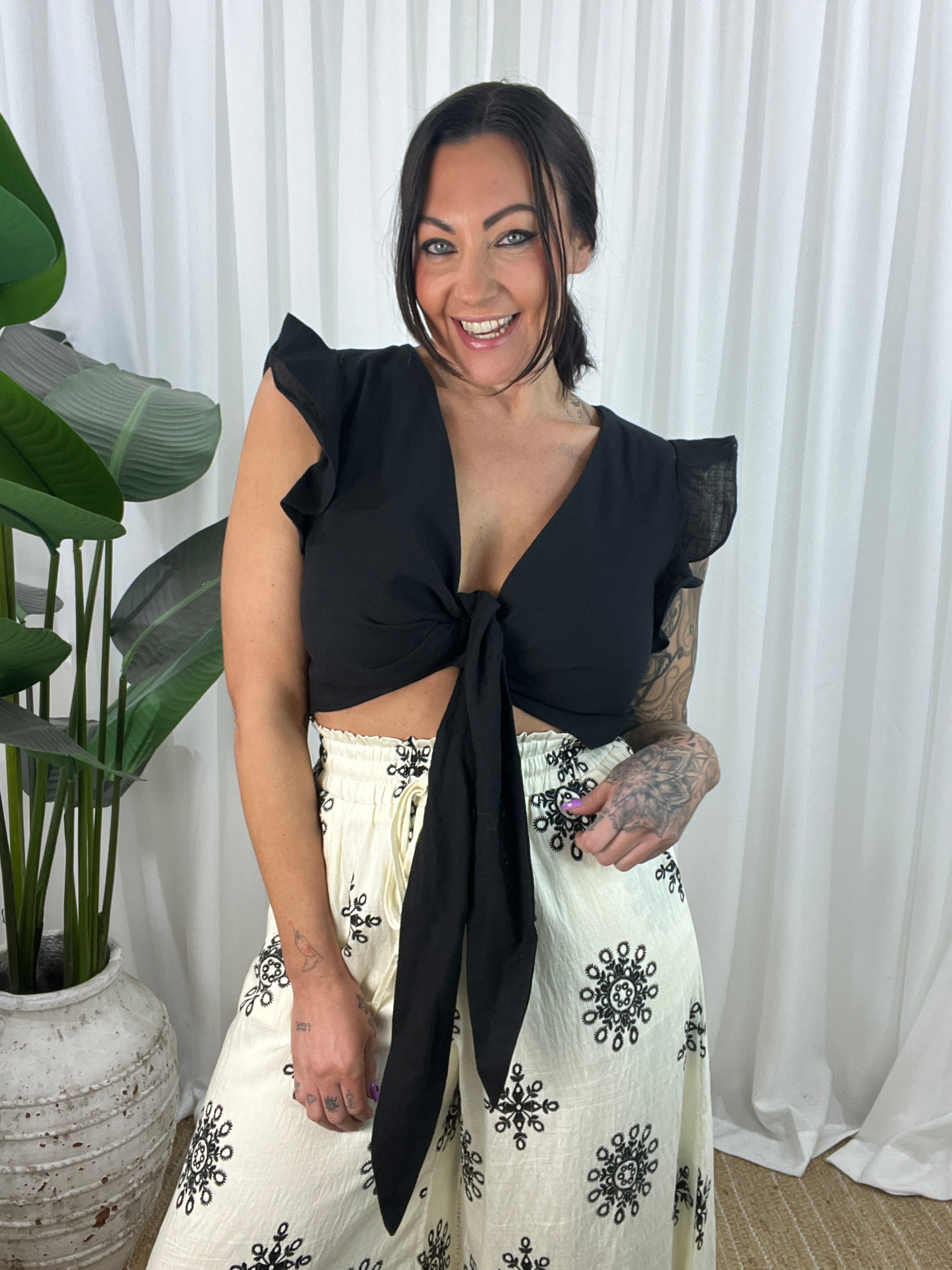 Flirty, fresh, and made for golden hour plans, the Pharrell Tie Crop Top is your go-to for effortless charm. Crafted from 100% cotton, it’s lightweight and breathable with a relaxed open front that ties at the front bust for a custom fit. Frilled sleeves that sit at shoulder point add a playful touch, while the cropped length makes it perfect for pairing with high-rise bottoms. Whether you're heading to supper or styling for a weekend escape, this top brings the romance.