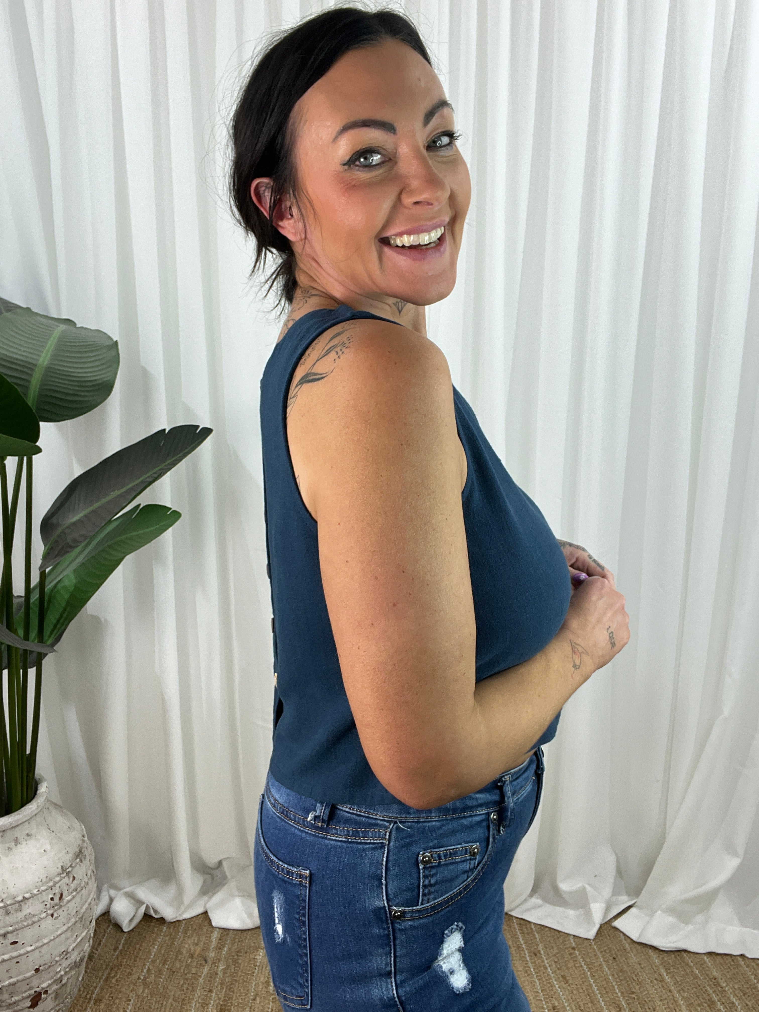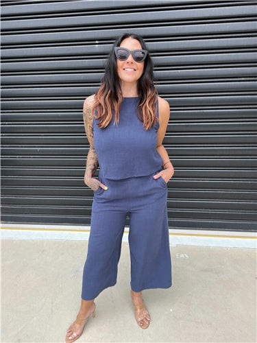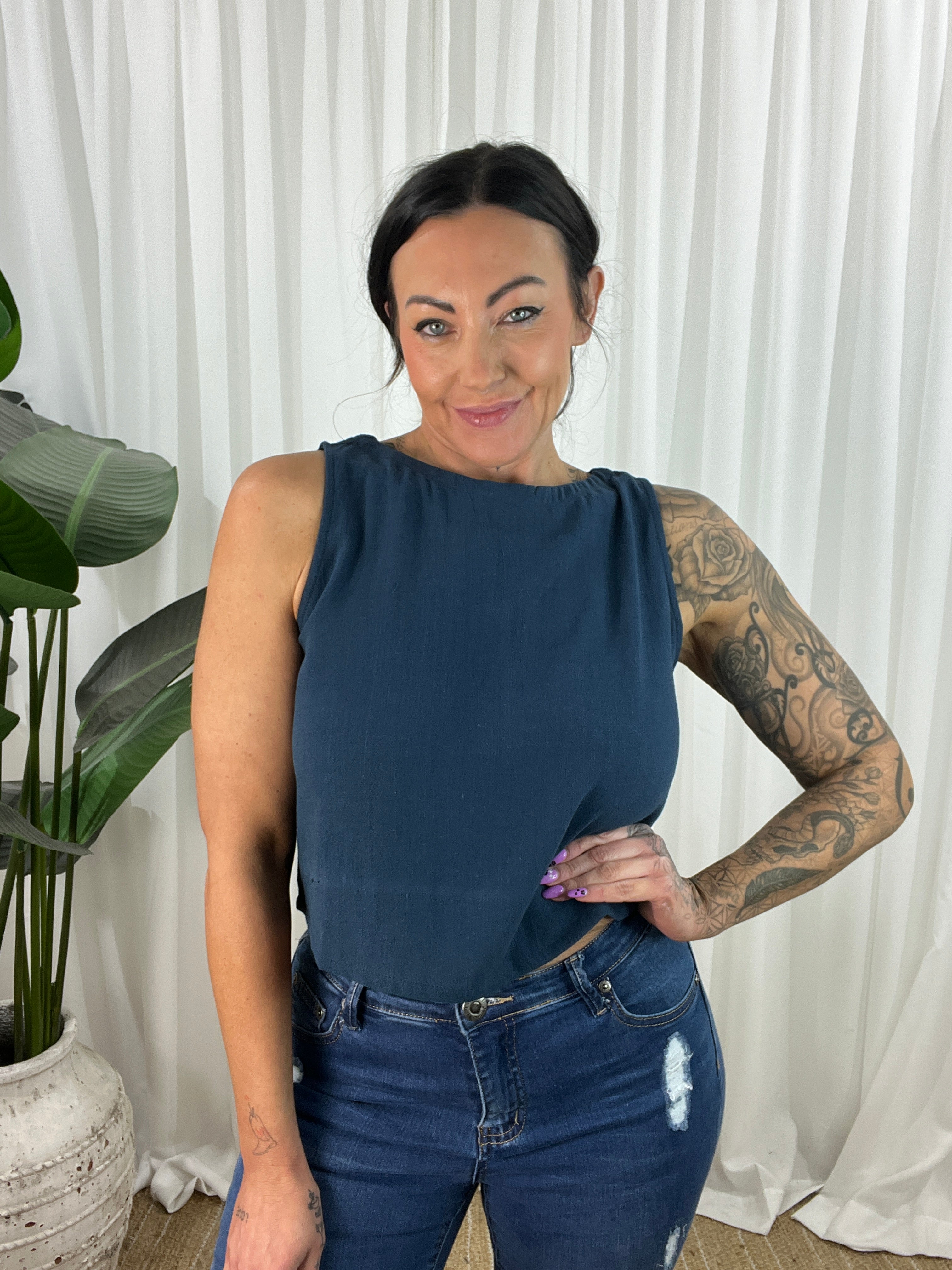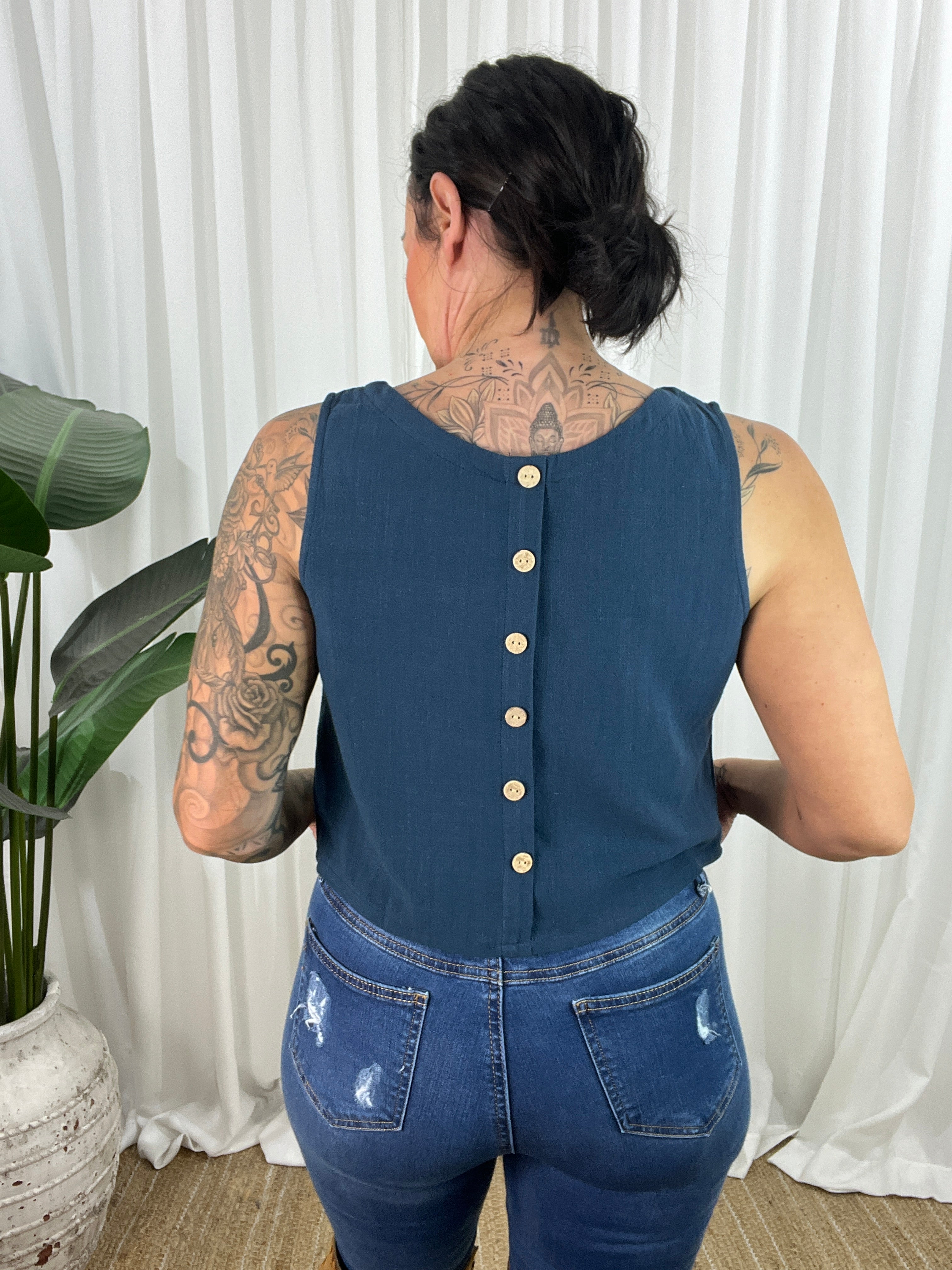 The Pheobe top on Navy is a sophisticated linen blend sleeveless top. This versatile top is perfect for the spring/summer season. The top is a cropped design with a high neckline and non-functional buttons down the back for added style. Thicker straps ensure bra straps are covered, making it the perfect little top.