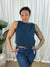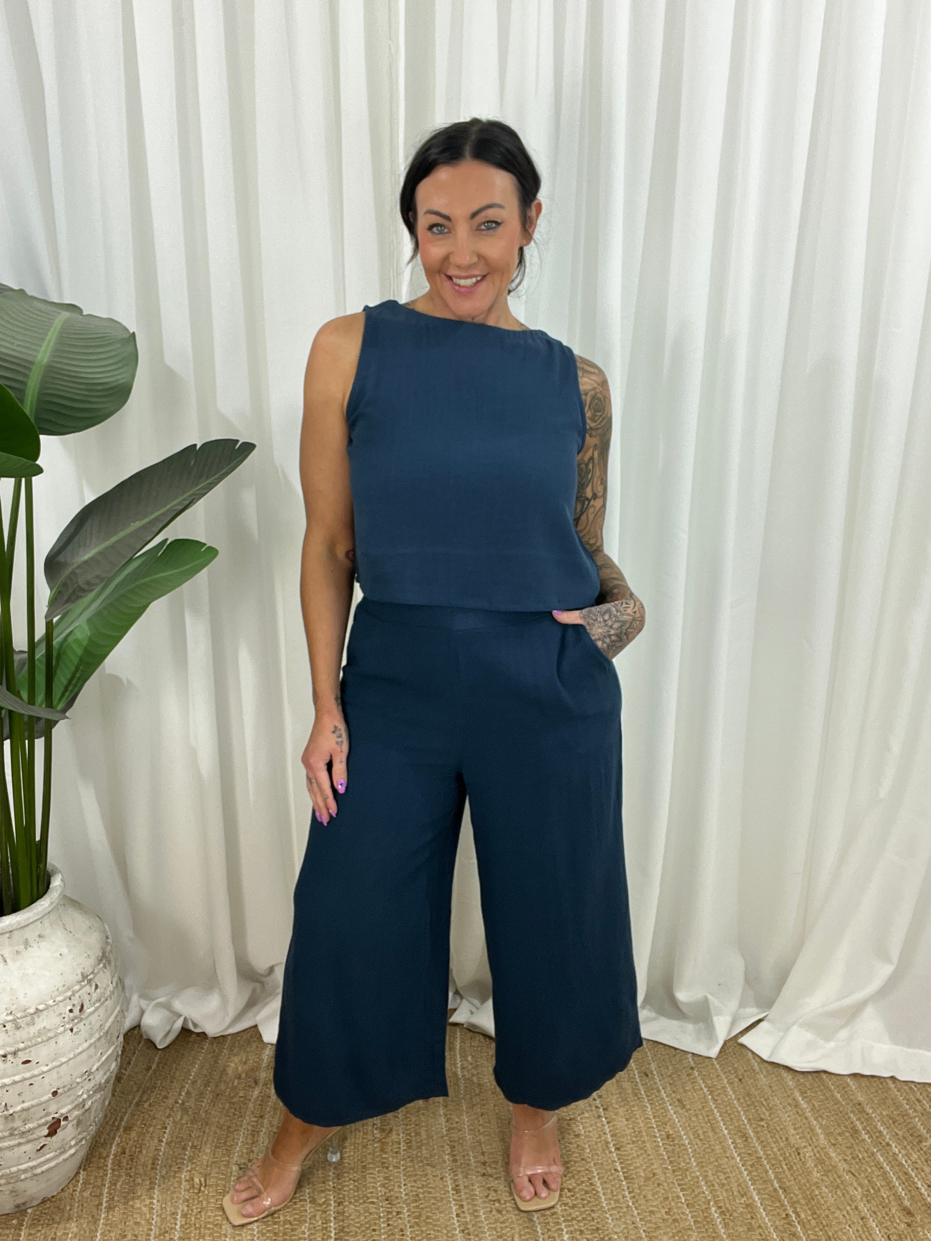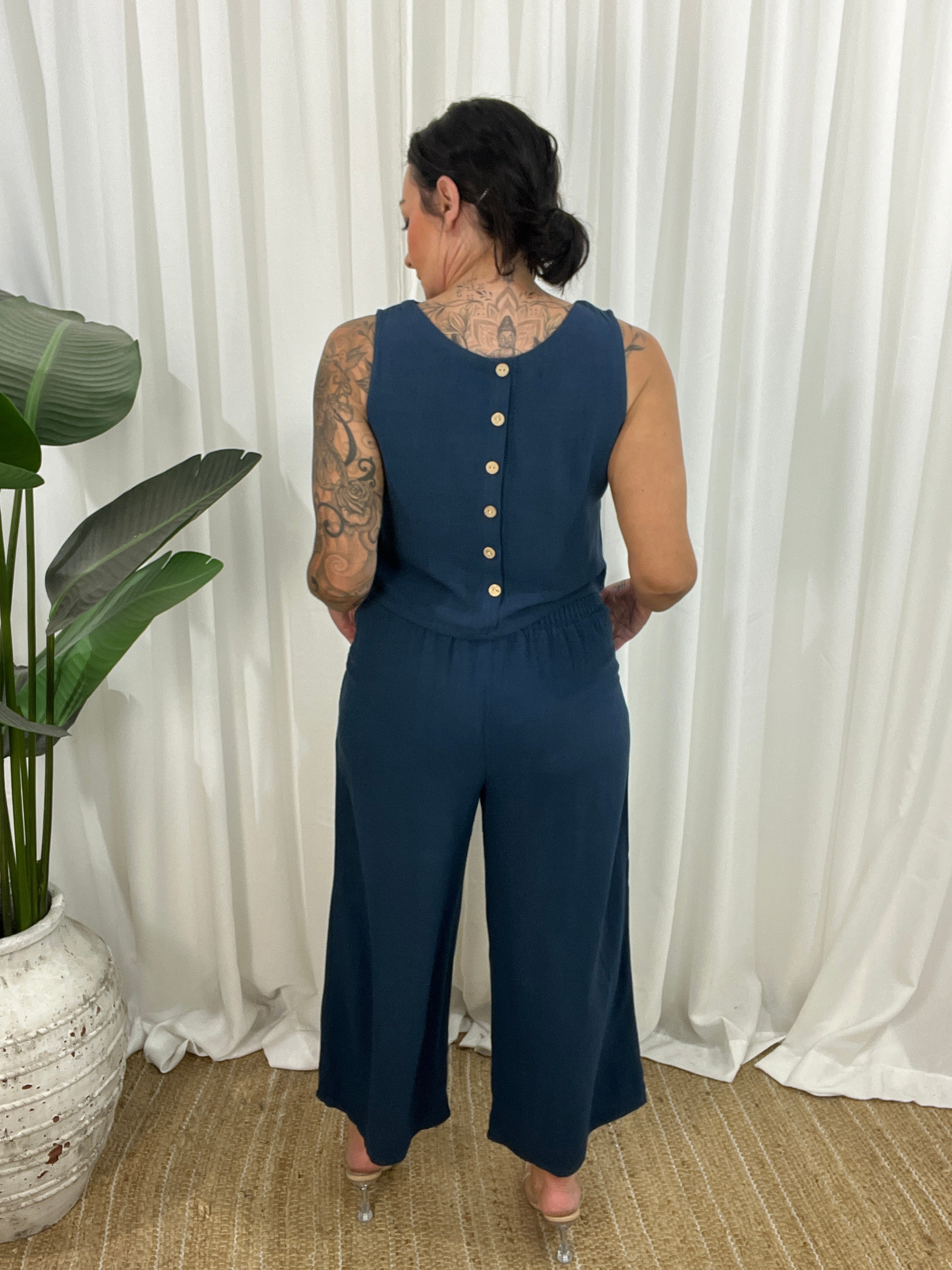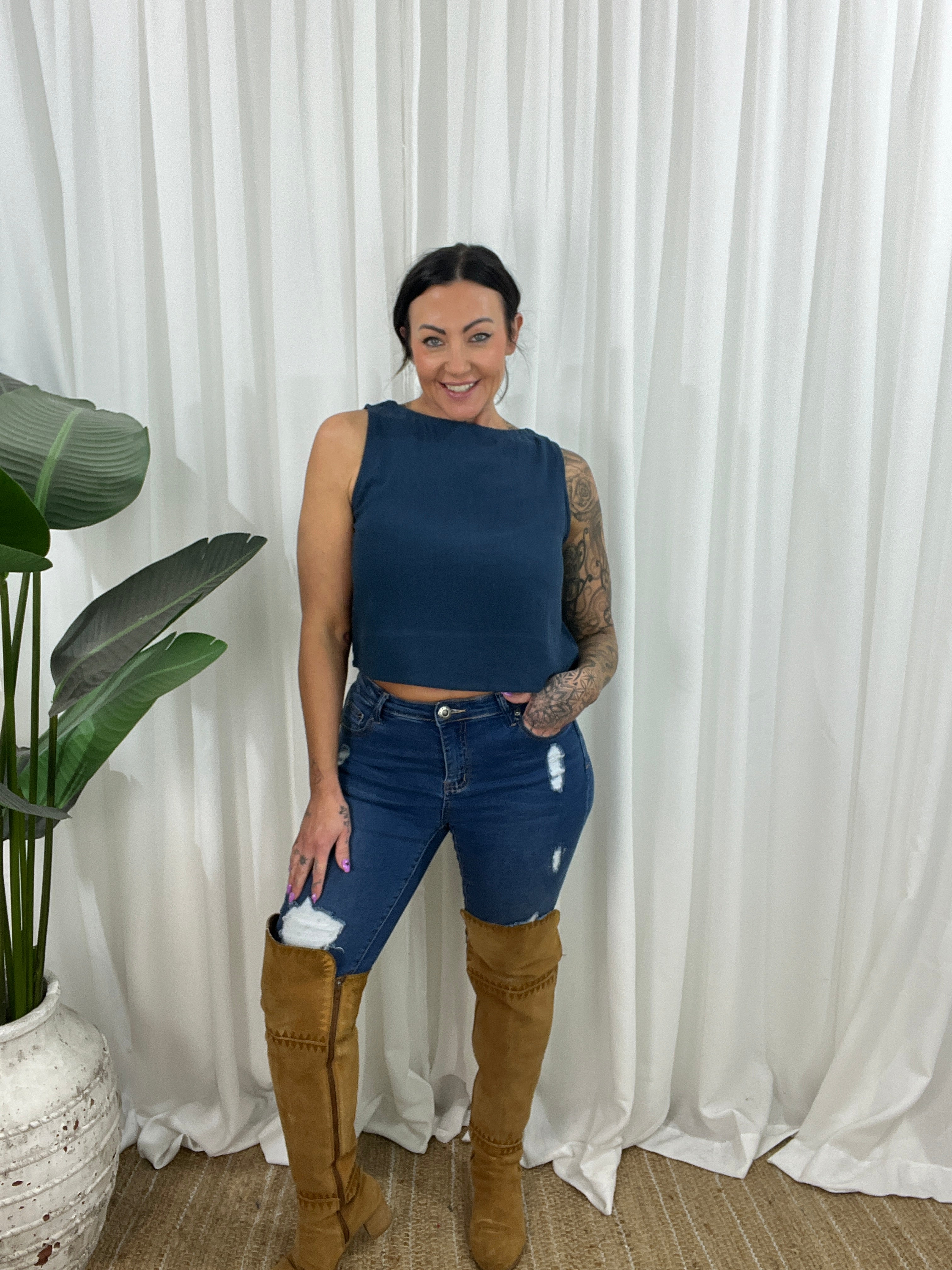 The Pheobe top on Navy is a sophisticated linen blend sleeveless top. This versatile top is perfect for the spring/summer season. The top is a cropped design with a high neckline and non-functional buttons down the back for added style. Thicker straps ensure bra straps are covered, making it the perfect little top.