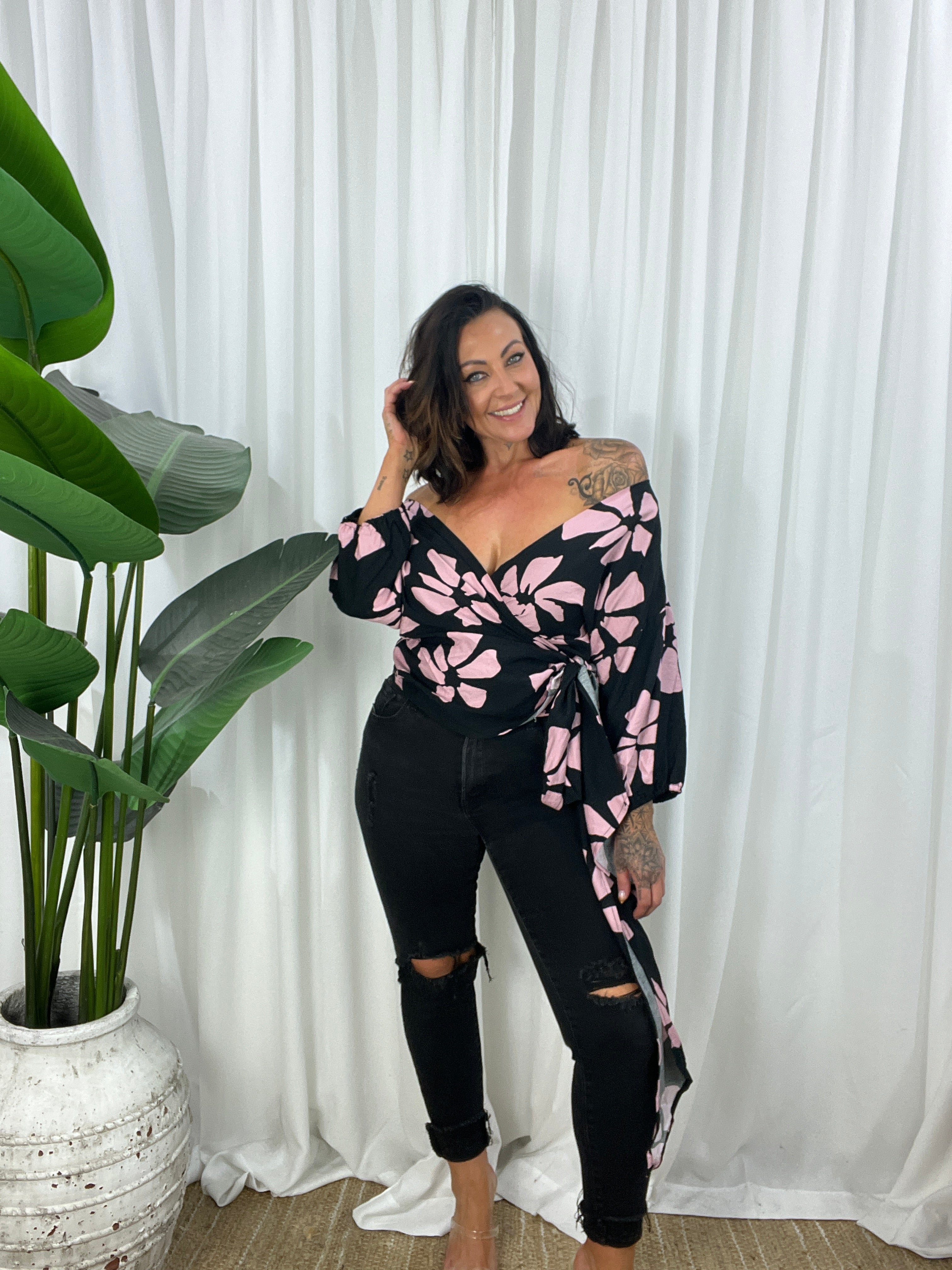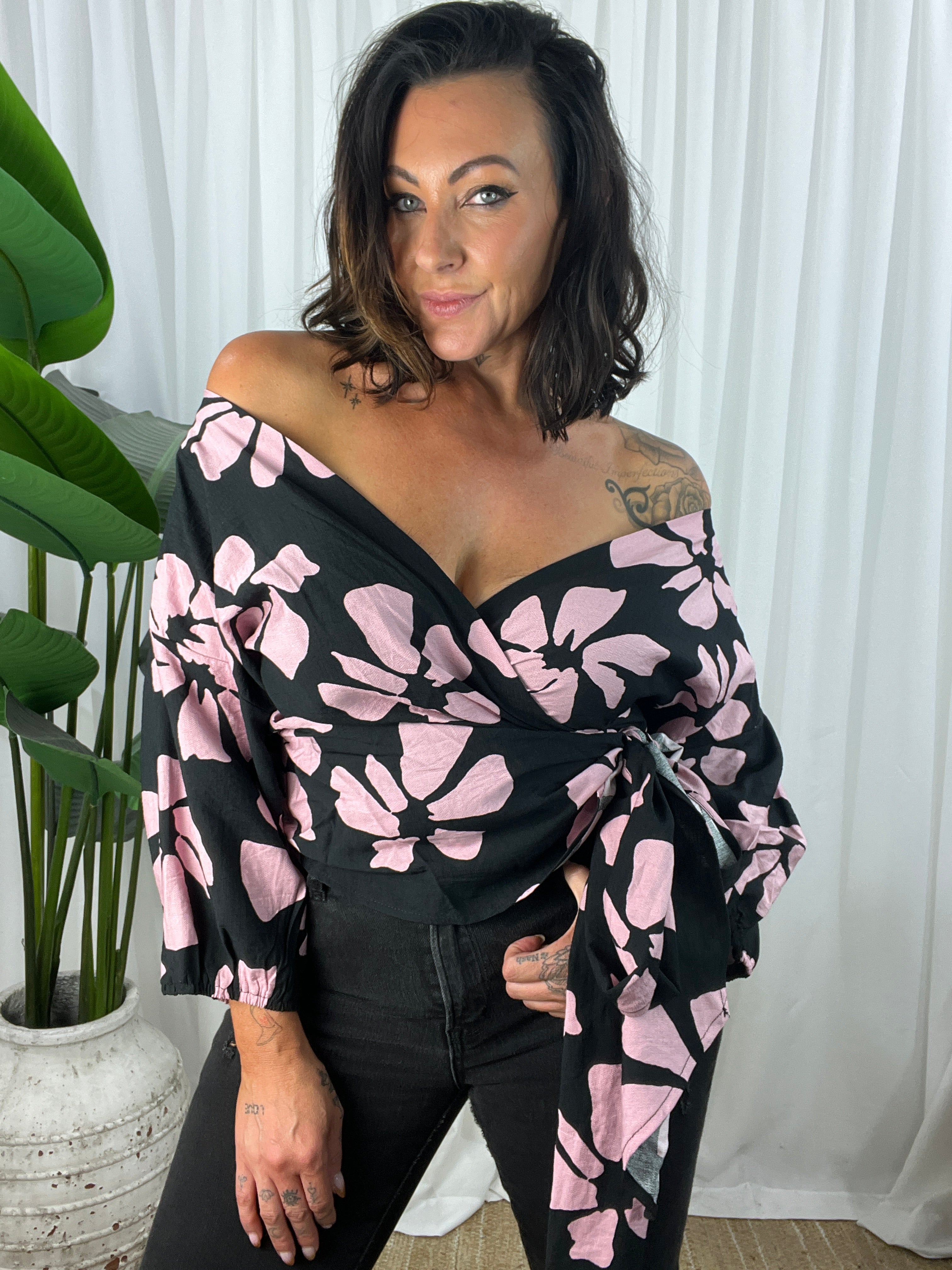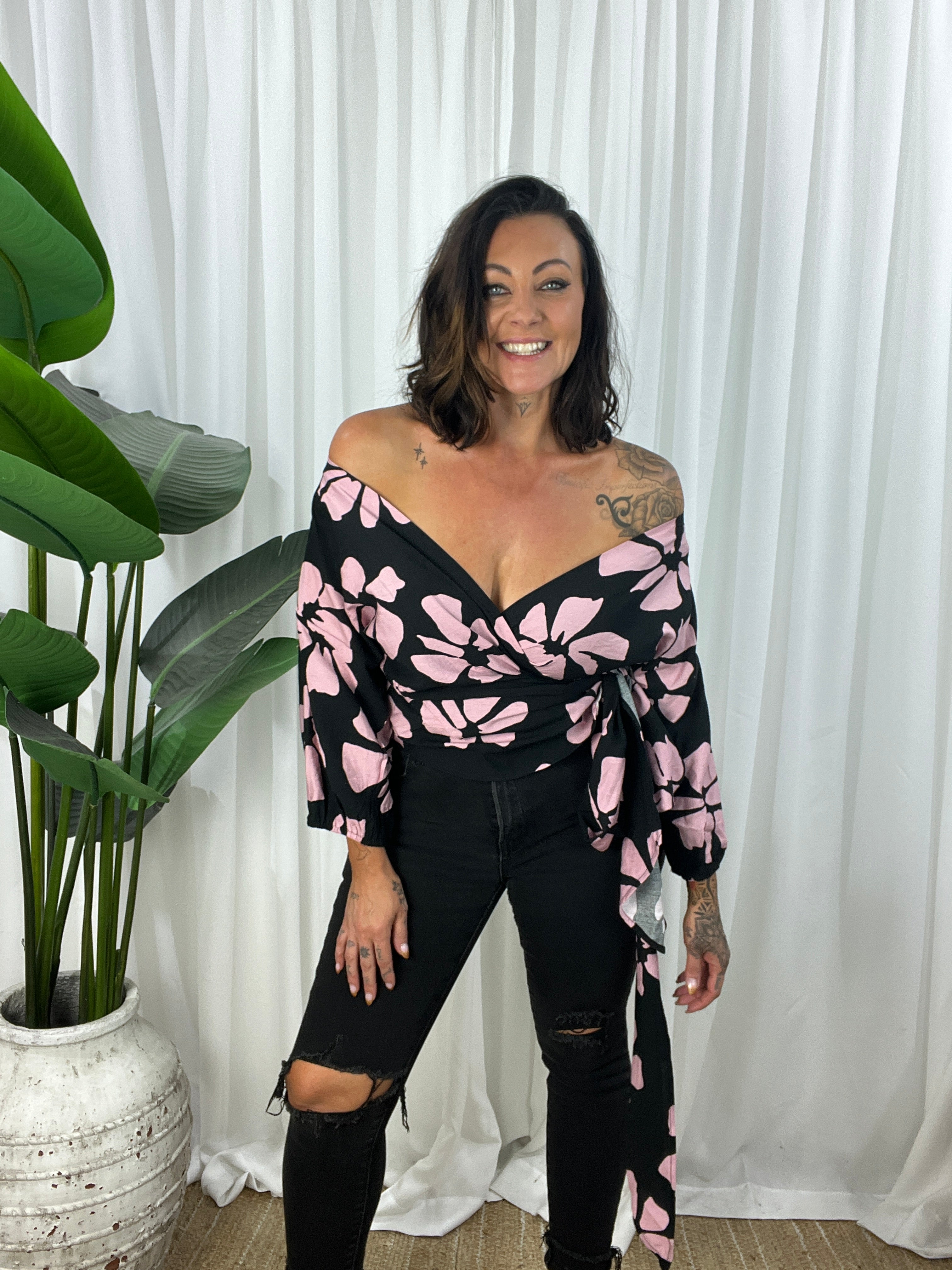 - Design: Wrap top with tie detail, small elastication around back of neck to allow to be worn off shoulder. Black base with pink abstract floral print