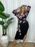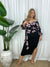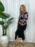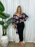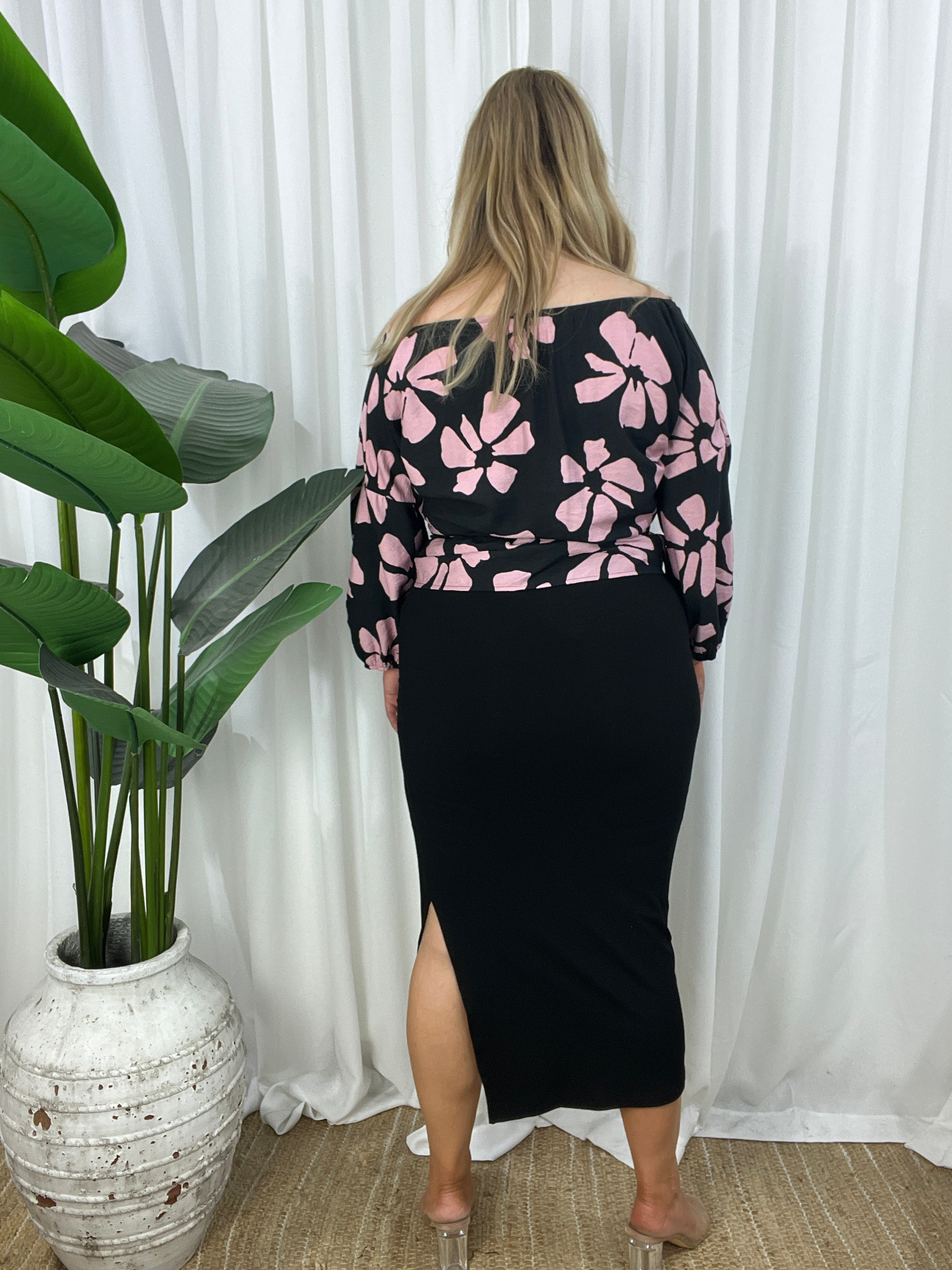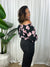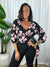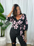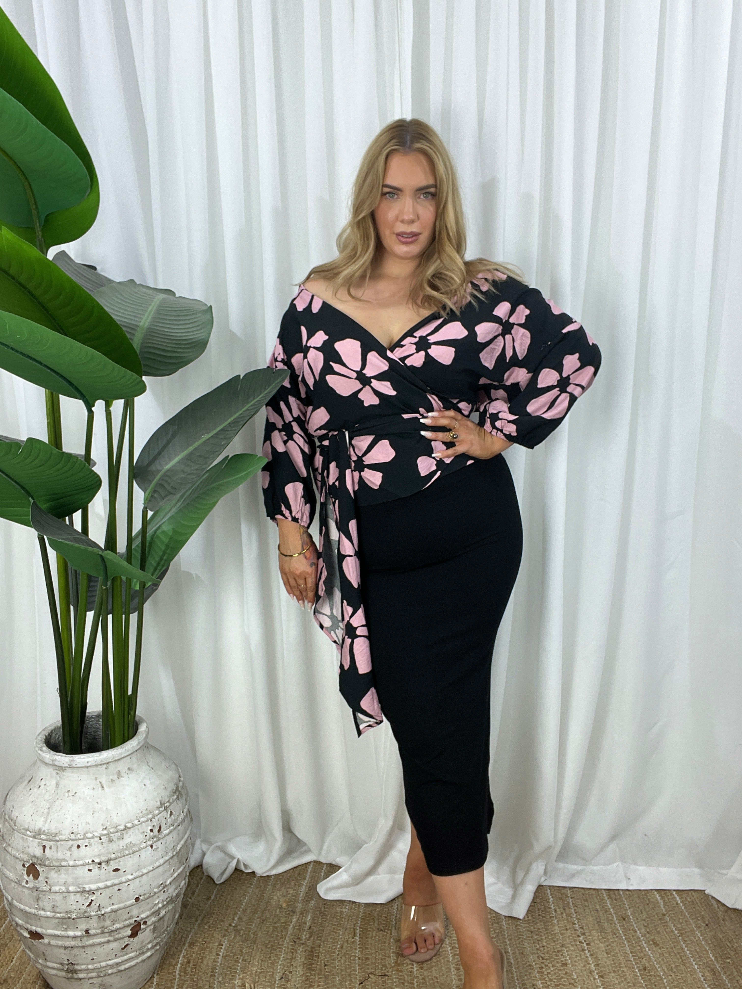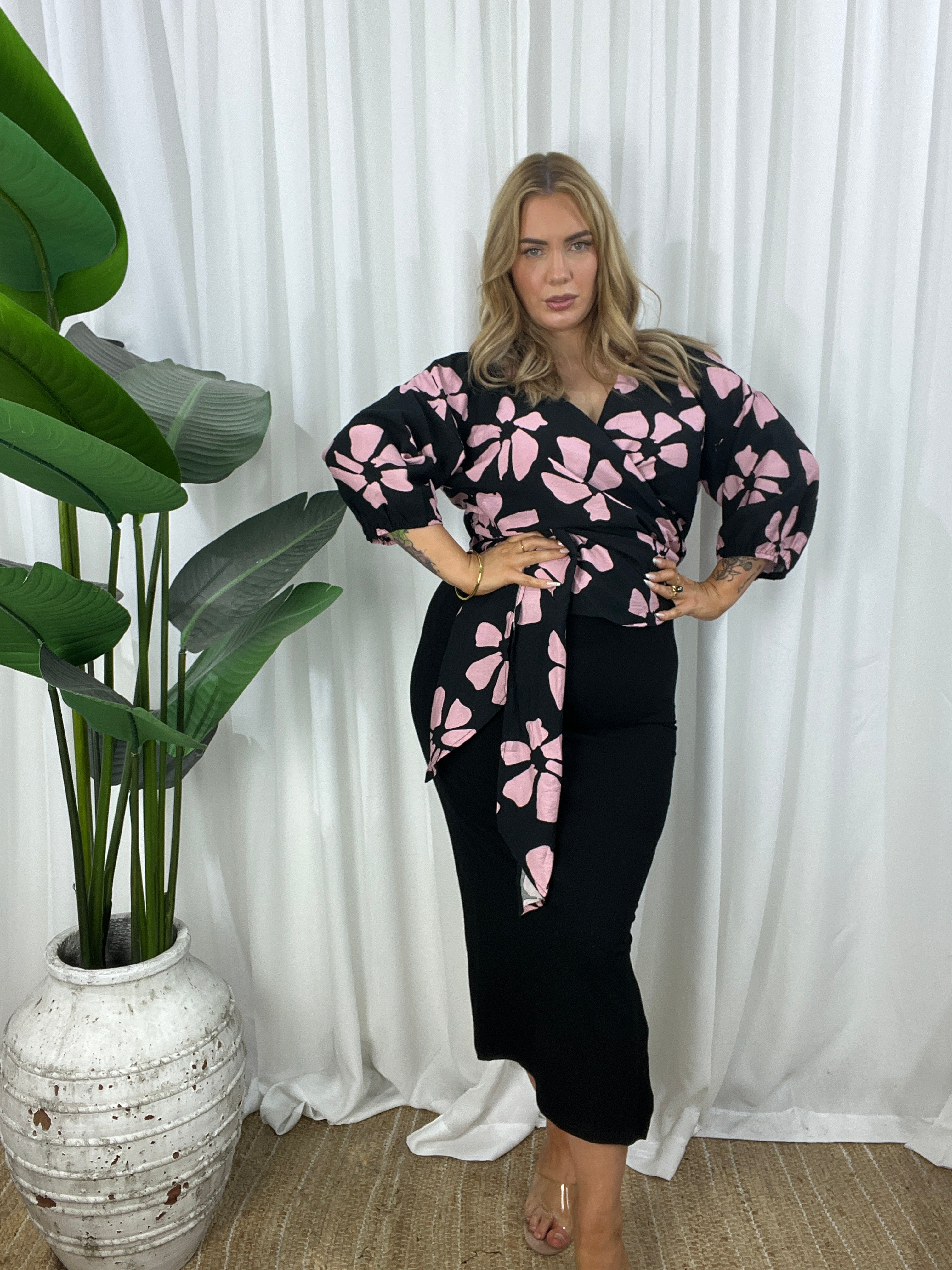 - Design: Wrap top with tie detail, small elastication around back of neck to allow to be worn off shoulder. Black base with pink abstract floral print