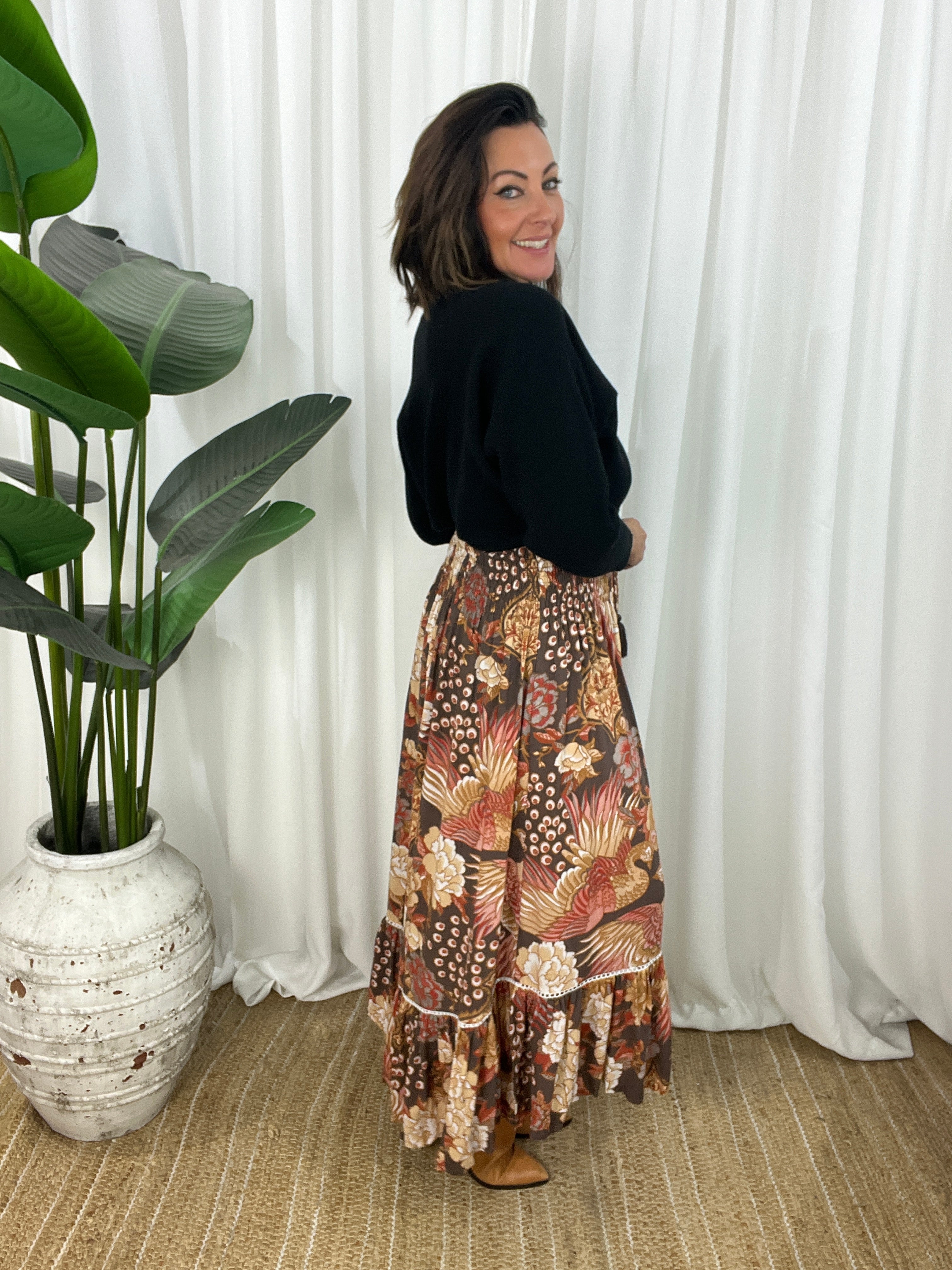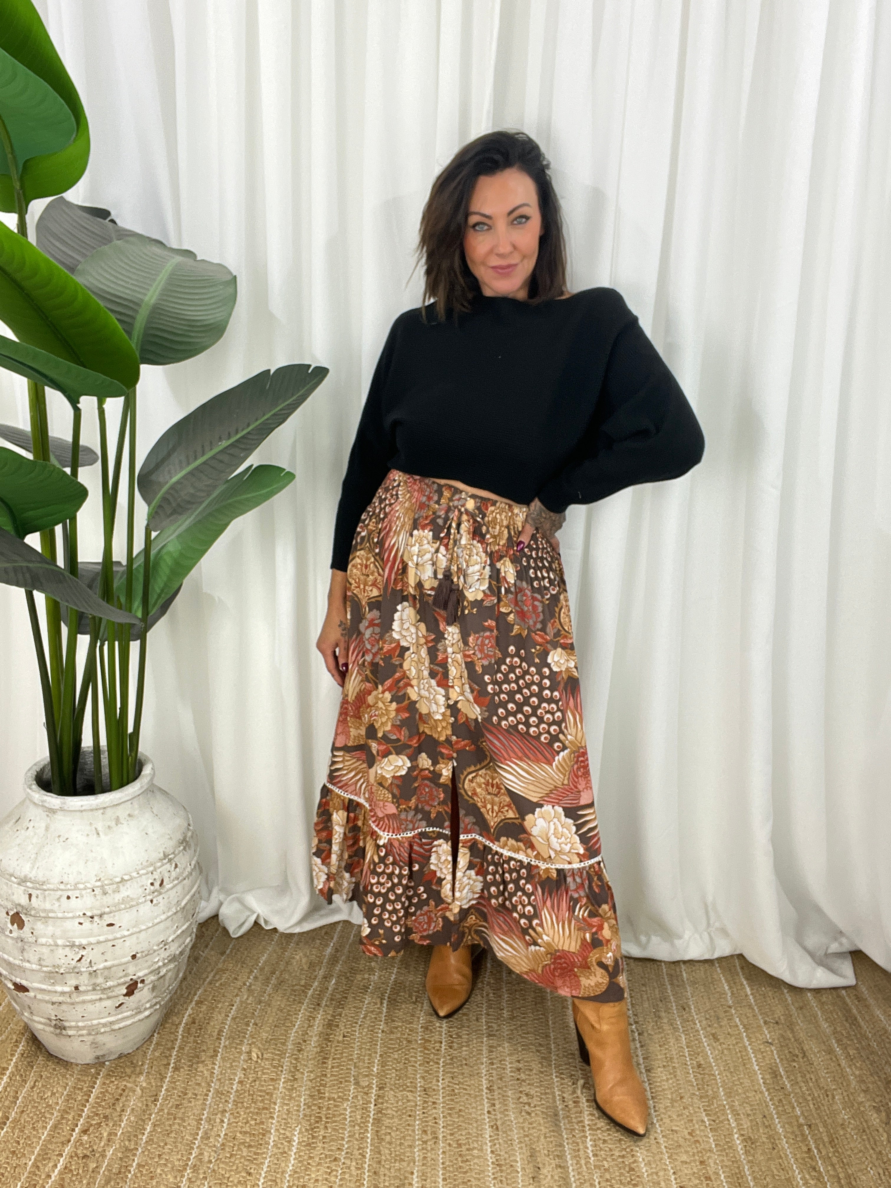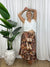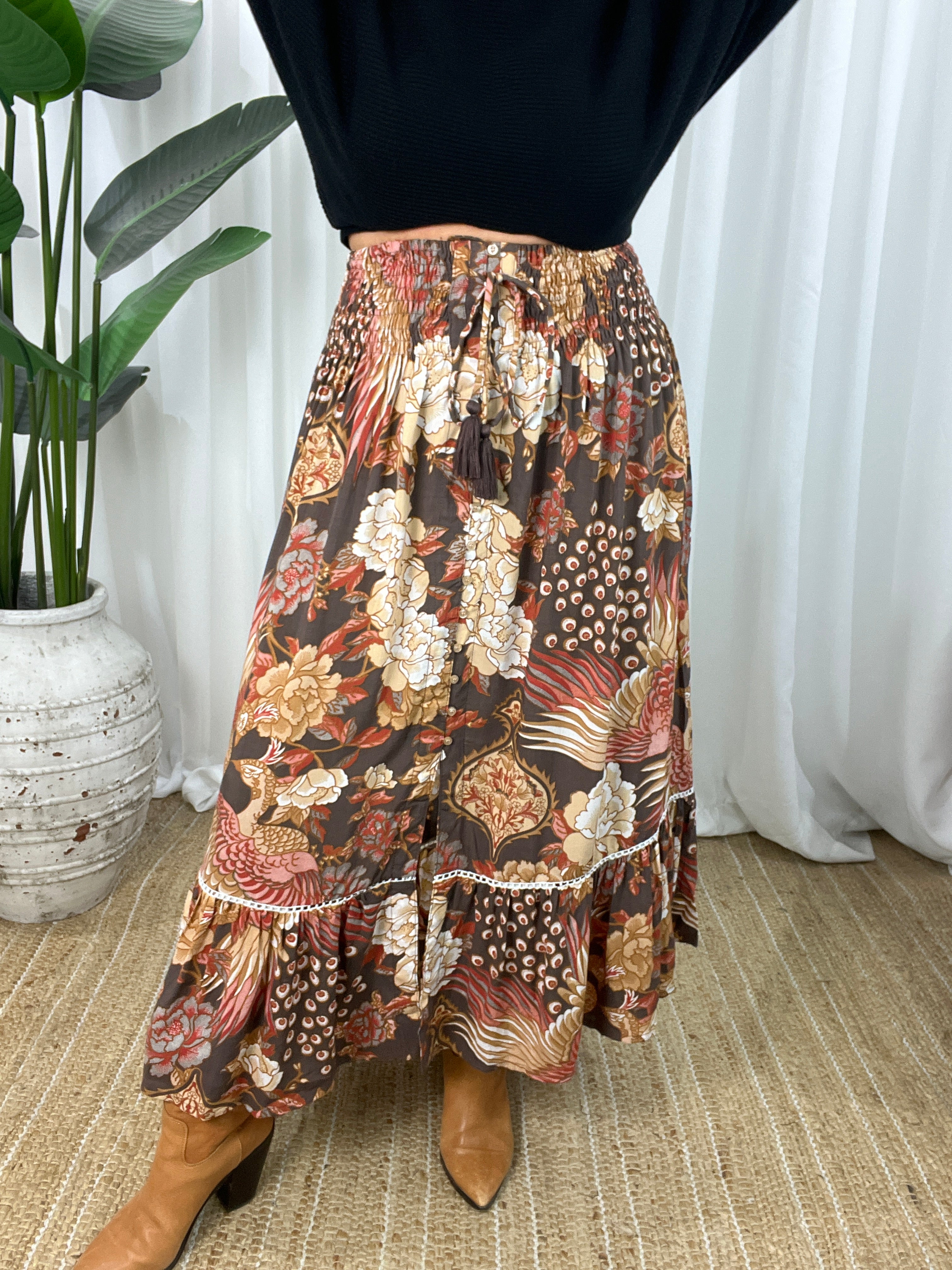 - Design : A flowy relaxed silhouette, button down midi skirt, spliy in lower front, hi-low design (lower in rear), shirred elastic waist with lots of stretch, faux drawstring and tie tassels, soft a line flow. Lace crochet section in lower skirt. Brown peacock print