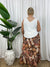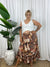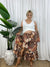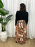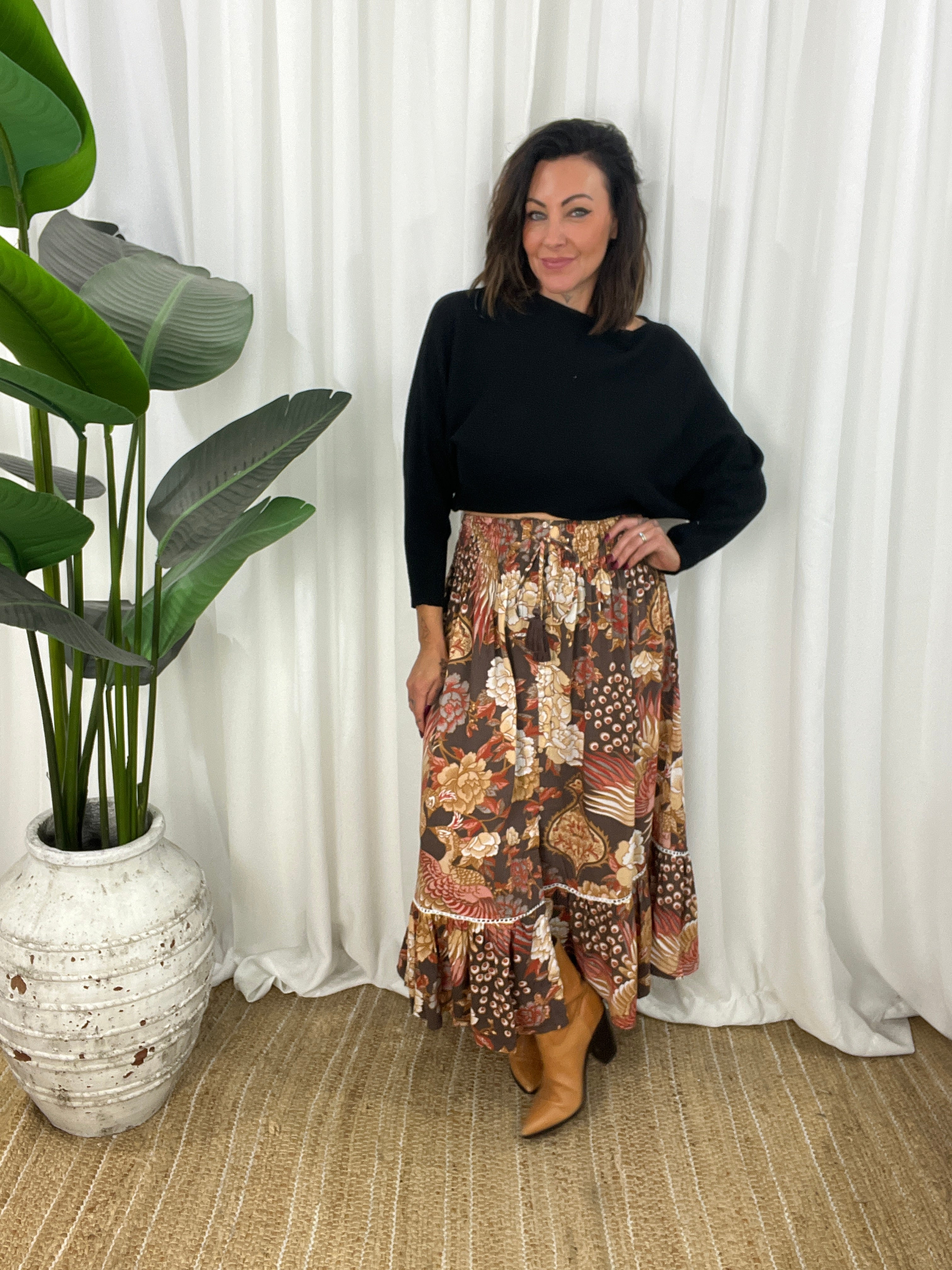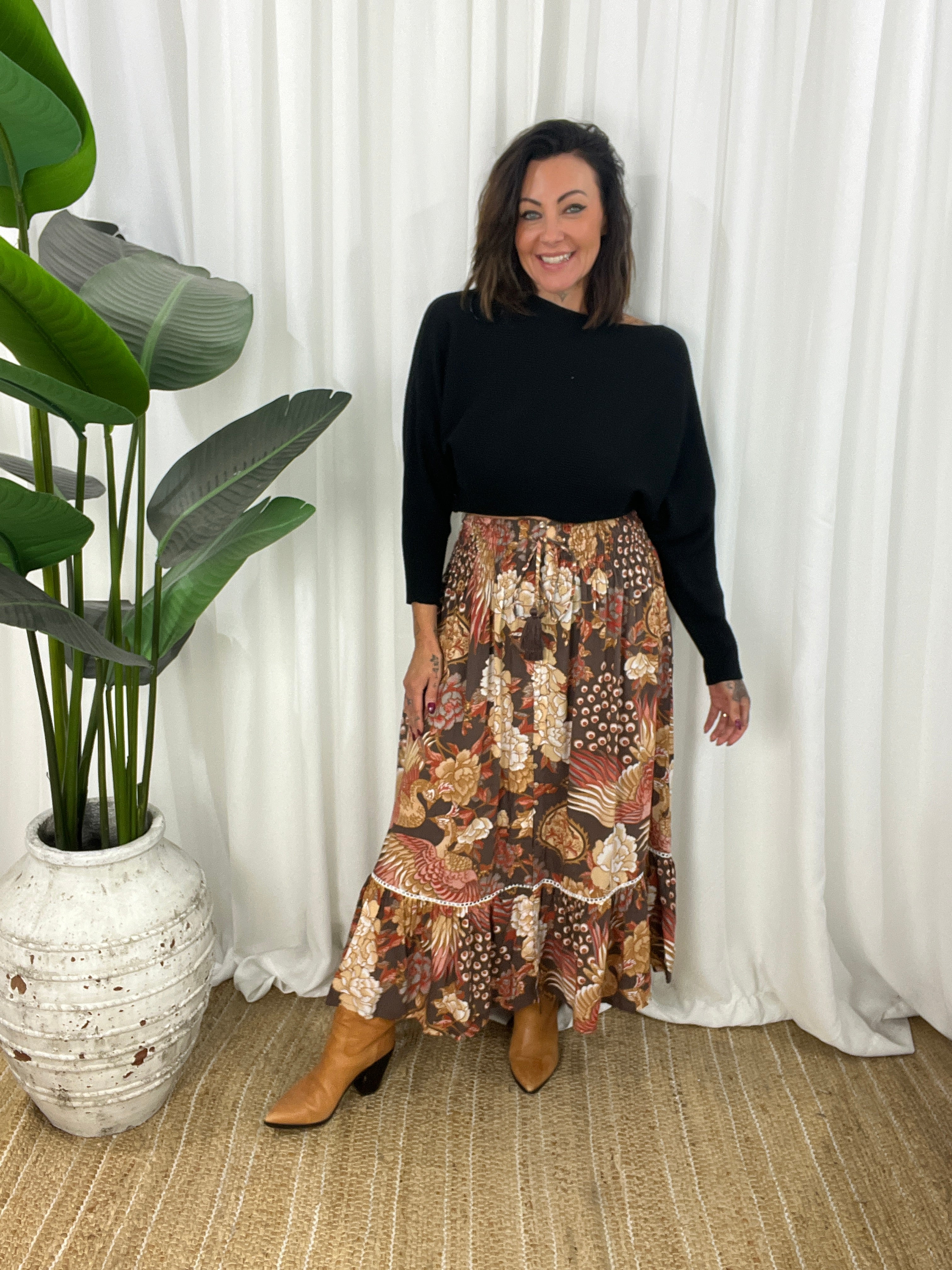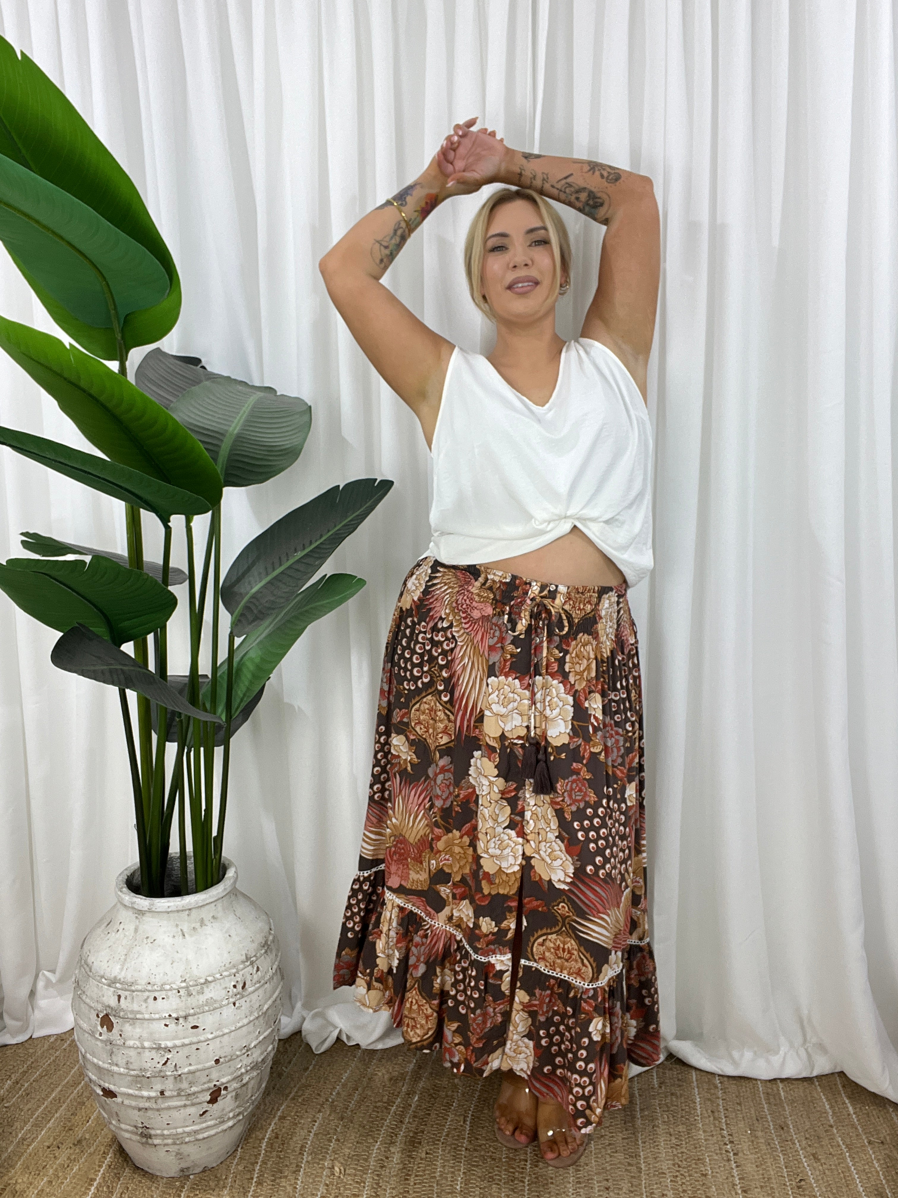 - Design : A flowy relaxed silhouette, button down midi skirt, spliy in lower front, hi-low design (lower in rear), shirred elastic waist with lots of stretch, faux drawstring and tie tassels, soft a line flow. Lace crochet section in lower skirt. Brown peacock print