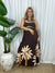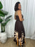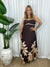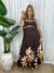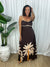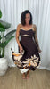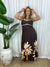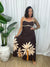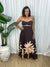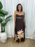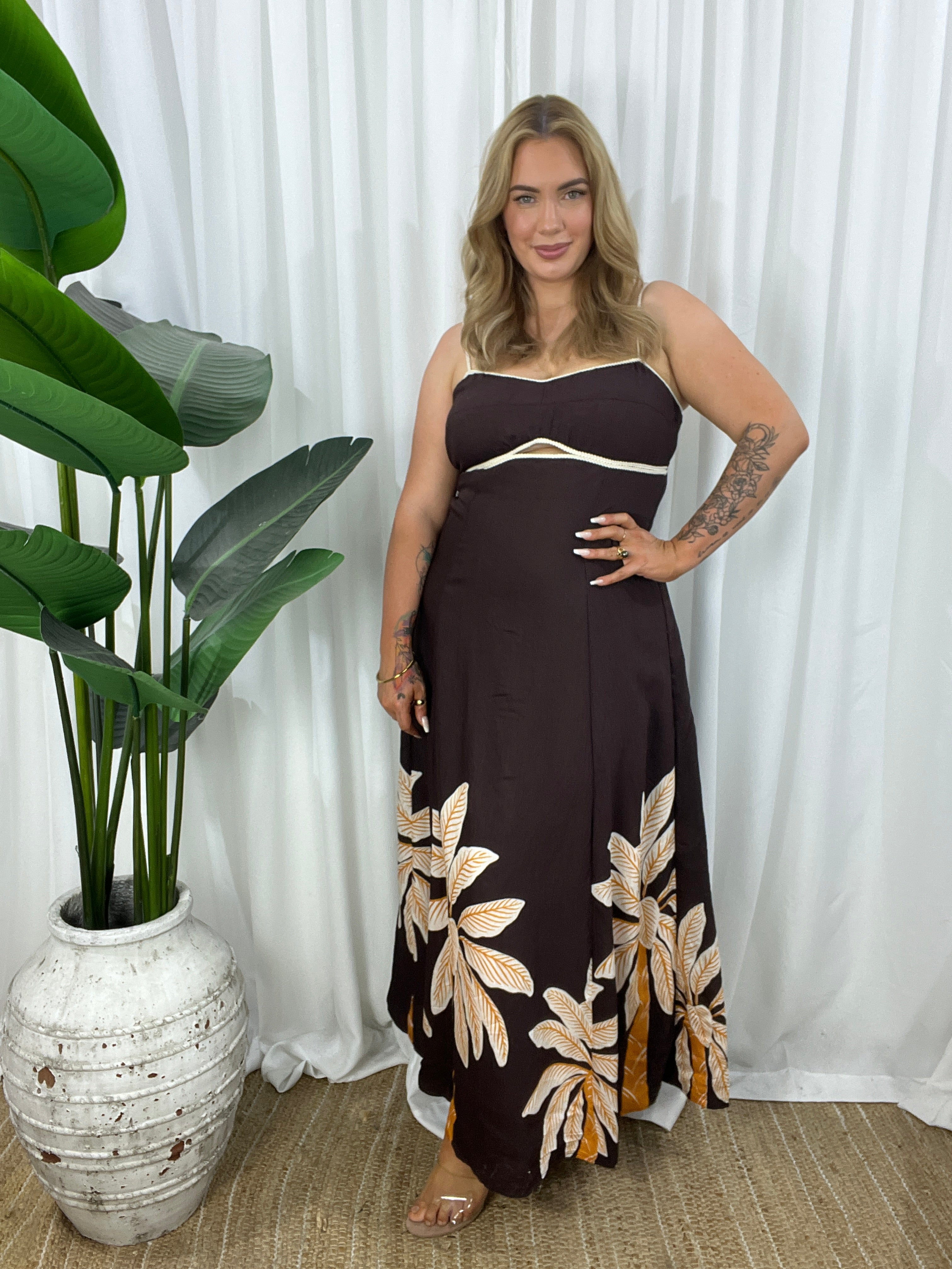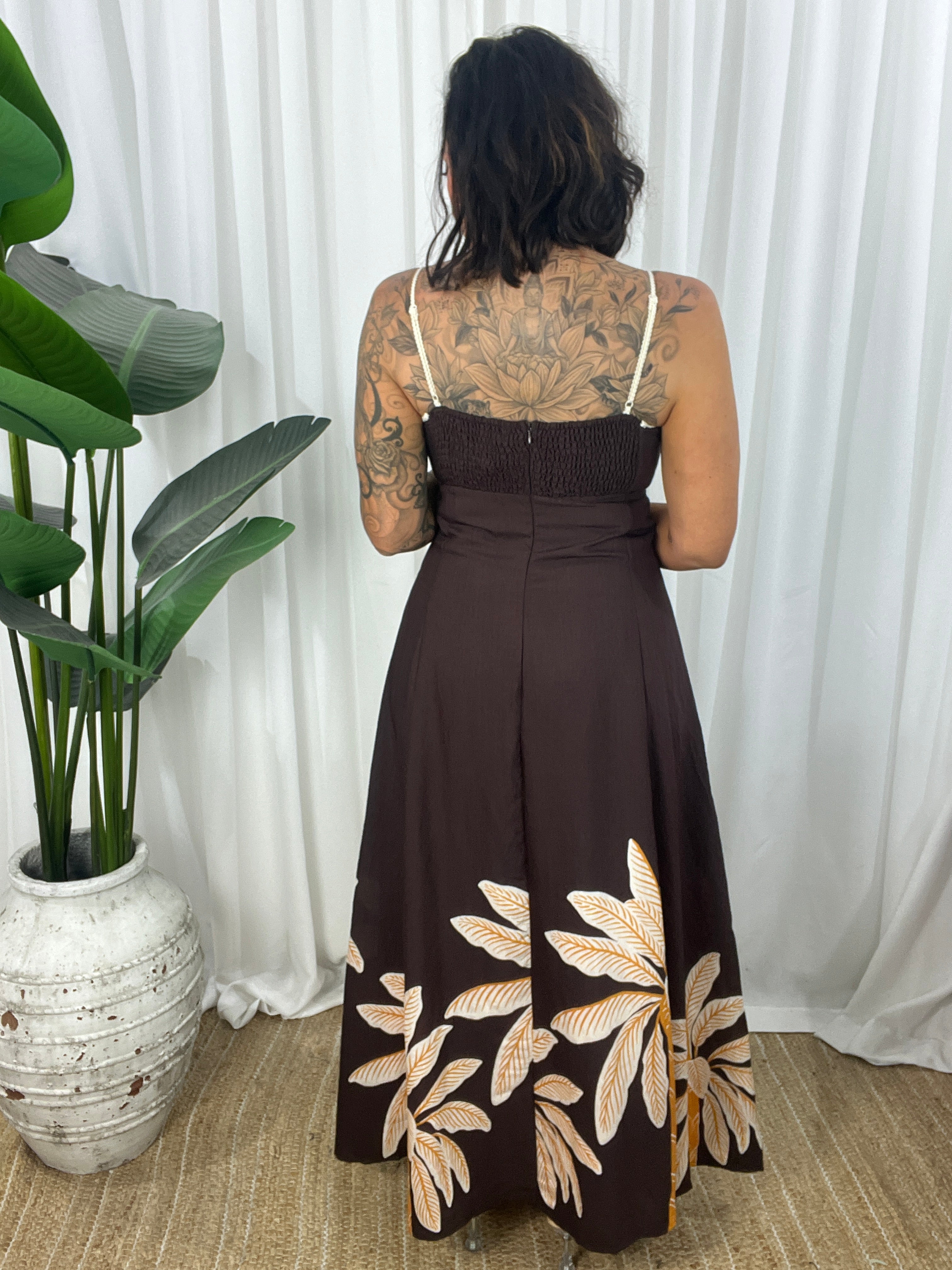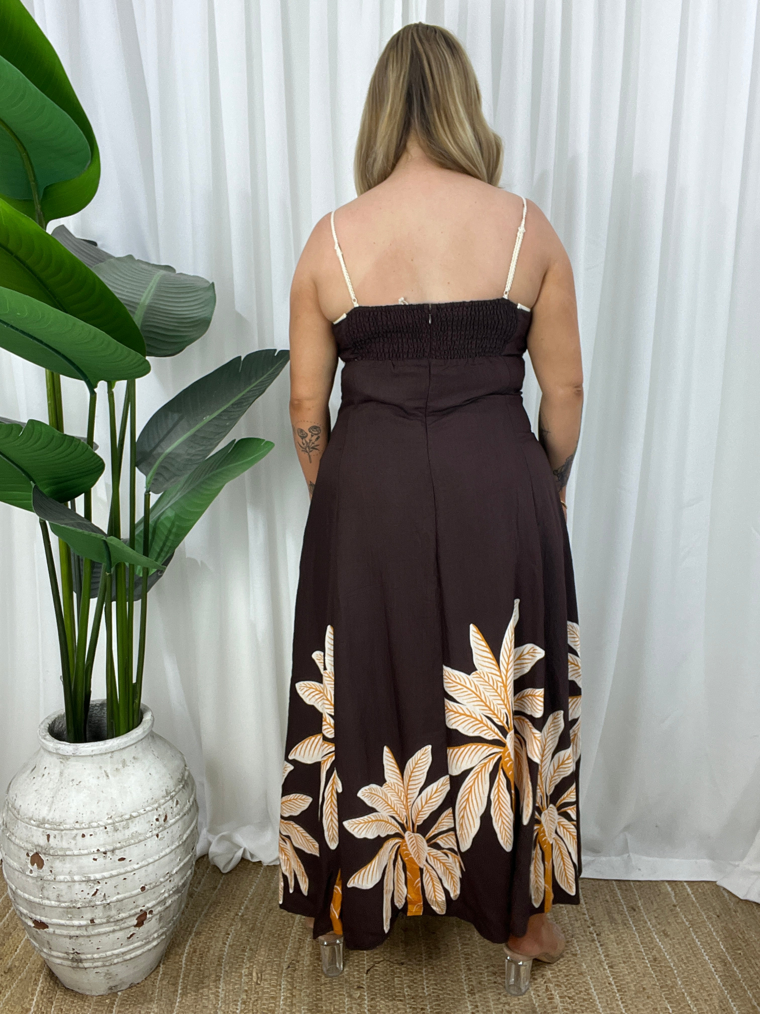 - Design : Maxi Length, fitted to body, A line cut. Lined. Shirred panel in upper back. Zip and hook & eye in upper rear. Peekaboo section at bust. Brown base with cream crochet trim and white & mustard palm print at bottom