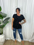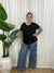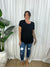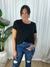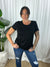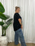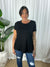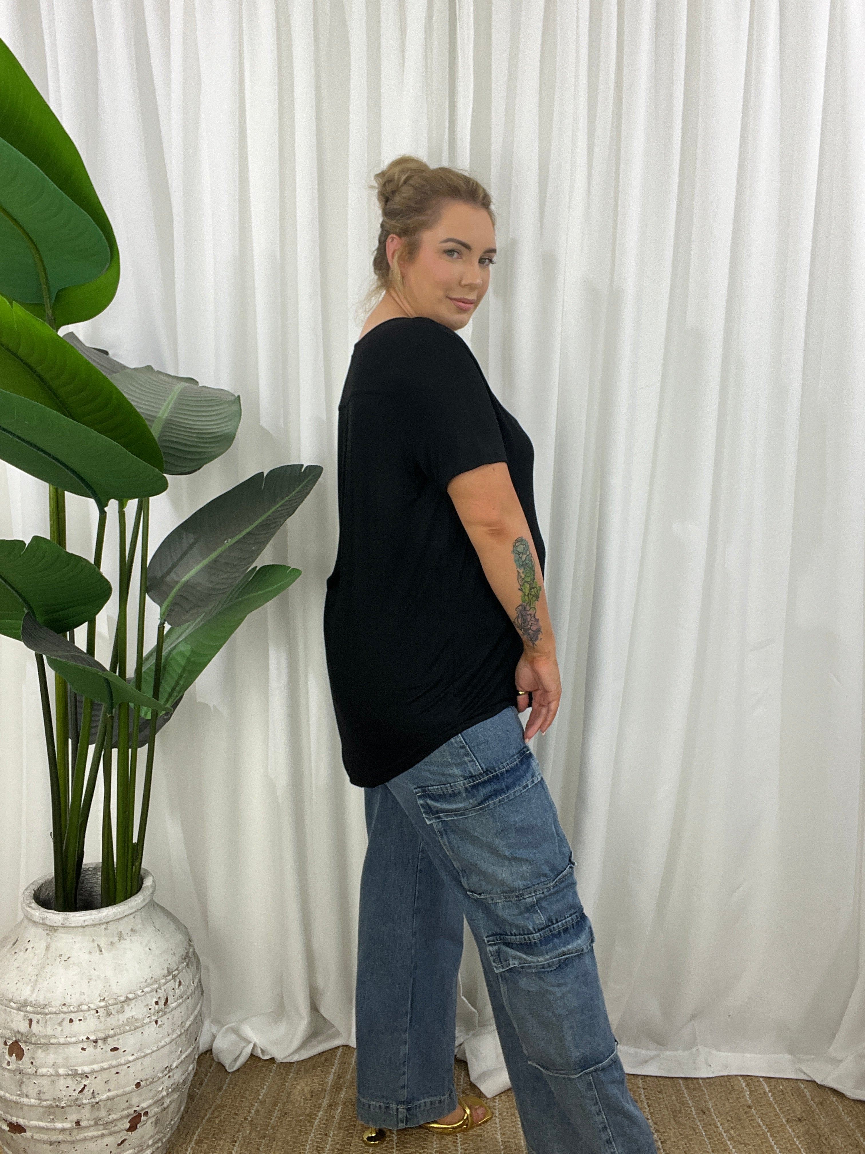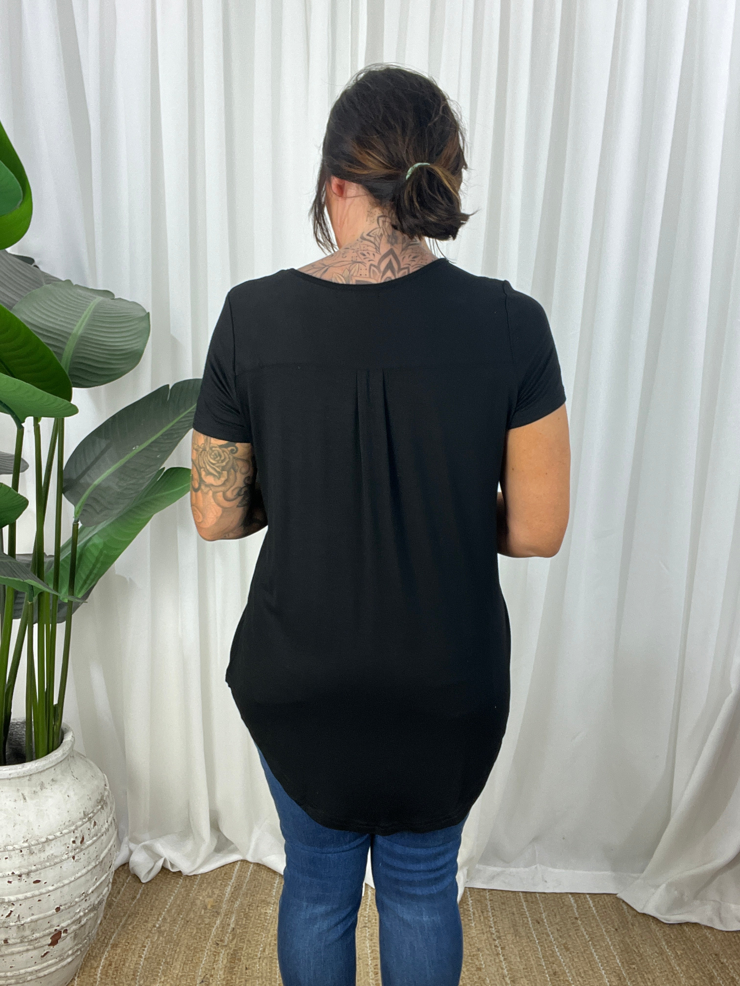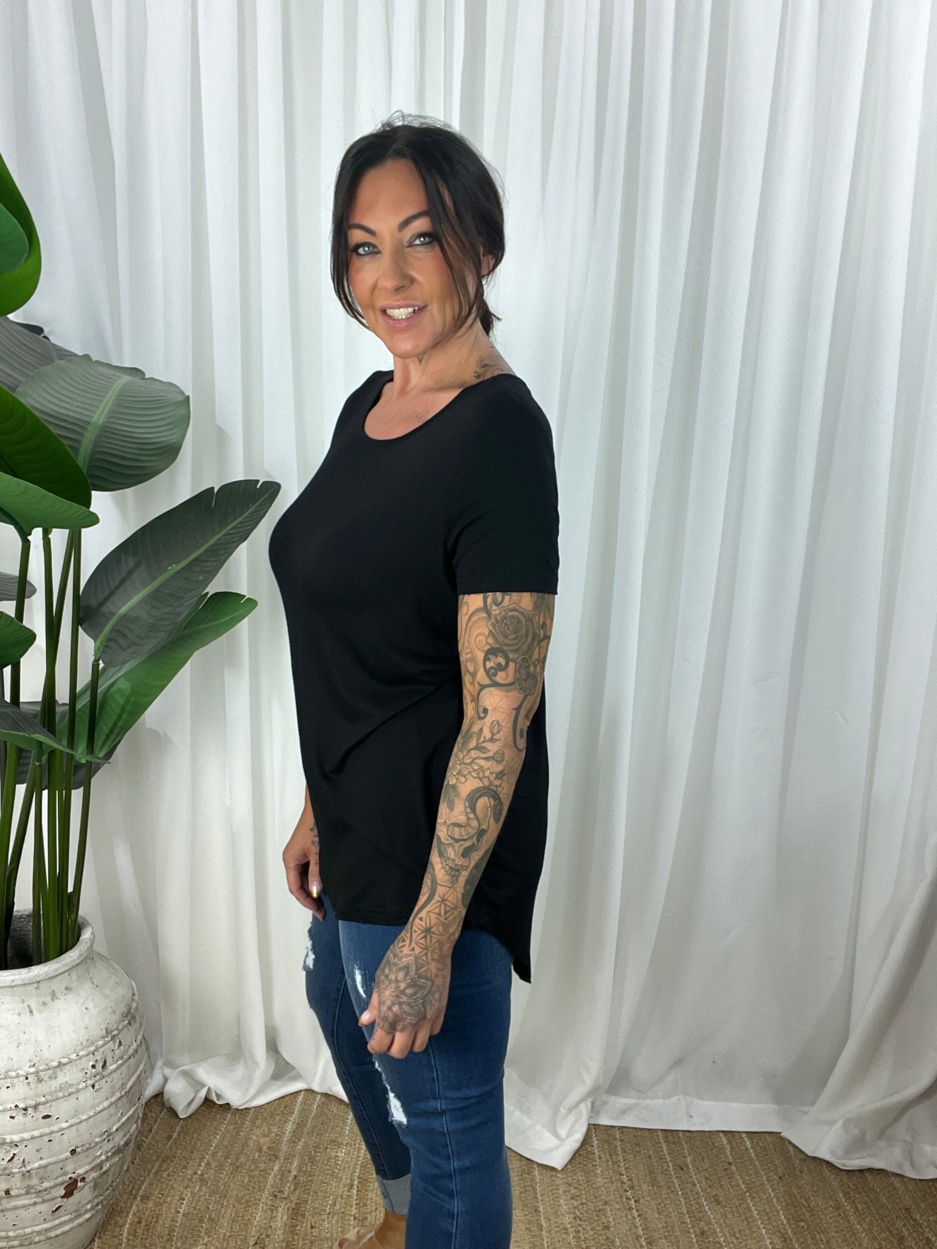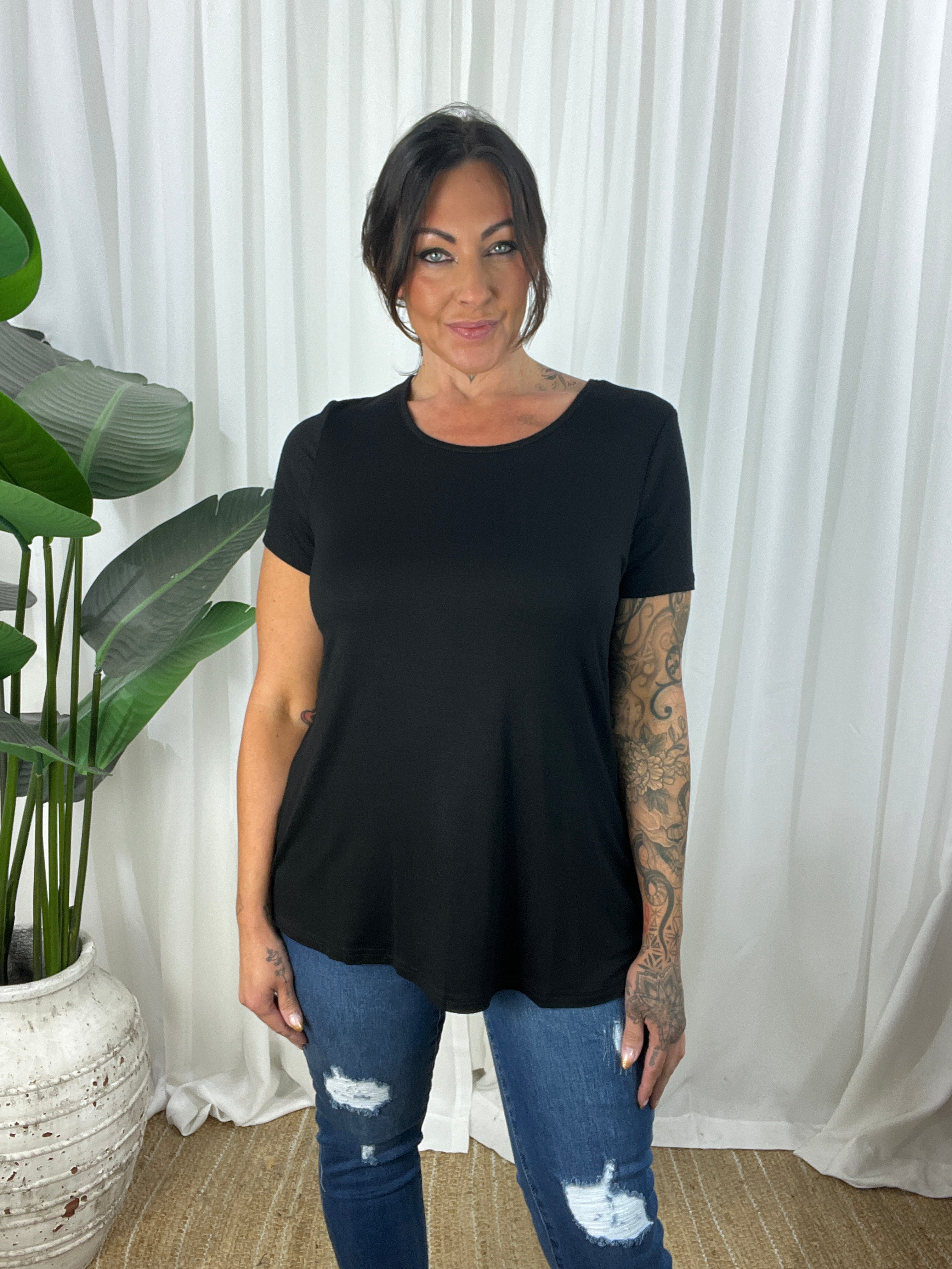 - Design: A classic high-low tee, stretchy and comfortable. Basic tee in black.