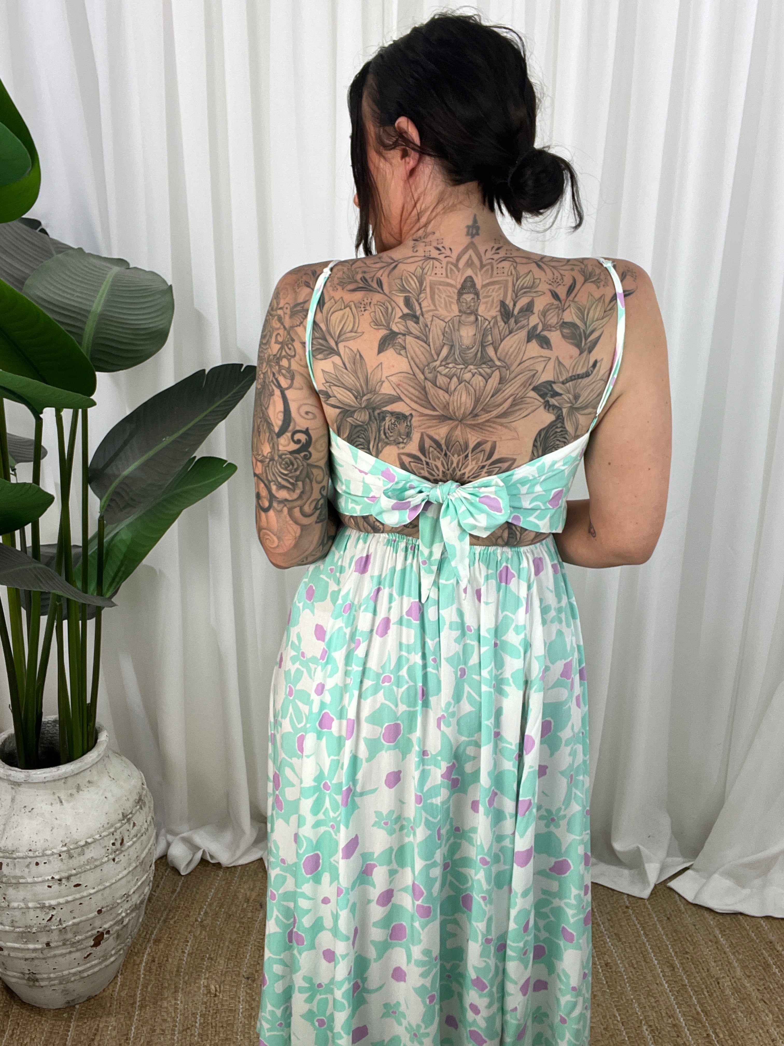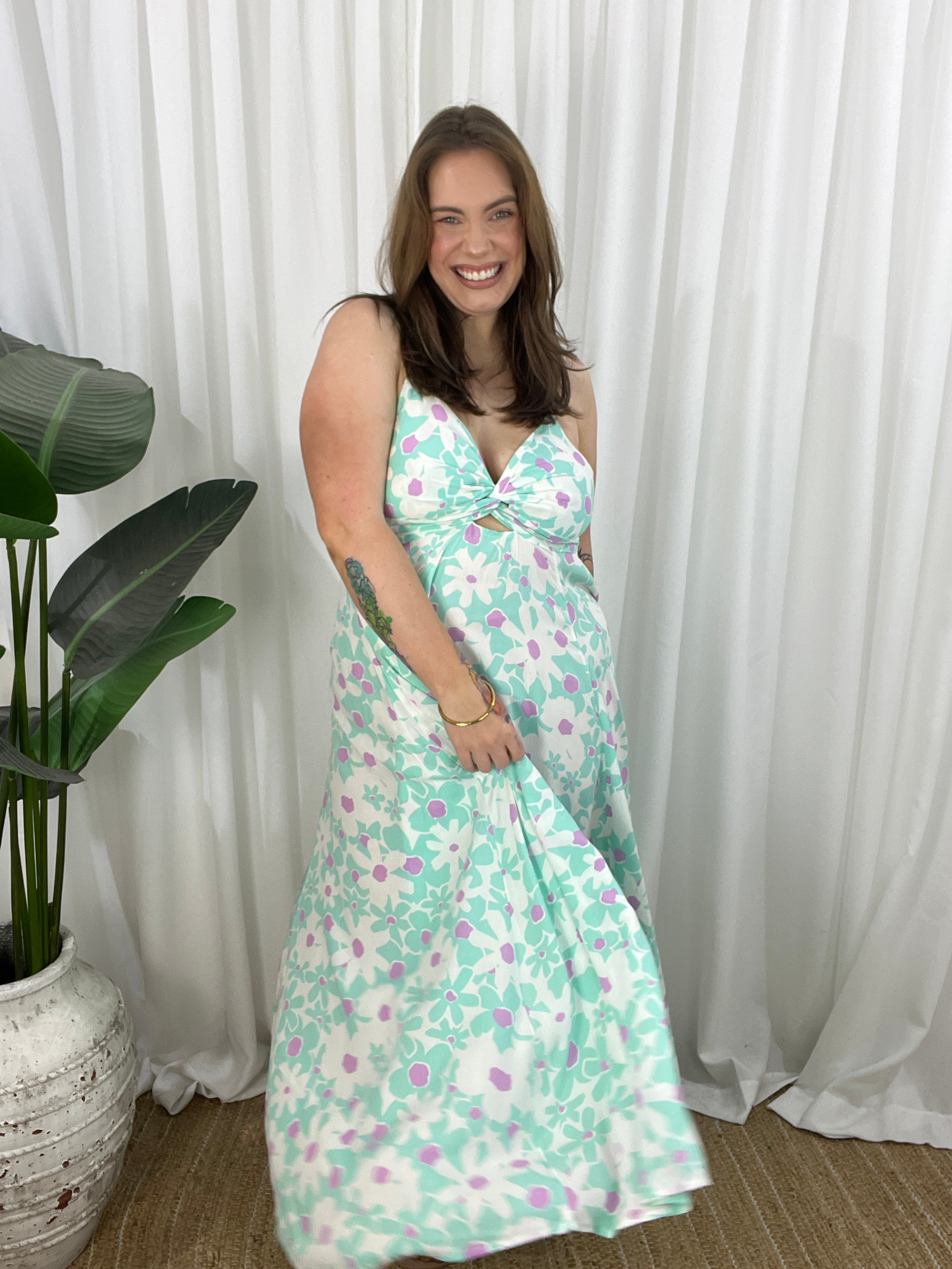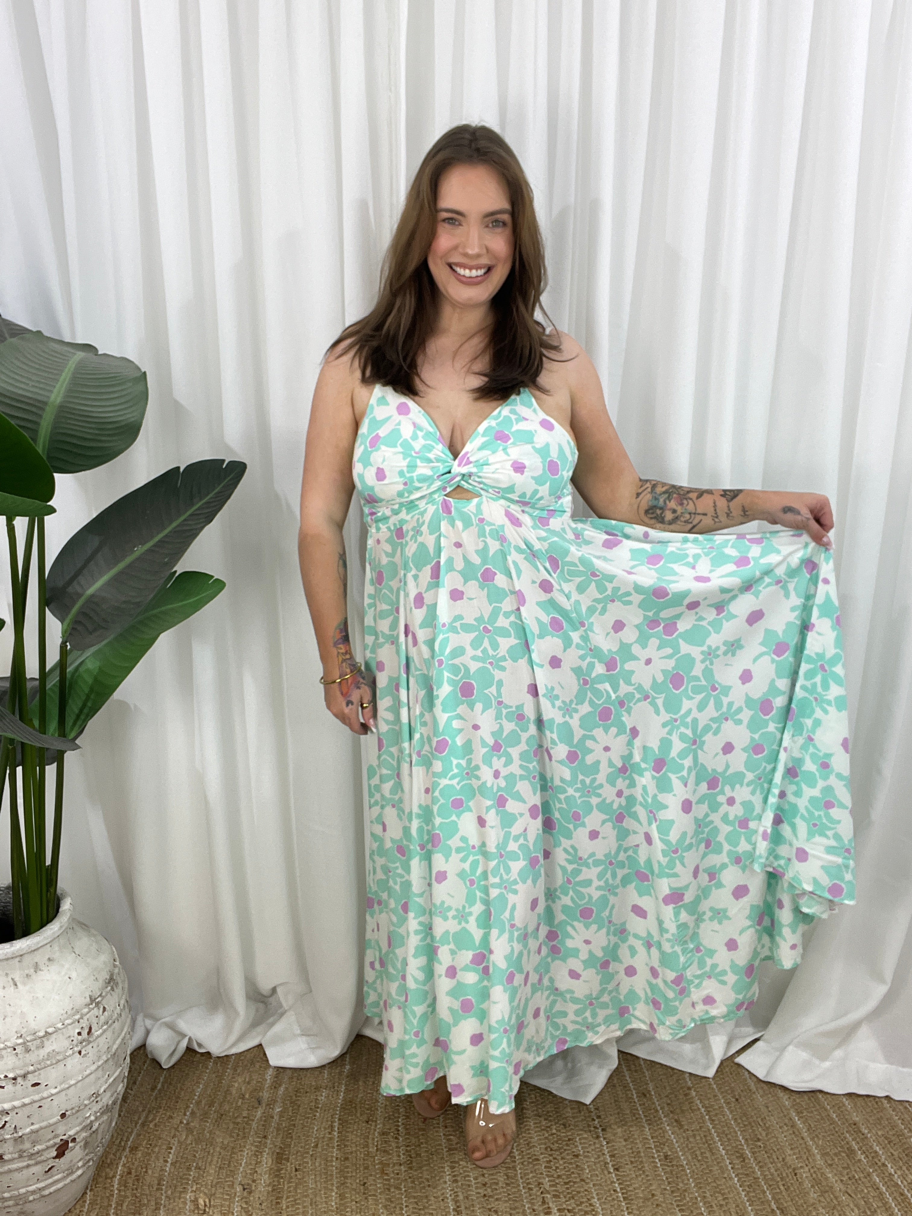 Flirty, flowy, and full of movement—the Gilly Dress is your go-to for statement style with a soft edge. This midi-to-maxi length beauty features a twisted peek-a-boo front bodice, adjustable straps, and a dramatic open back with tie detailing that adds just the right amount of allure.