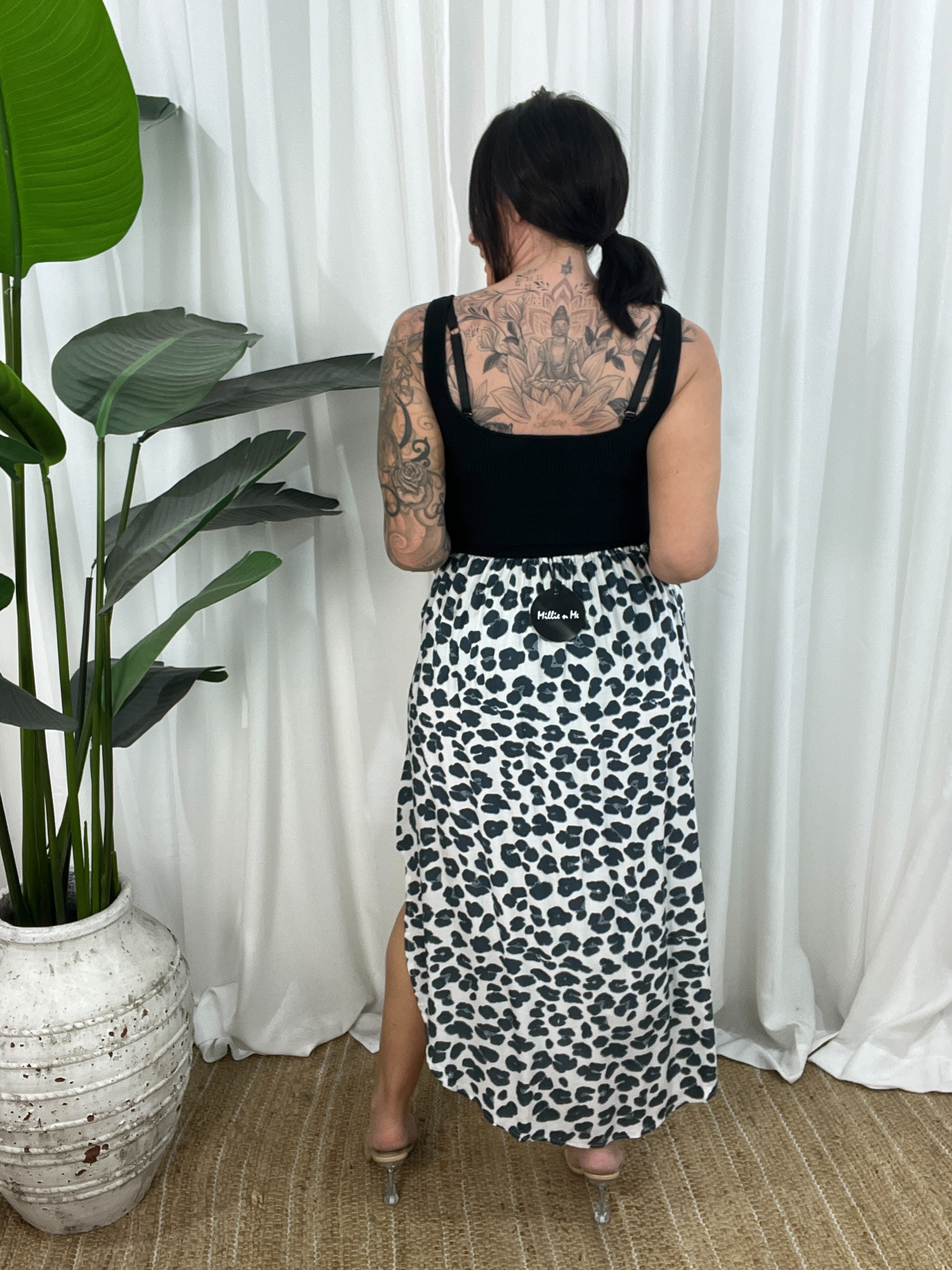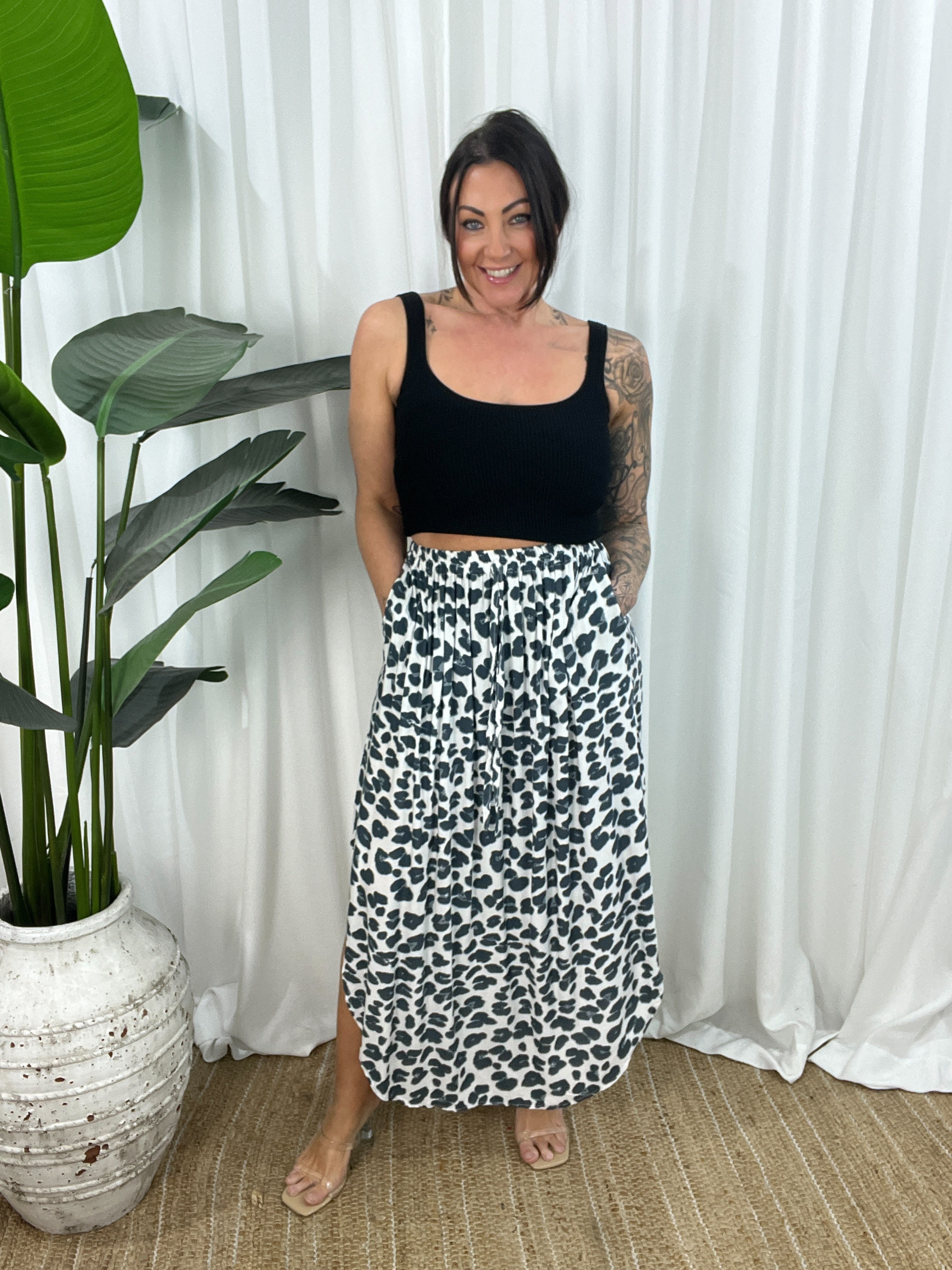 Our beautiful Grace Skirts are a straight cut scooped hem skirt with splits up each side. Light weight mid length and extremely comfortable. Oh and she has pockets. Grace looks stunning on and she comes in 4 colour ways Whirlte small leopard, grey large leopard, brown leopard and apricot leopard.