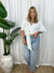 Add a touch of charm to your wardrobe with our Hammy Top, a cute and versatile piece perfect for any occasion. This tie top features cap sleeves with a slight flutter, adding a delicate and feminine touch to your look. The neckline is adorned with a delicate scalloped trim that extends to the end of the tie, creating a beautiful and intricate detail. Two buttons at the bust complete the look, adding a hint of sophistication.