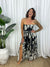 - Design: Strapless Jumpsuit, boned in the bust. zip in rear with hook and eye. Empire waist with material tie belt. Wide leg with knee high splits in front. Black base with cream ornamental floral pattern.