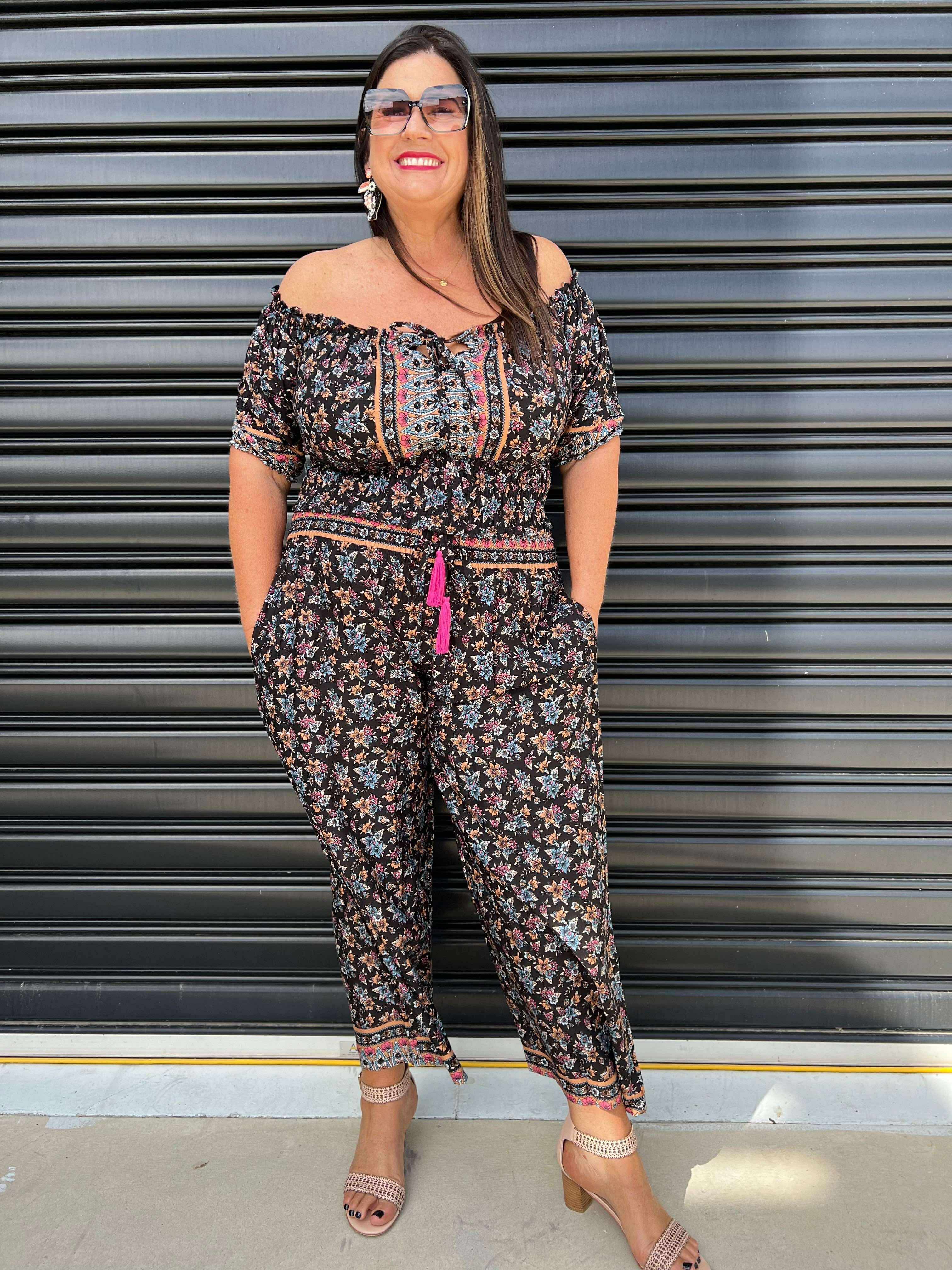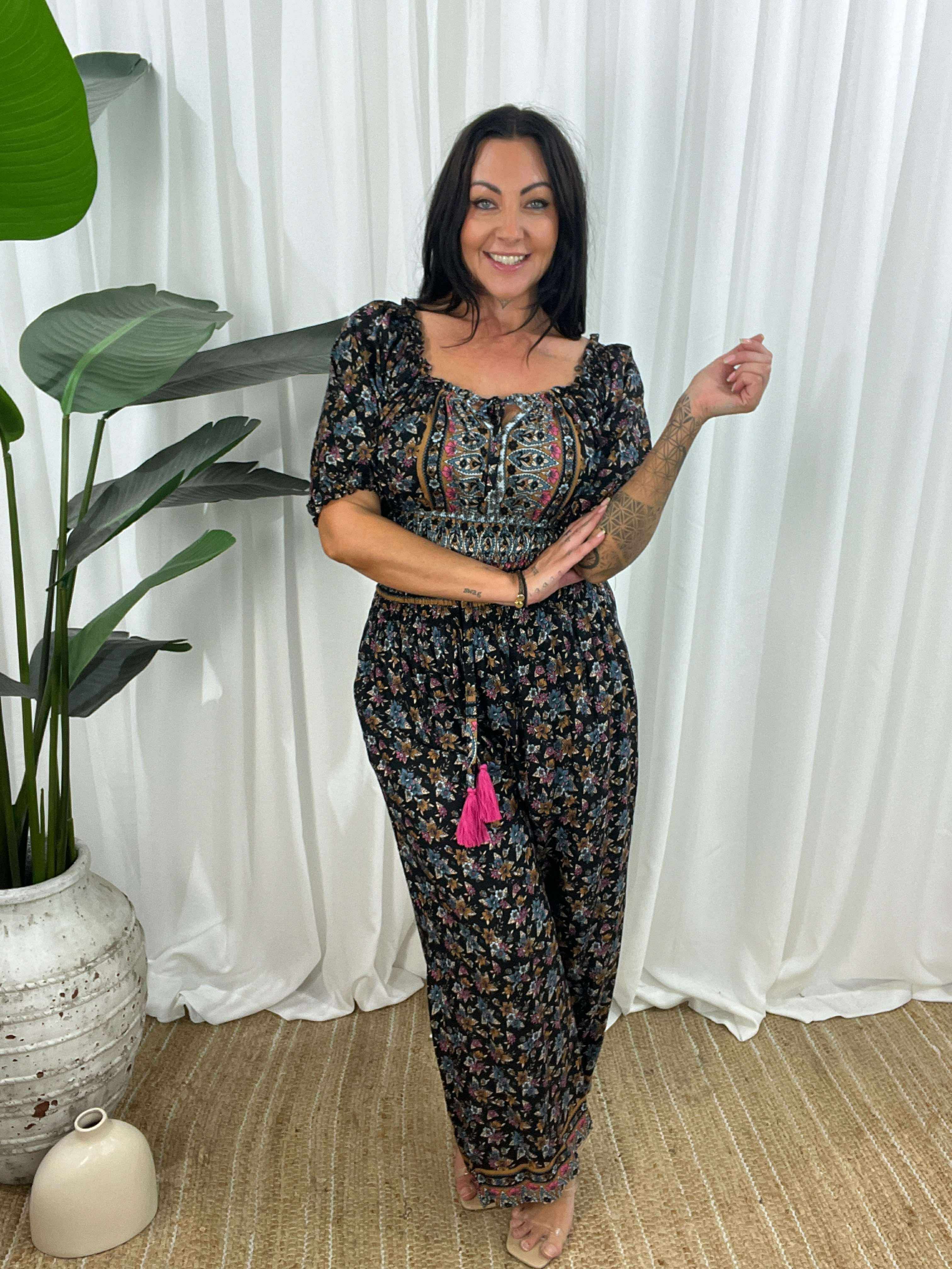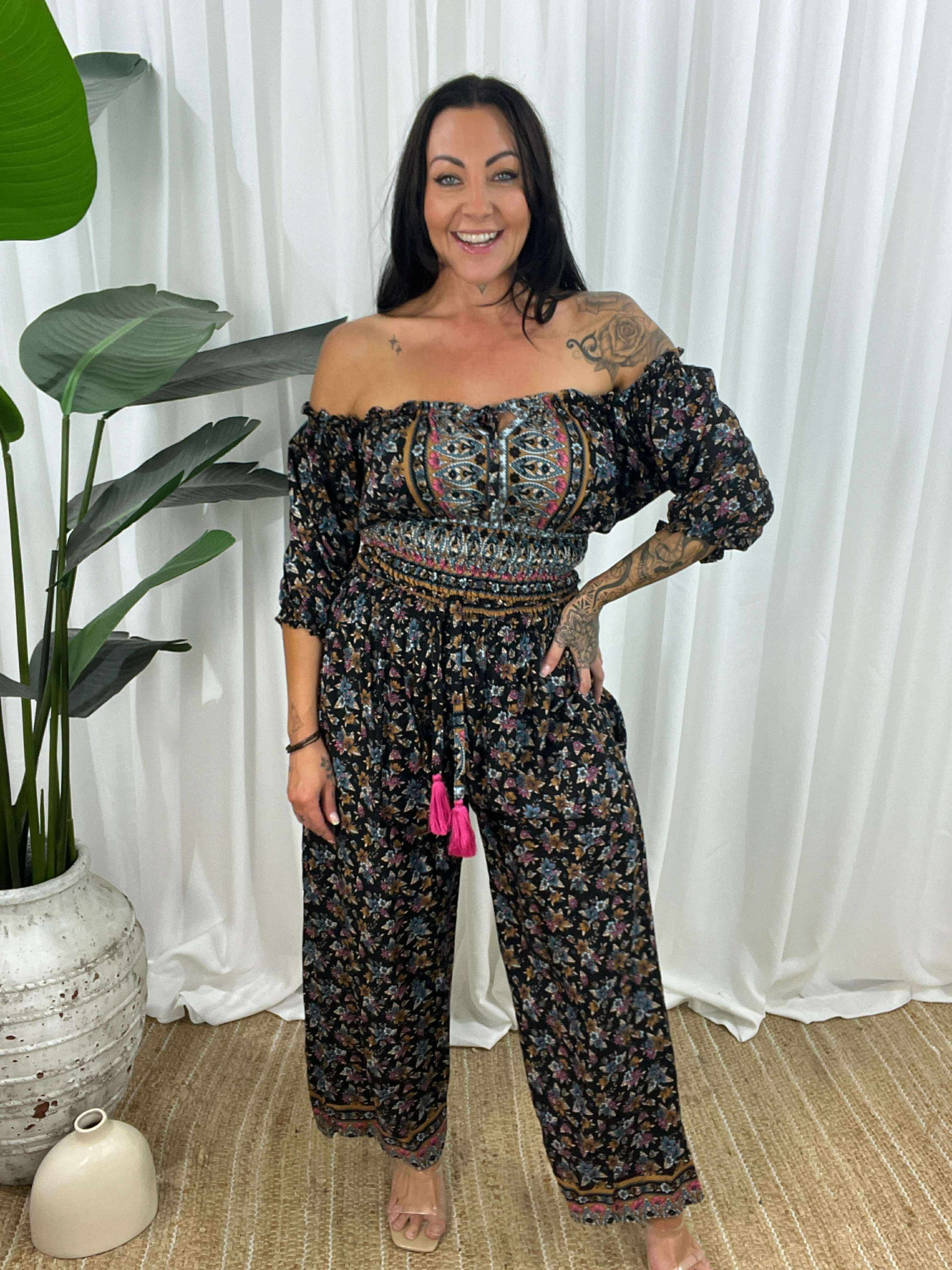 Our Stunning Jeanie Set features a beautiful boho Pants and top set , a wide leg pant with faux tie and tassels, the cute mid length sleeve top is shirred in the body and cropped to perfection, she is designed to wear off the shoulder or on making it the perfect outfit for everyday or special occasions.