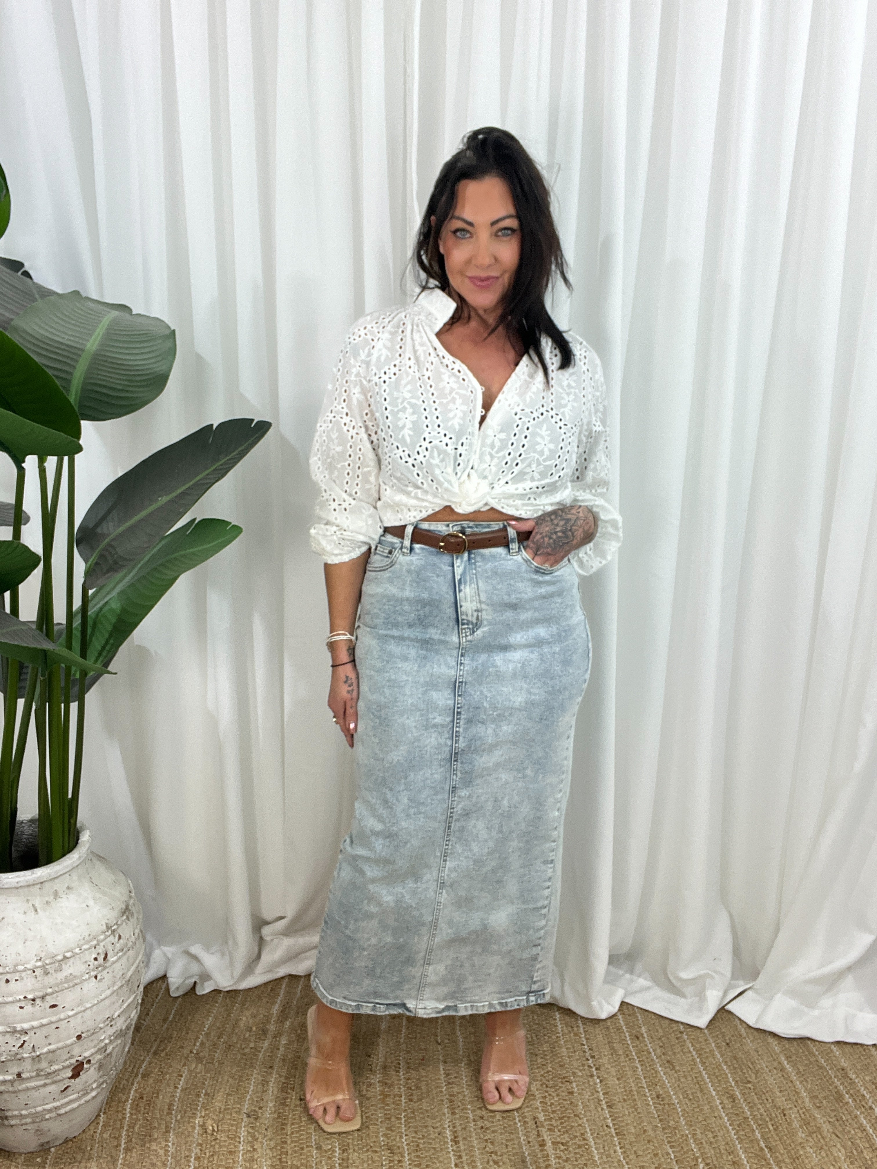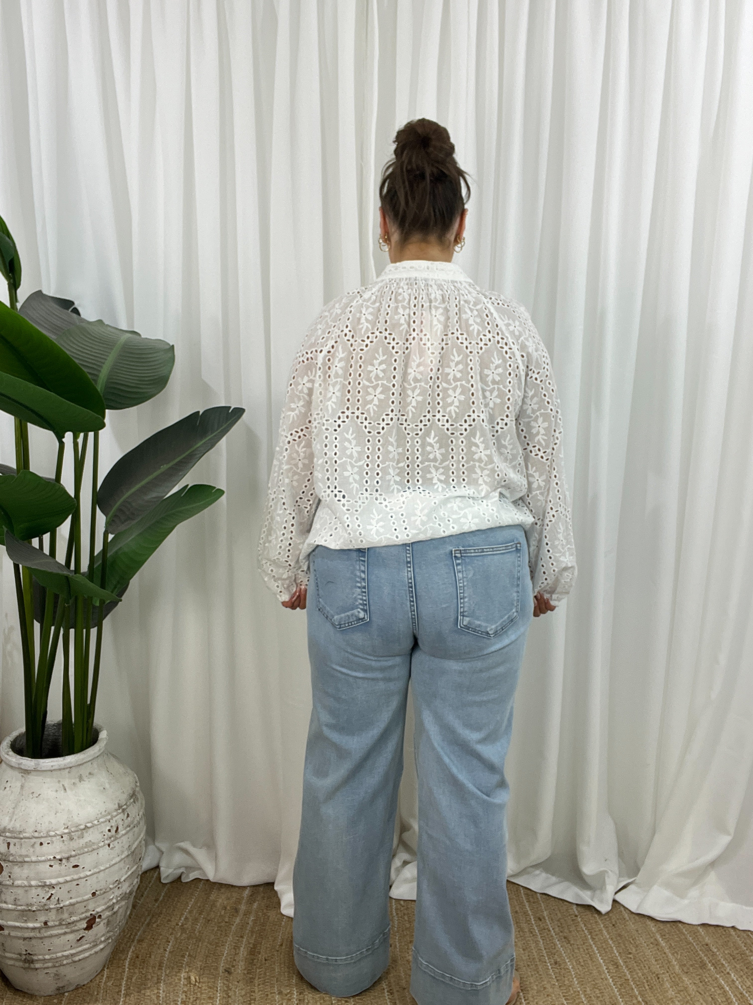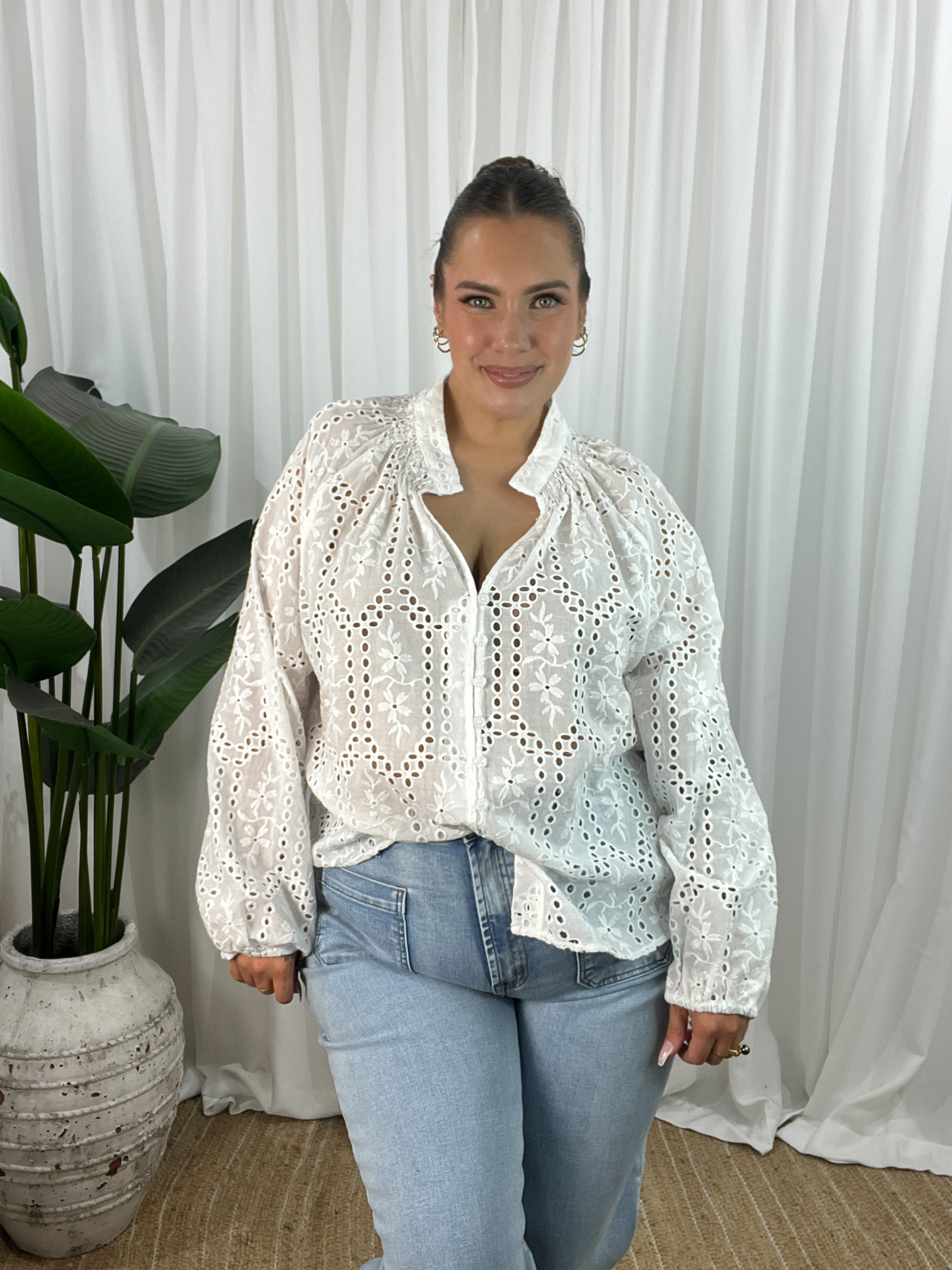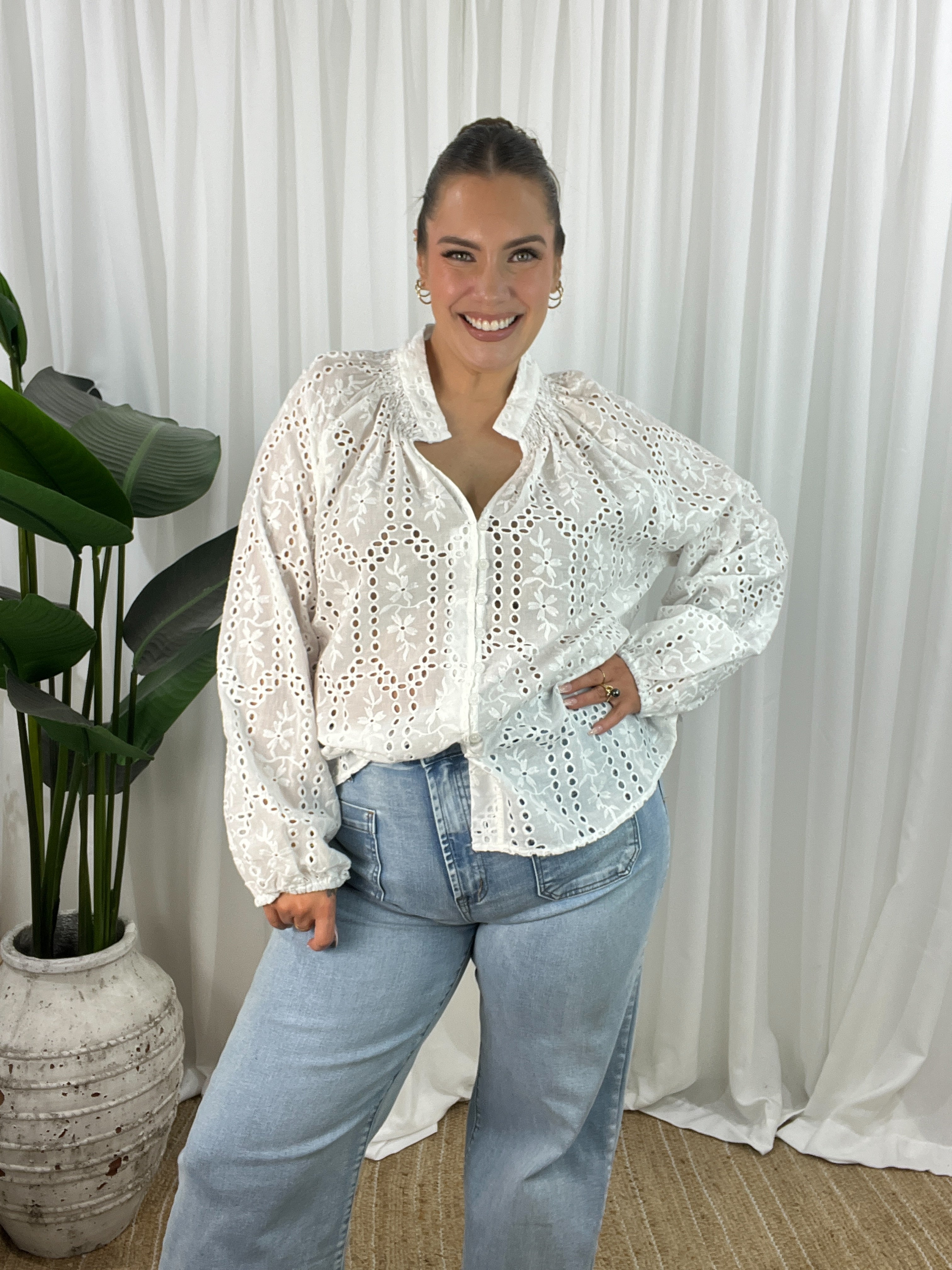 Boho, bold, and totally breathtaking, the Jonah Shirt is your new statement staple. Crafted in peek-a-boo broderie anglaise, this button-up beauty features a soft V-neckline, Mandarin collar, and intricate detailing that’s guaranteed to turn heads.