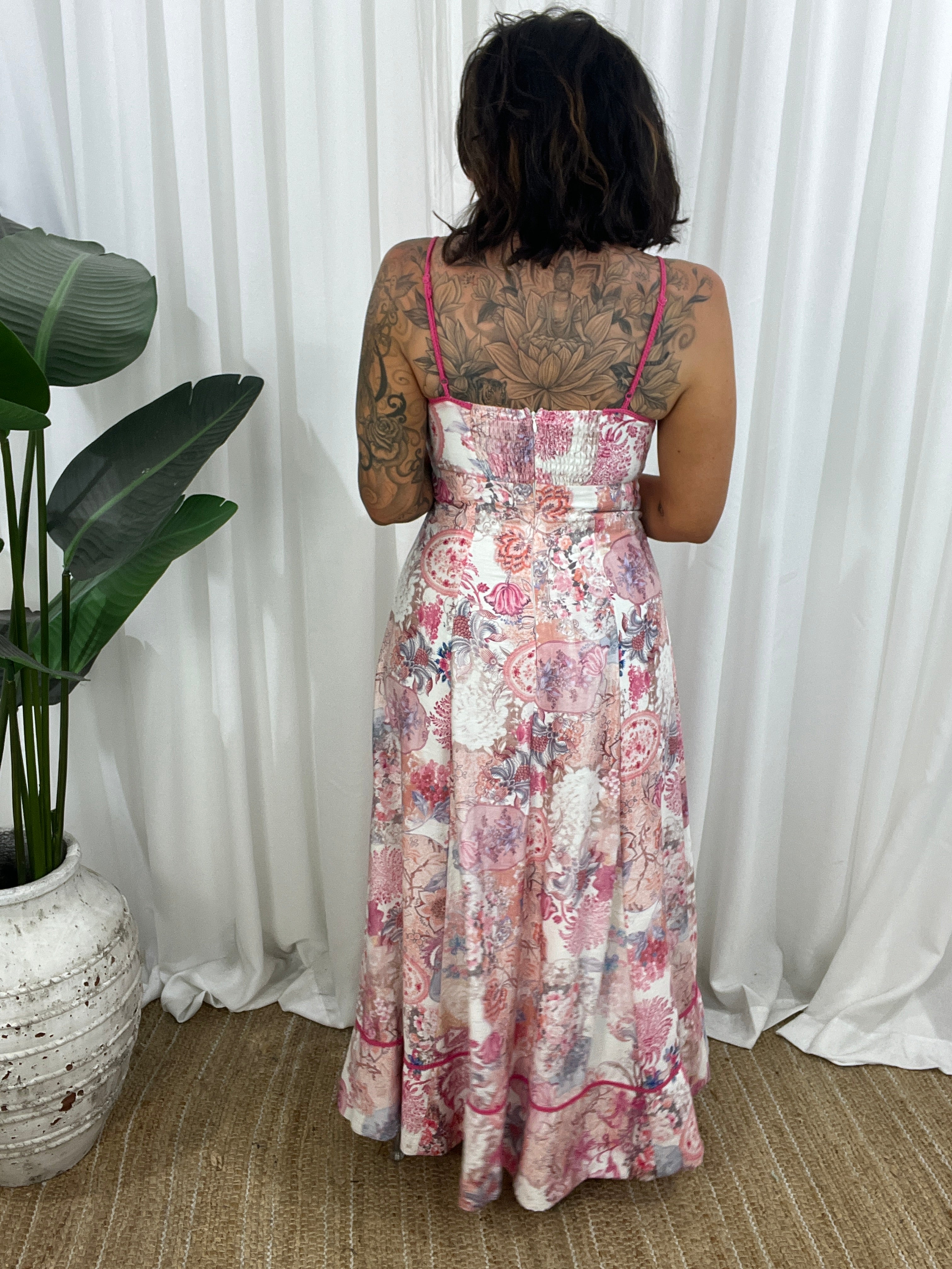 - Design : Maxi Length, fitted to body, A line cut. Lined. Shirred panel in upper back. Zip in upper rear. Peekaboo section at bust