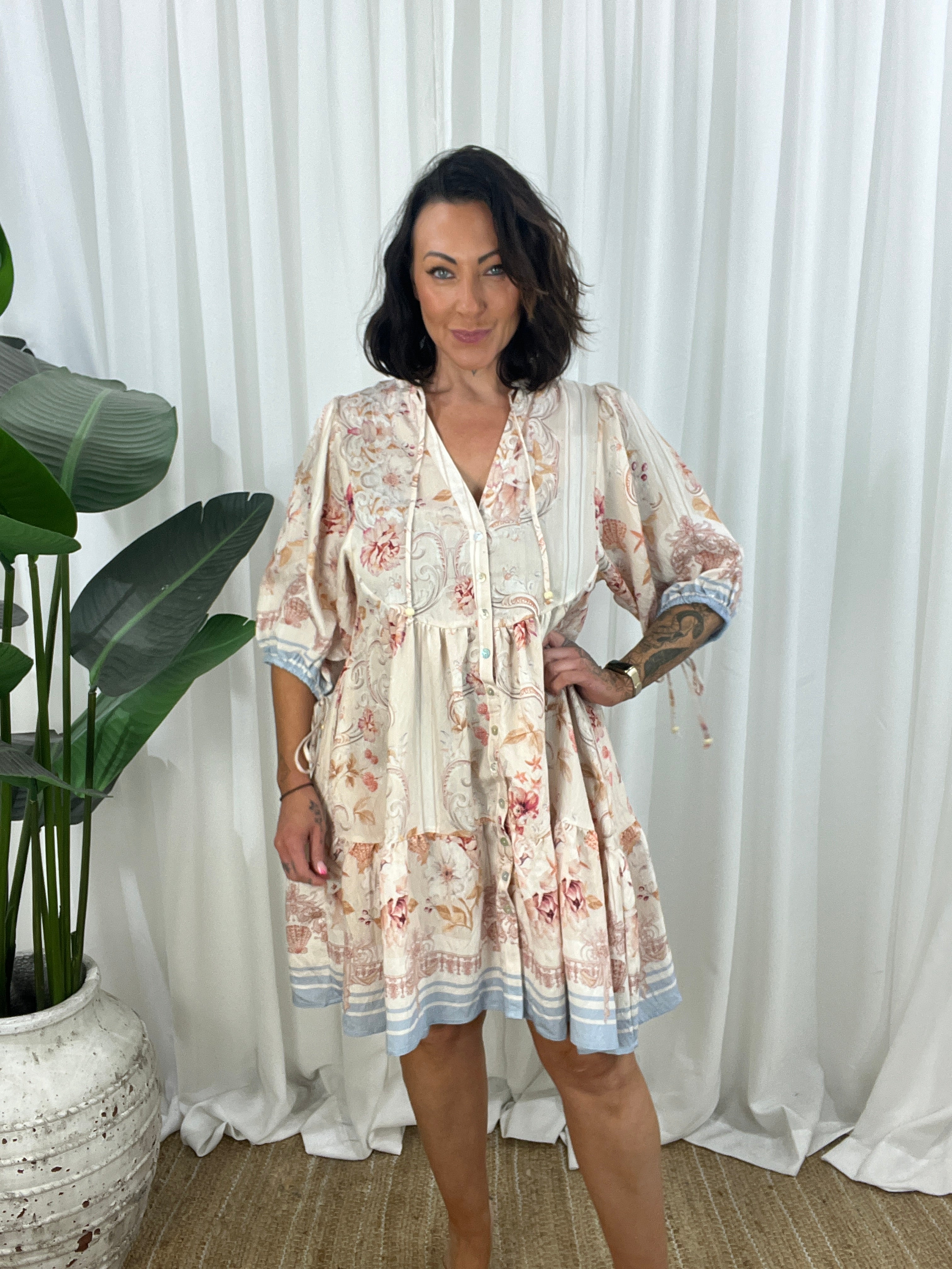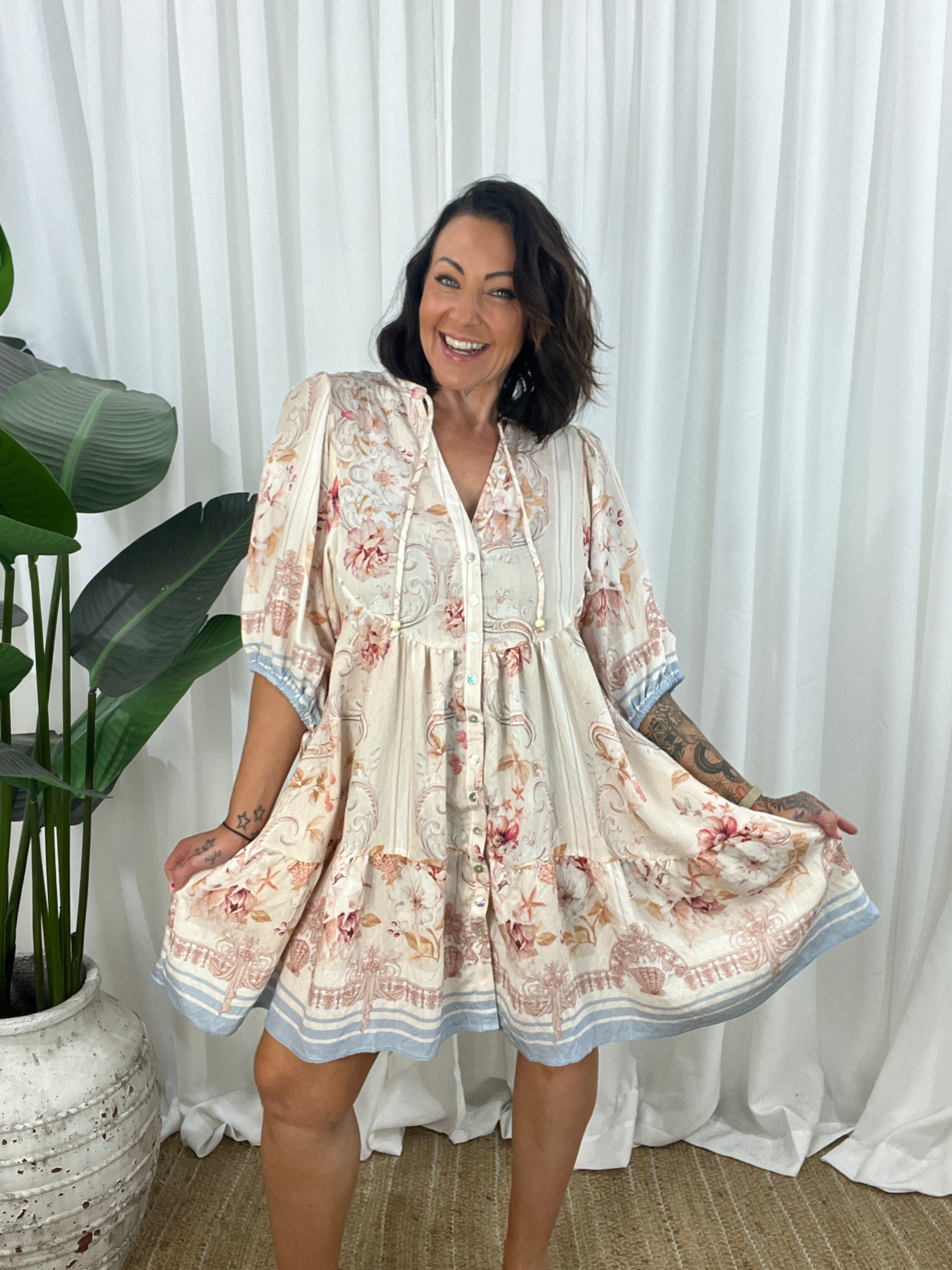 - Design: Babydoll style, knee length, button down, soft vintage pattern