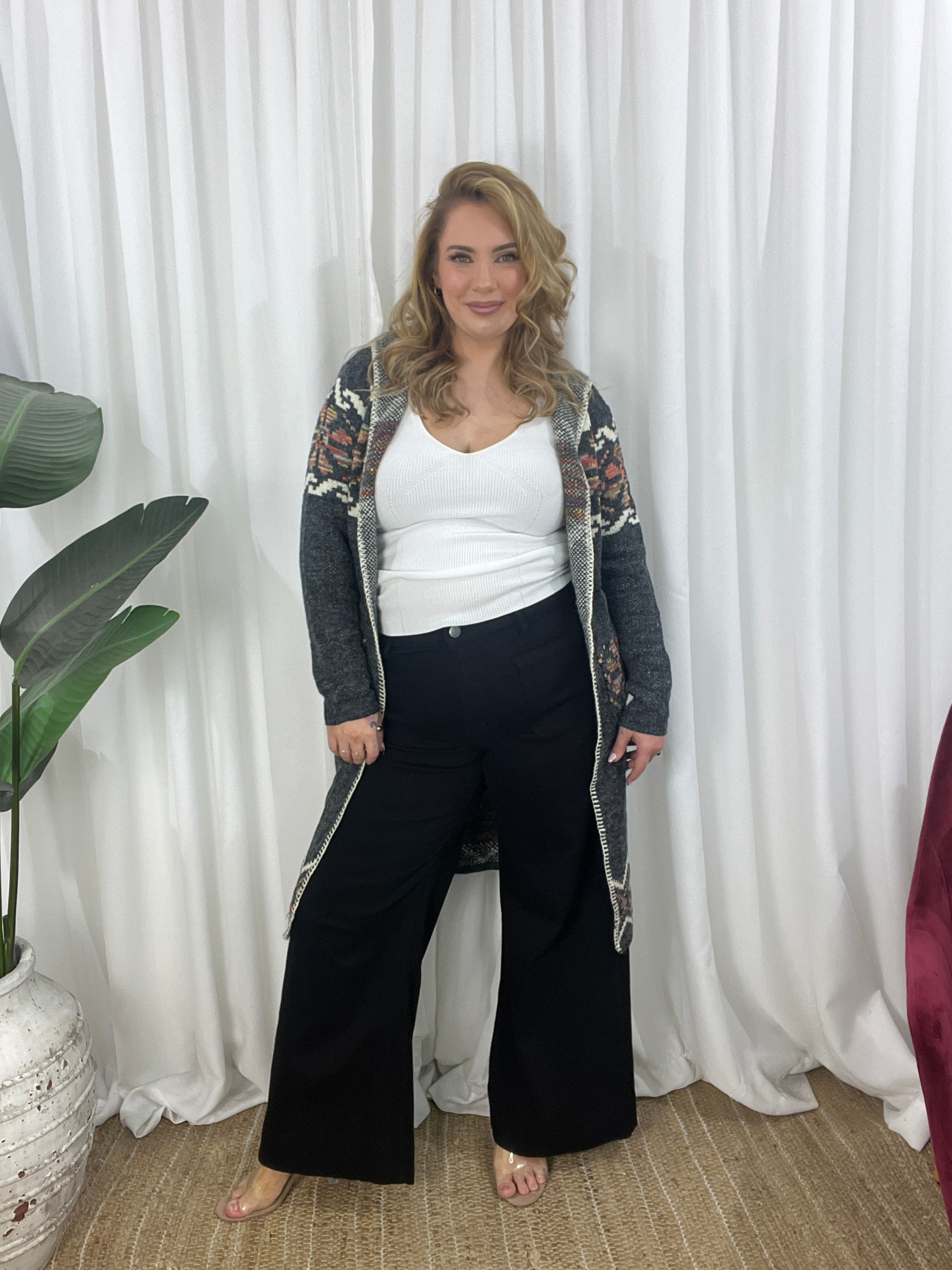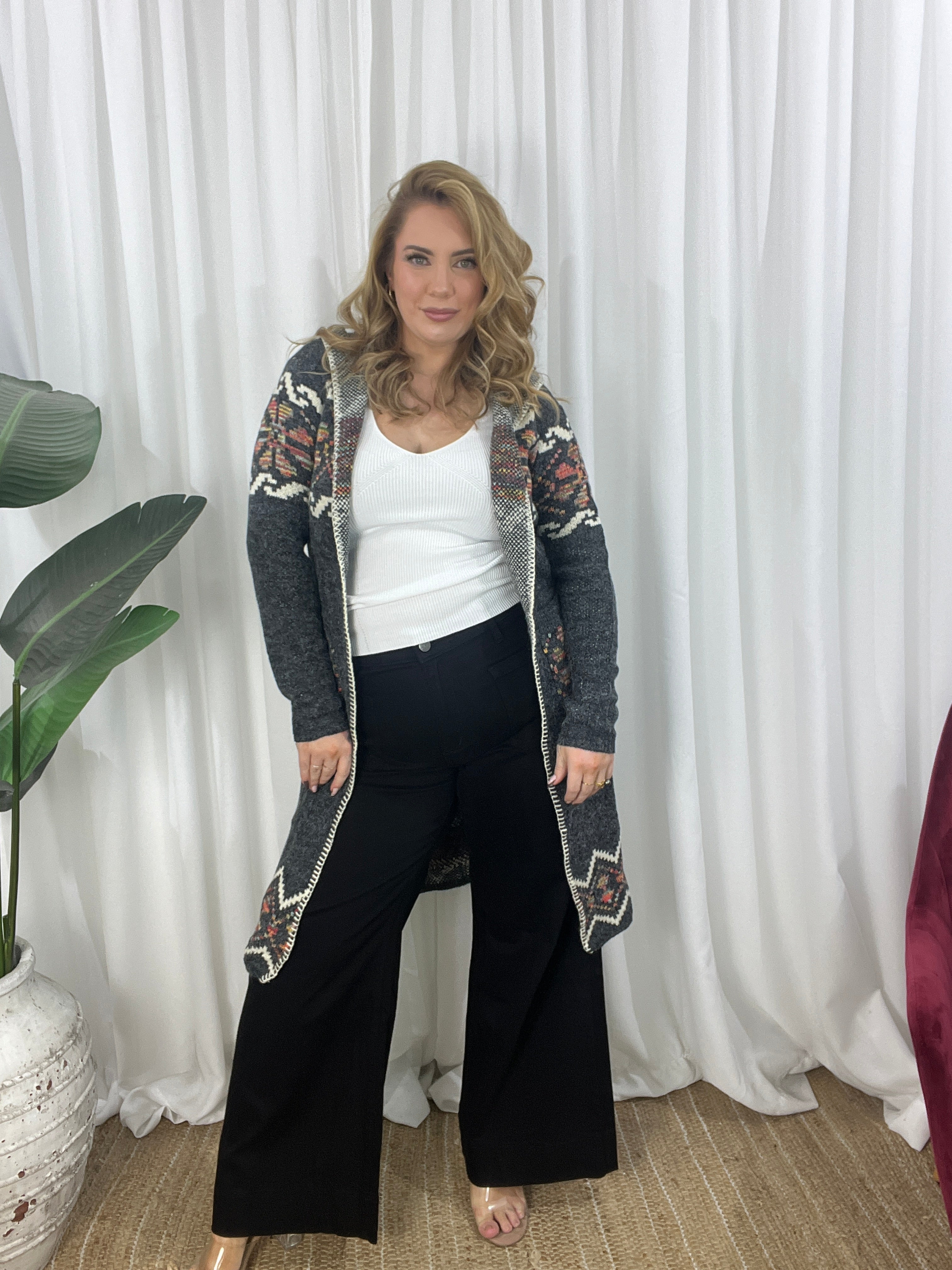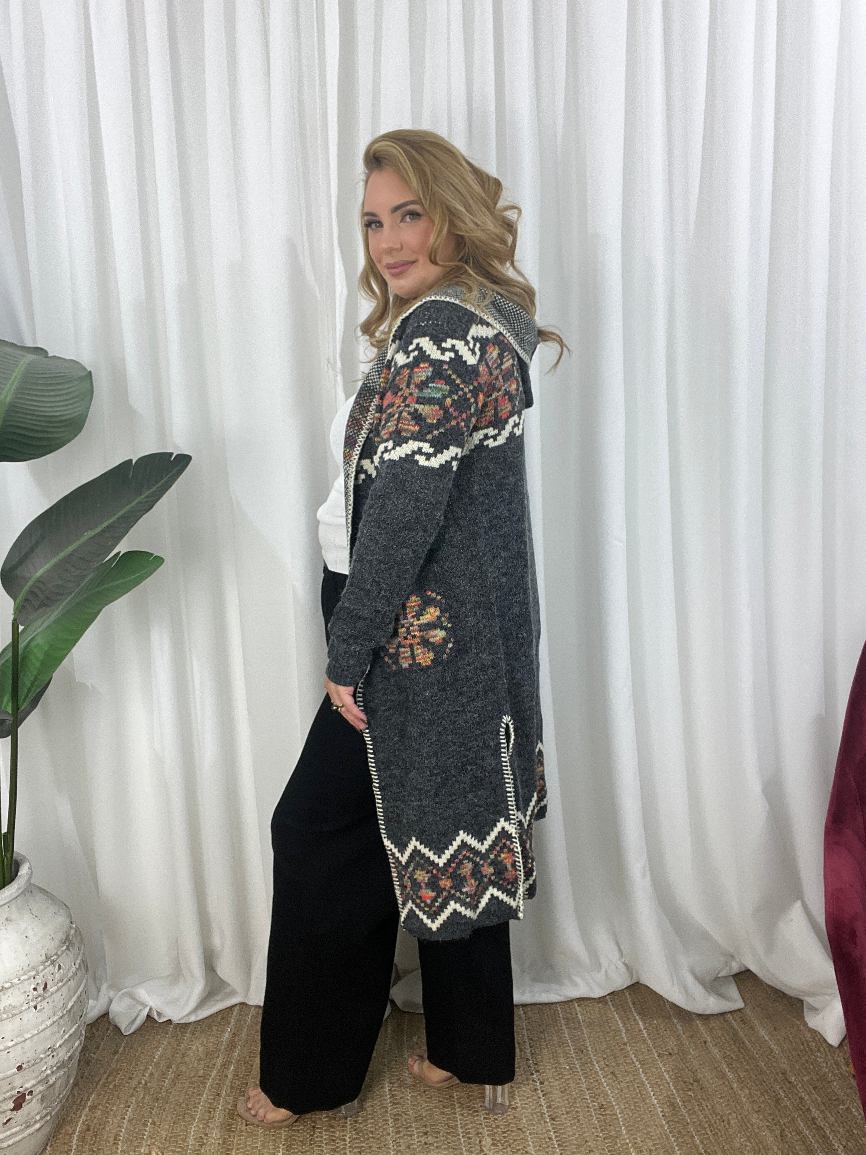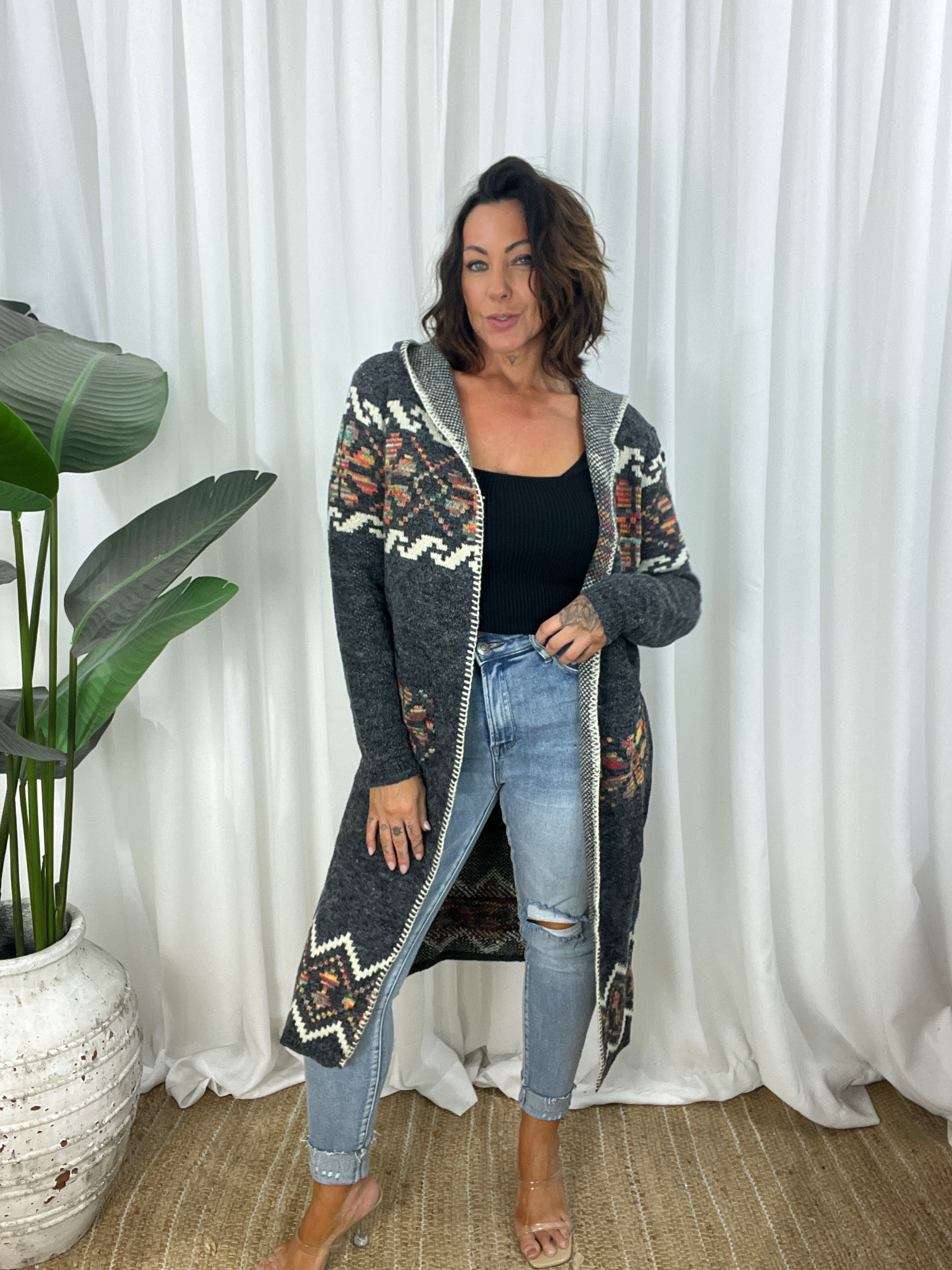- Design : Relaxed cut, stretchy lightweight open woven knit cardi. whipstitch style trim detailing along front edge. splits in sides. Mid calf length. Front pockets. Gorgeous charcoal palette with a few colours and cream in a south western pattern.