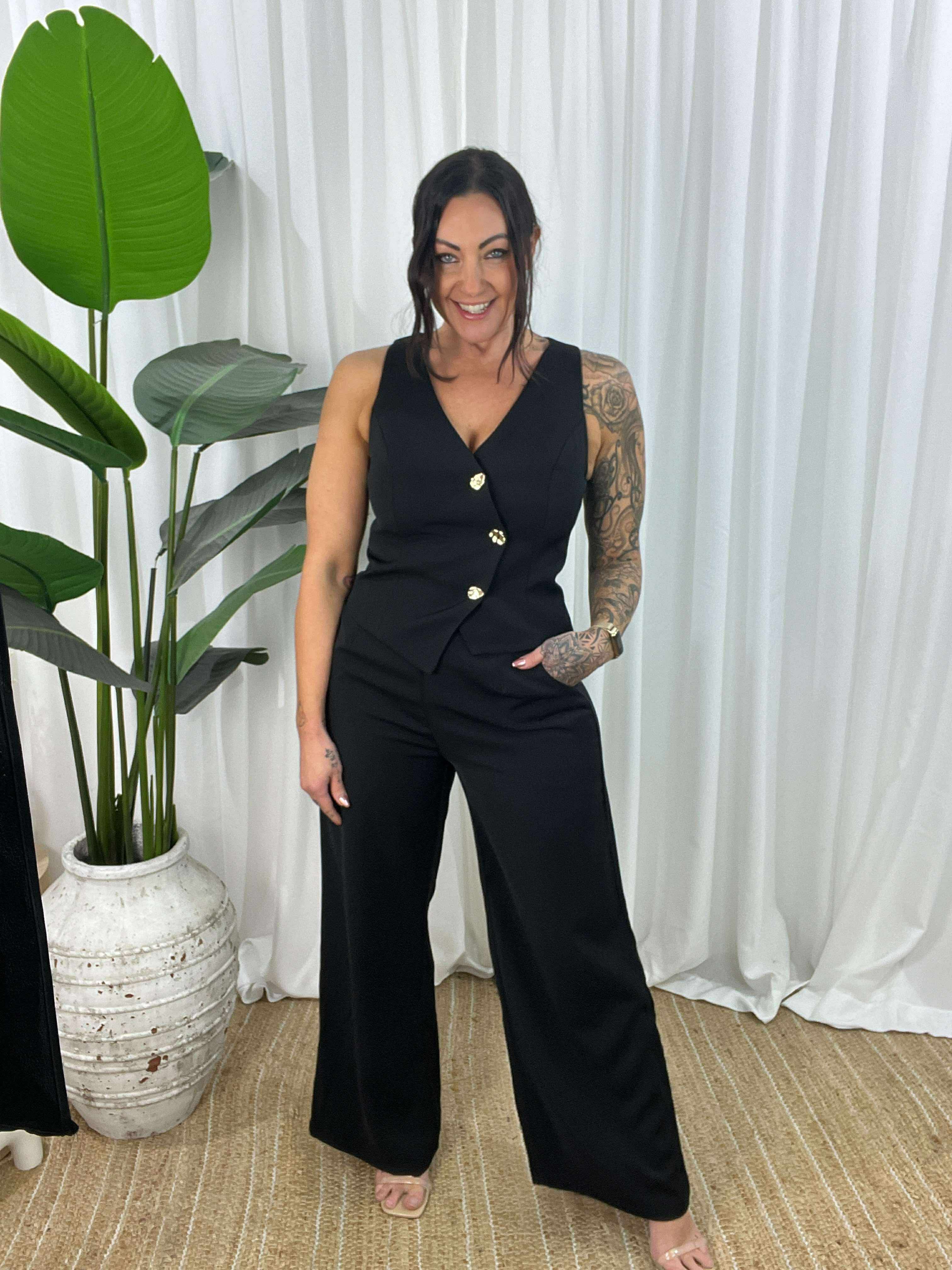 The lined vest is finished with gold buttons and a sleek silhouette, while the semi-wide leg pants offer a modern drape with a side zip, small elastic panel at the back, and functional pockets for ease and versatility.
